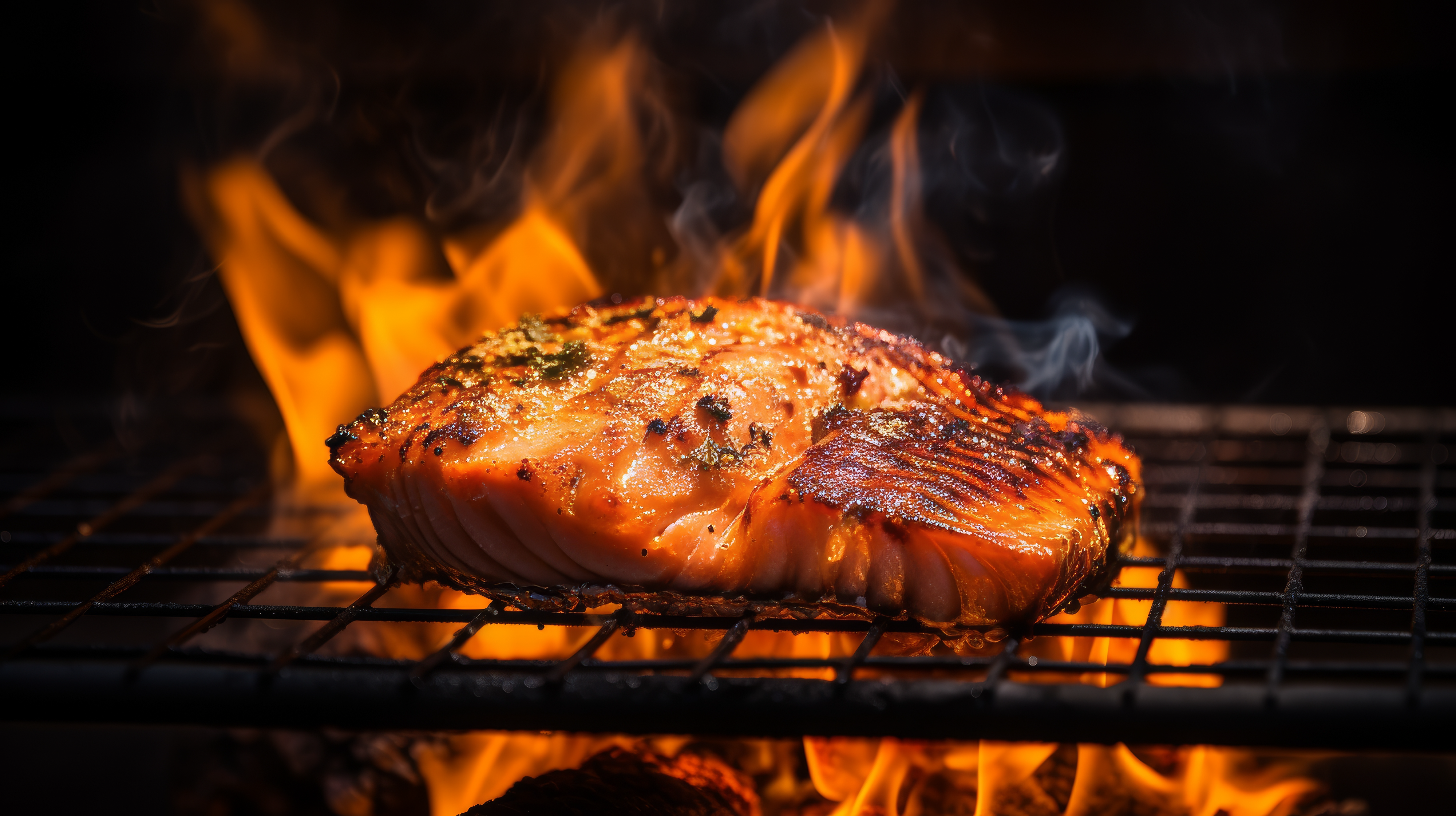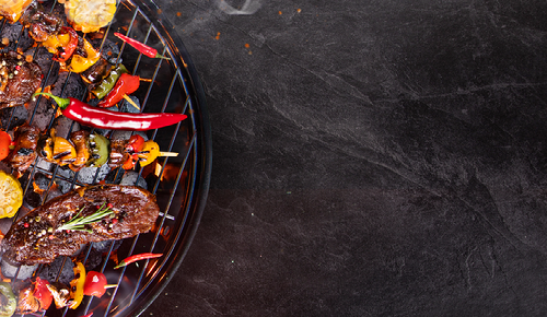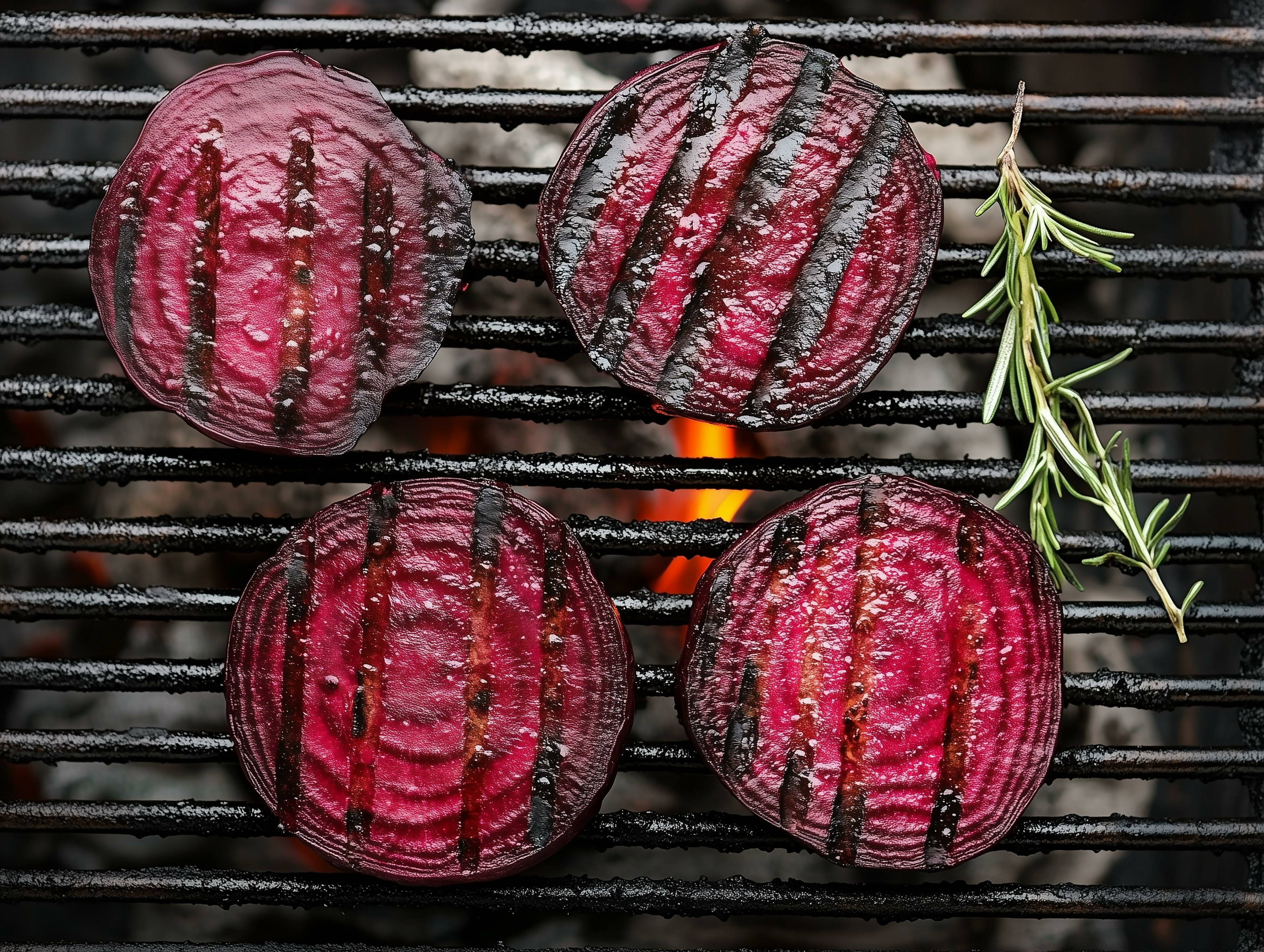 Created with images by • Lukas Gojda - Barbecue garden grill with beef steaks, close-up. • CommonFeeder - Grilled Beetroot Slices on a Smoky BBQ Grill, Perfect for Healthy Eating Promotions, Summer Picnic Menus, or Plant-Based Recipe Features • sorin - Delicious grilled salmon steak sizzling over charcoal flames for a flavorful cooking experience • red_orange_stock - Juicy grilled chicken thighs with herbs on a flaming barbecue grill, capturing the essence of summer grilling.