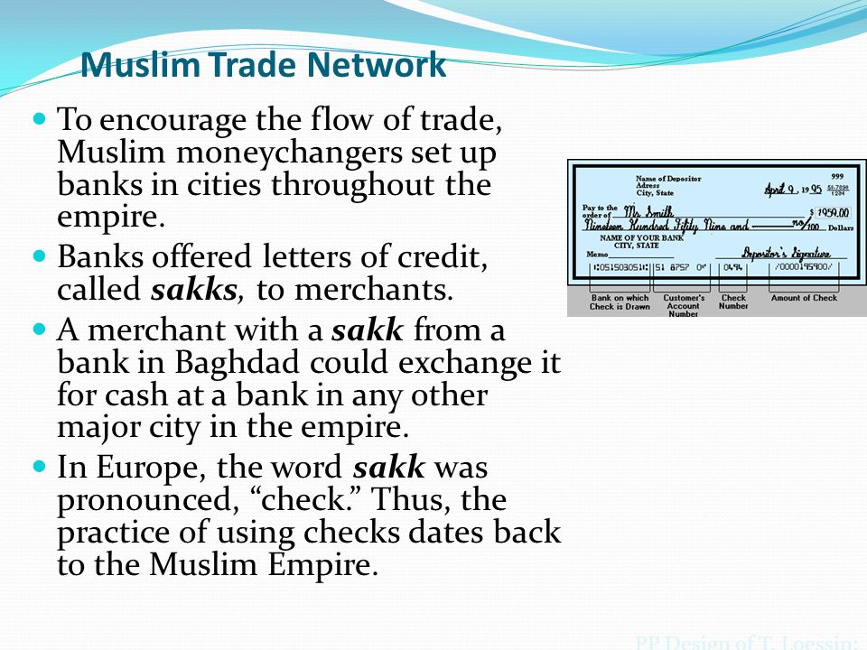 - Honored letters of credit known as sakks (modern day checks)