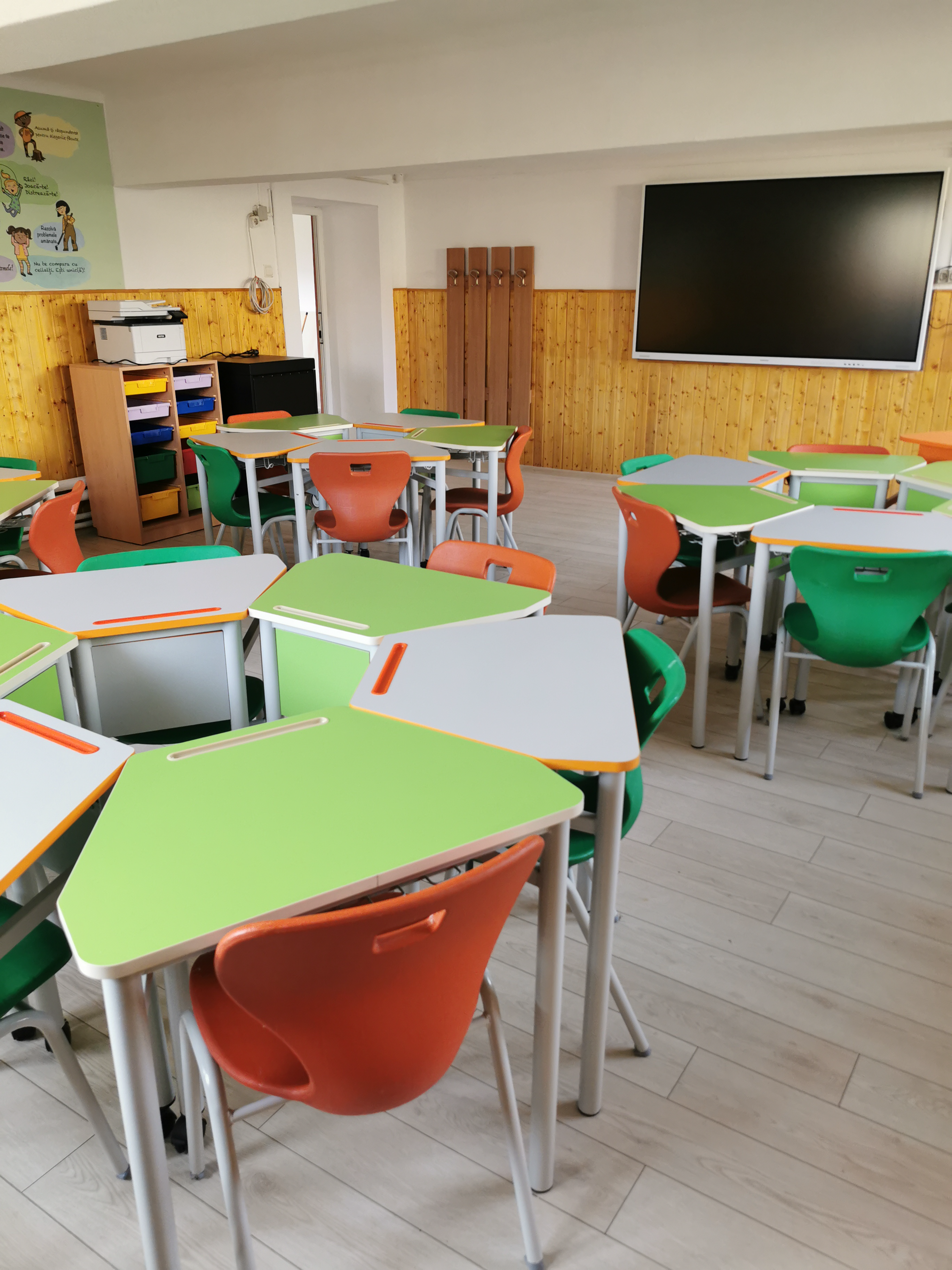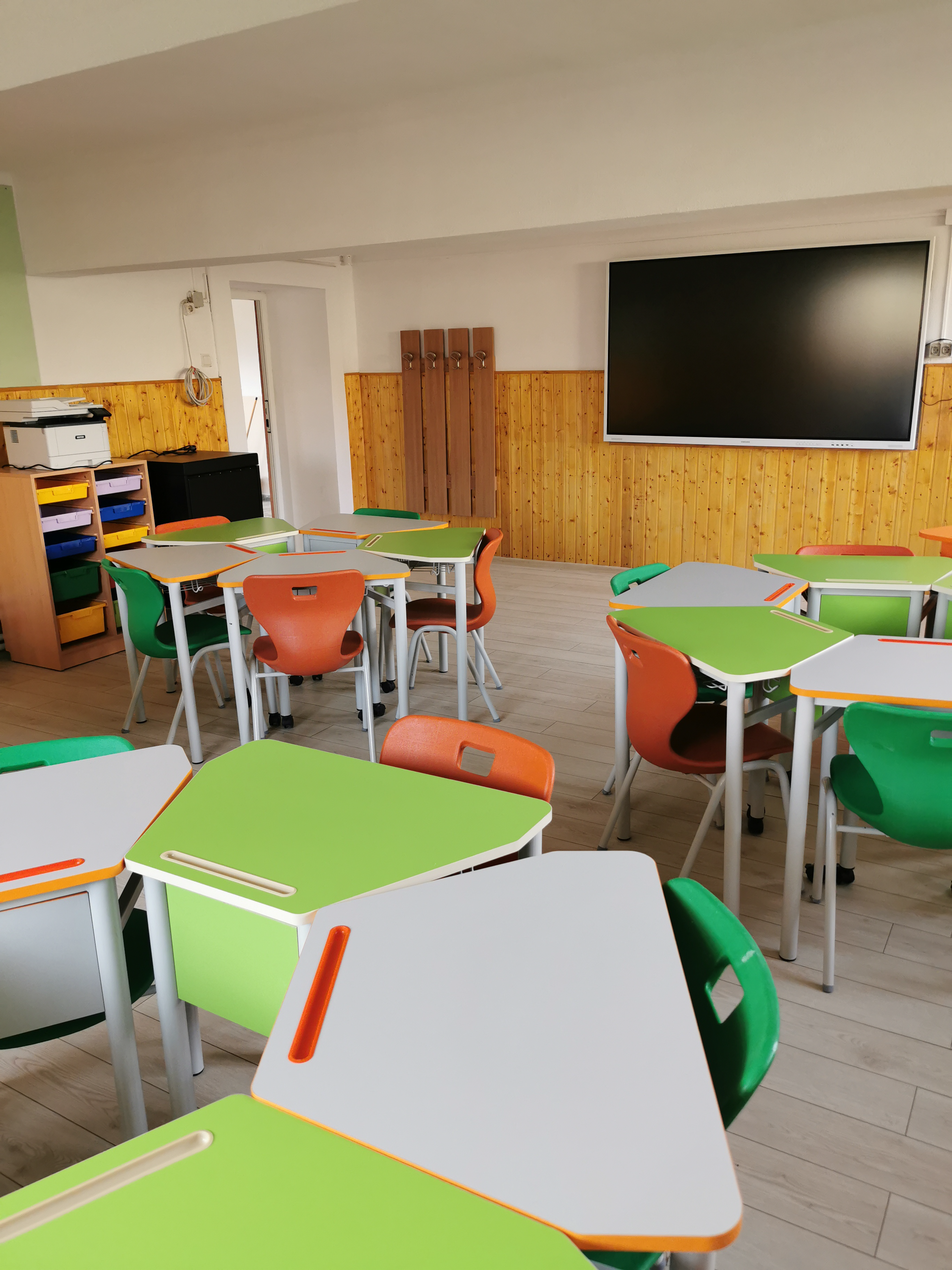 Pentru buna desfășurare a activităților didactice am achiziționat o serie de echipamente și software care să ajute la digitalizarea procesului didactic, pentru fiecare din cele două săli nou amenajate. Astfel, am achiziționat dispozitive special concepute pentru procesul educațional, Chromebook. Aceste dispozitive sunt foarte ușor de folosit pentru că rulează sistemul de operare Chrome, similar programului de navigare pe Internet Chrome, cu care atât profesorii cât și elevii sunt familiarizați. Aceste Chromebook-uri sunt încărcate cu ajutorul unei stații mobile. Ecranul touch interactiv înlocuiește cu succes clasica tablă de sticlă pe care scriem cu cretă și ne dă posibilitatea să accesăm diferite aplicații educaționale interactive. Imprimanta WiFi e una de ultimă generație, laser. Camera pentru documente permite partajarea cu ușurință pe tabla interactivă a oricărui conținut letric: vom putea astfel utiliza materialele educaționale pe care le avem pe suport de hârtie. Licența Moza Web ne va permite folosirea de conținut educațional interactiv care creează angajamentul elevilor pentru învățare. Astfel, activitățile de predare – învățare – evaluare vor avea numai de câștigat prin digitalizarea procesului instructiv-educativ.