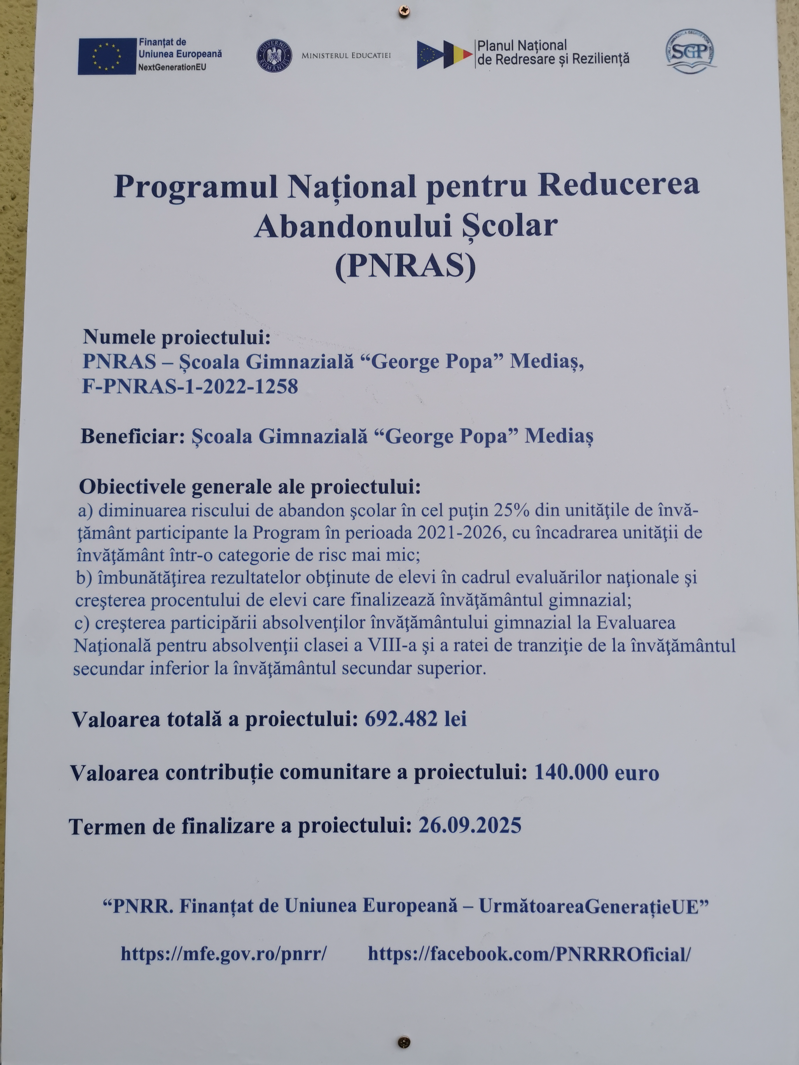 PNRAS (Programul Național pentru Reducerea Abandonului Școlar) este implementat în cadrul Planului Naţional pentru Redresare şi Rezilienţă al României (PNRR). Proiectul se desfășoară pe parcursul a 3 ani.