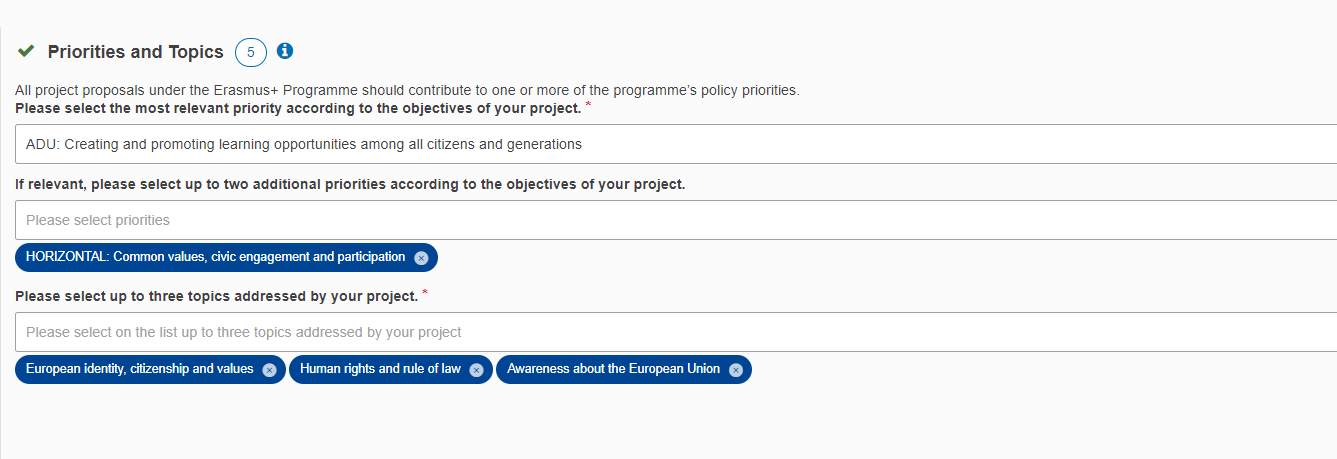 U sljedećem koraku bit će potrebno odabrati prioritet koji želite adresirati projektom, a ovisno o području u kojem prijavljujete vašu projektnu ideju. U Vodiču kroz program Erasmus+ navedeni su horizontalni prioriteti koji se odnose na sva područja, ali i dodatni sektorski prioriteti relevantni za odabrano područje. Kako bi ih se moglo uzeti u obzir za financiranje, projekti Malih partnerstava moraju biti usmjereni na barem jedan horizontalni prioritet i/ili barem jedan posebni prioritet iz sektorskog područja. Ako je relevantno, možete odabrati i do dva dodatna prioriteta prema ciljevima vašeg projekta, a trebate odabrati i do tri teme kojima se bavi vaš projekt.