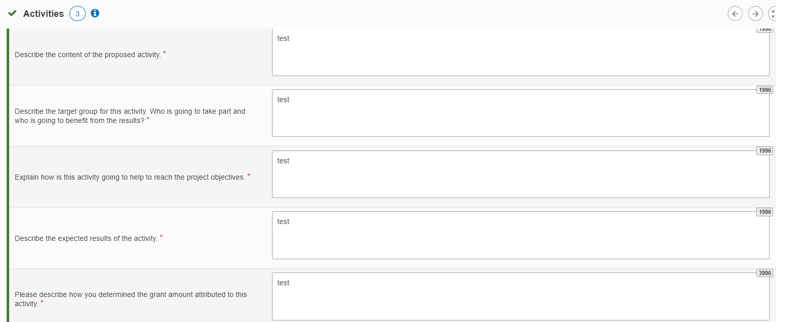 Kategorija Activities dijeli se na potkategorije Activity Details, čiji broj odgovara broju predloženih aktivnosti. Kod Activity Details unosite potrebne informacije za svaku dodanu aktivnost, kao što su: mjesto održavanja aktivnosti, datum početka i završetka, vodeću i sudjelujuće organizacije, iznos koji ćete dodijeliti toj aktivnosti, sadržaj aktivnosti, ciljne skupine, način na koji će provođenje ove aktivnosti pomoći u ostvarenju projektnih ciljeva, očekivane rezultate te dodatno pojašnjenje svojih financijskih potraživanja za tu aktivnost.
