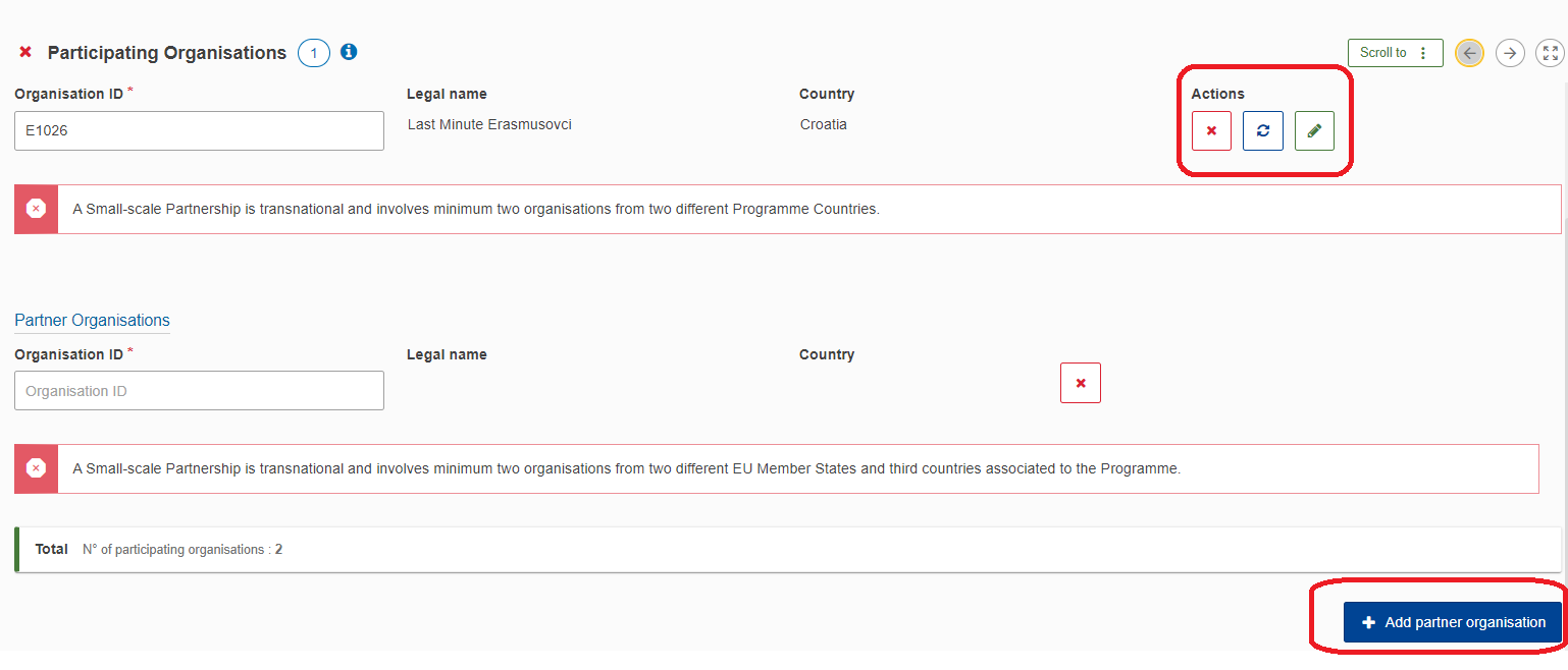 Nakon što ste opisali ciljeve, sljedeći korak je unos i opis organizacija koje će sudjelovati u projektu. Mala partnerstva zahtijevaju sudjelovanje minimalno dvije organizacije iz dvije različite programske zemlje, no sustav dopušta unos i većeg broja organizacija (Add partner organisation). Ne postoji najveći dopušteni broj organizacija koje sudjeluju u jednom partnerstvu. Upisom OID broja sustav automatski povlači unesene podatke iz Sustava za registraciju organizacija. Za svaku partnersku organizaciju potrebno je unijeti njen OID kako bi sustav učitao osnovne informacije, a vi (ili osoba kojoj ste dodijelili ovlasti kroz sustav) dalje unosili detaljnije podatke.