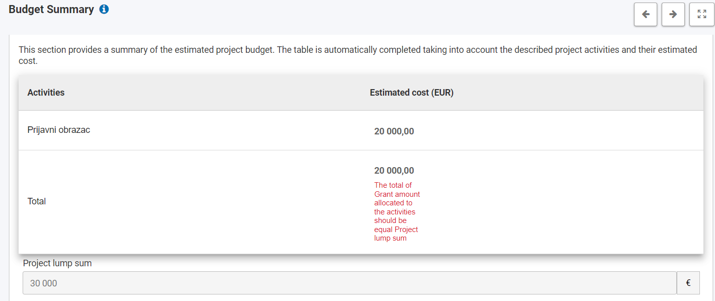 U kategoriji Budget Summary sustav će vam odmah signalizirati ako kroz dio upisa aktivnosti niste dobro odredili iznose koji ukupno trebaju biti jednaki zatraženom paušalnom iznosu za projekt. Vratite se na prethodni odjeljak i unesite ispravne iznose: