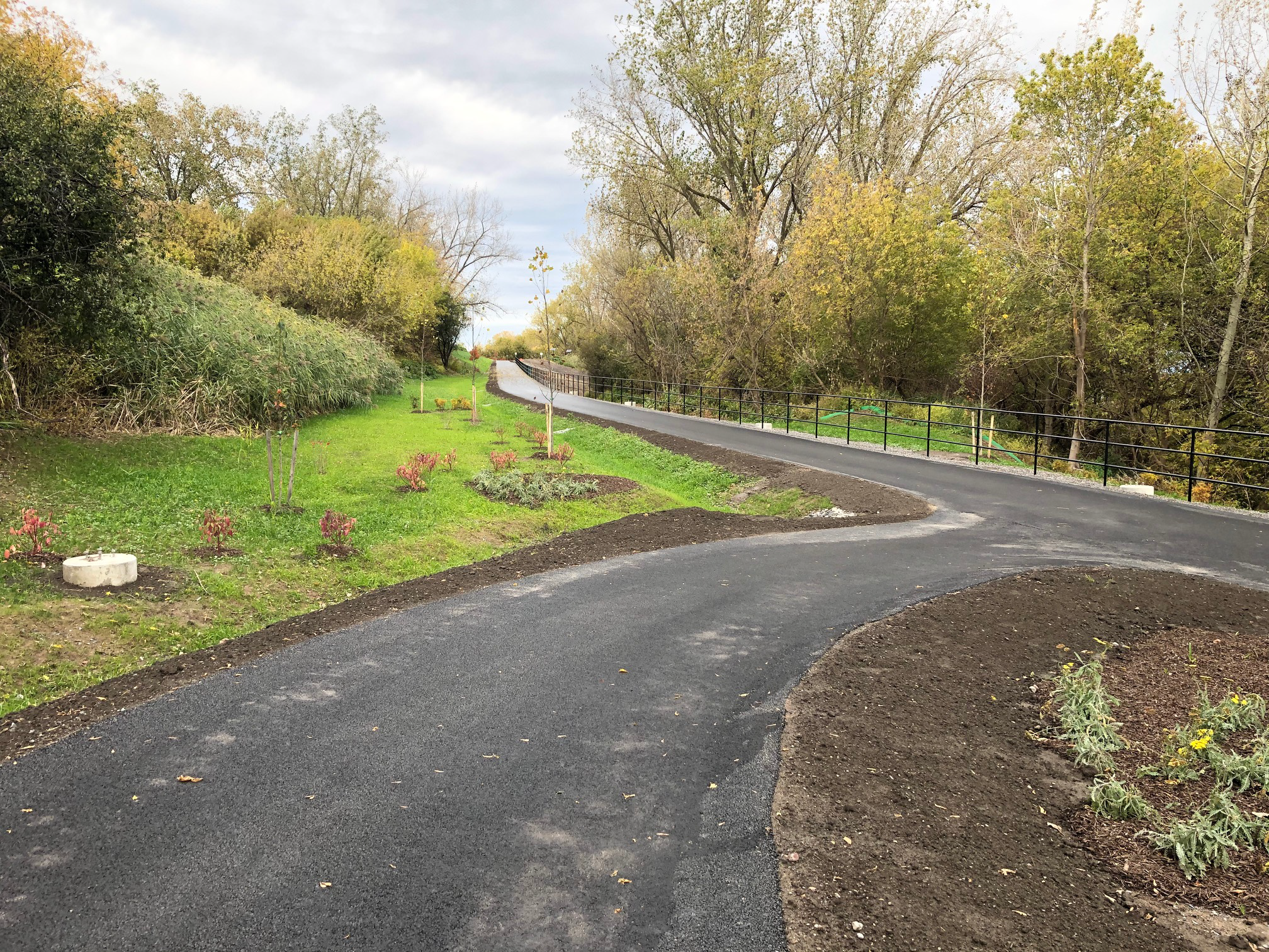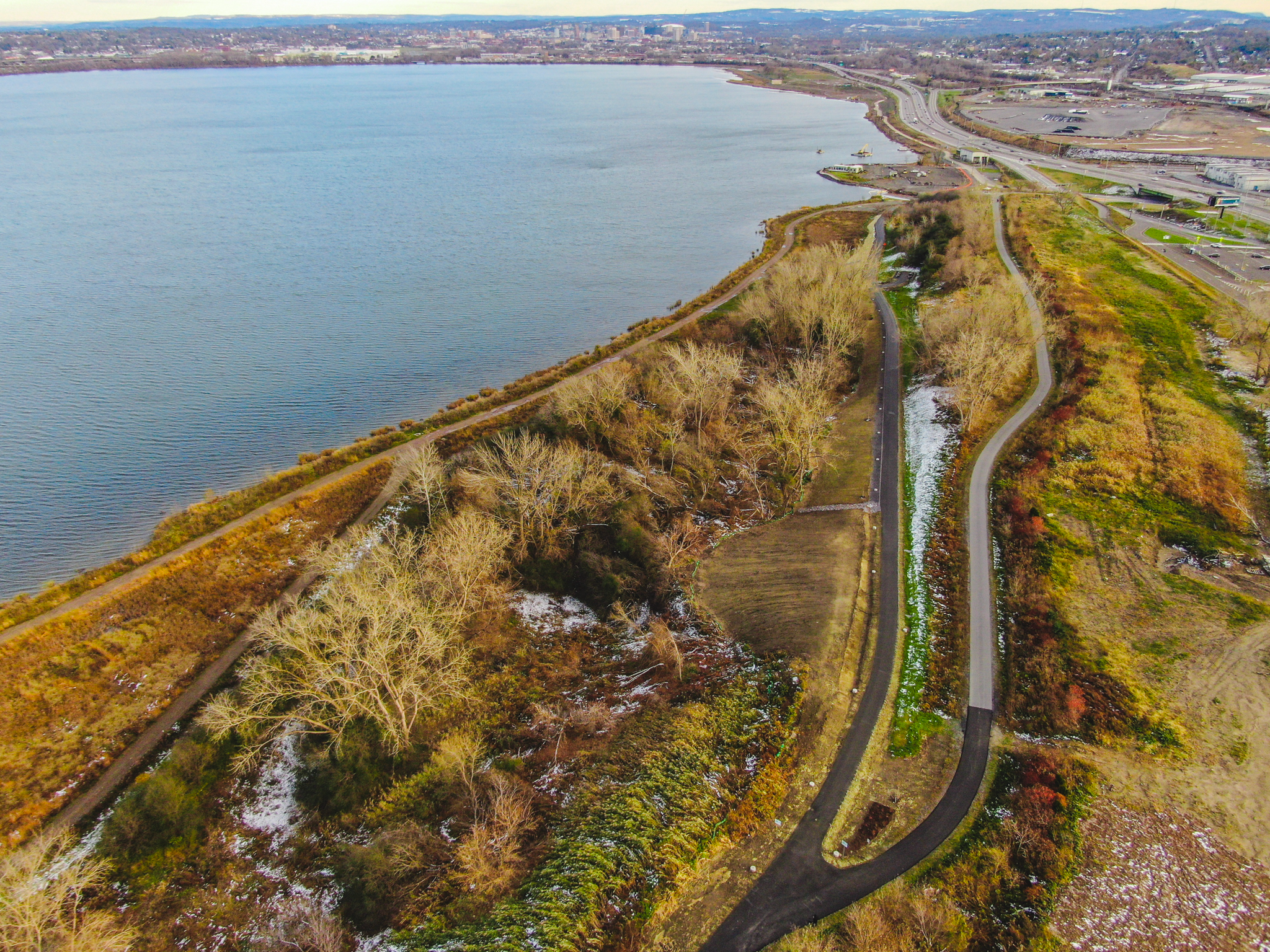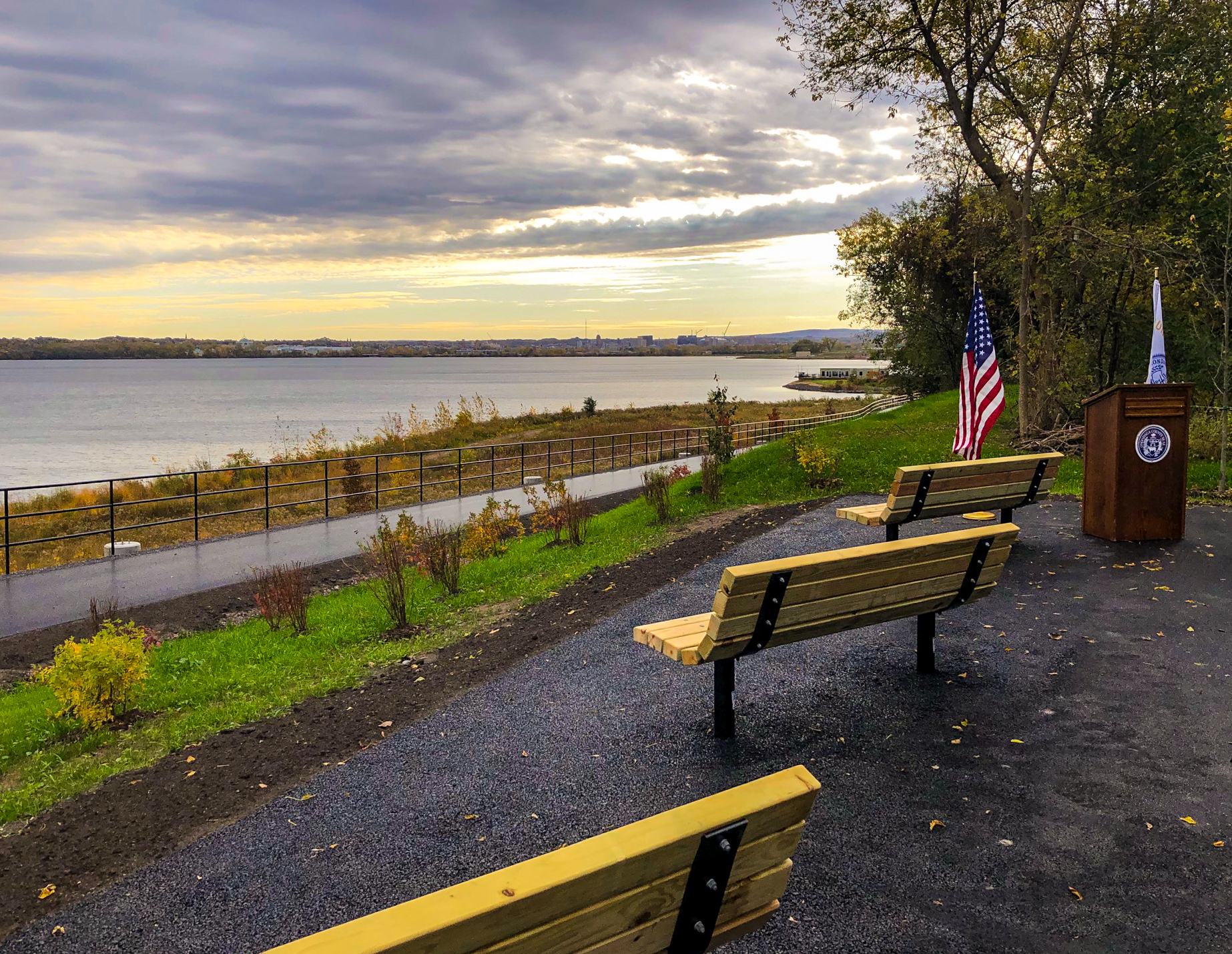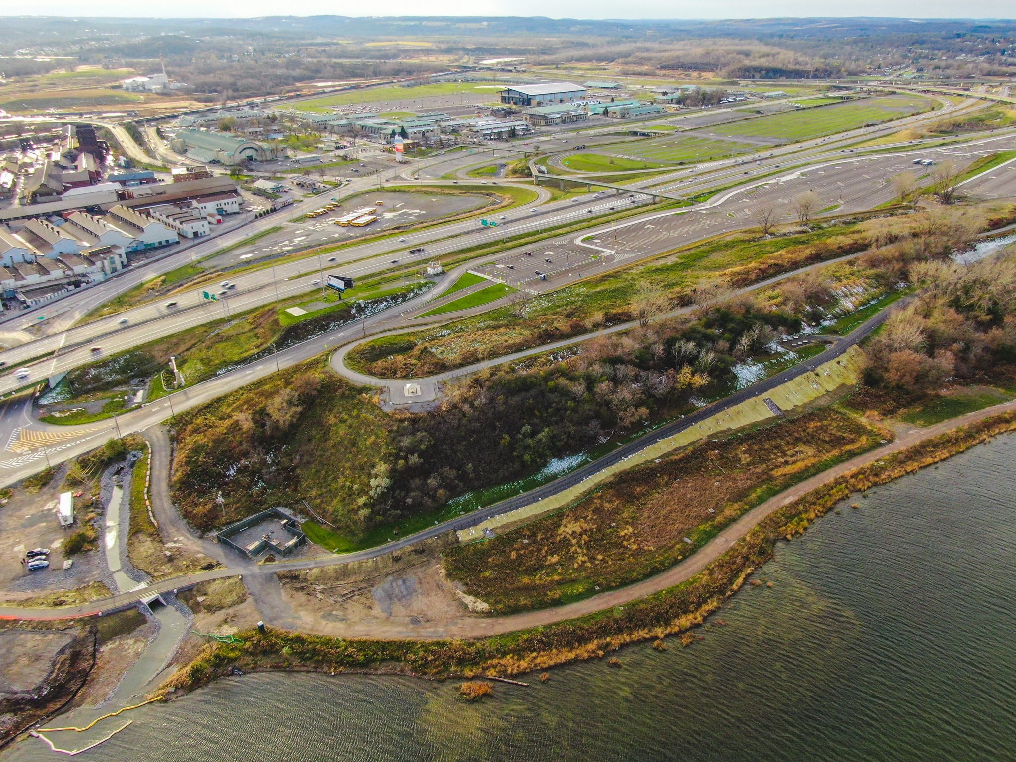 This phase of trail extension includes paving and connecting a recreational facility to the existing trail, adjacent to the New York State Fairground Orange Parking Lot, ending at the NYSDEC proposed Boat Launch. This segment crosses an Onondaga Lake tributary utilizing a designed concrete box culvert and navigating through hazardous materials, soil contamination, the 100-year flood plain of recreational waters, defined wetlands and on-going Onondaga Lake clean-up construction activities. The project took advantage of the expansive views of Onondaga Lake by locating seating areas for rest and logical points for overall wayfinding signage.