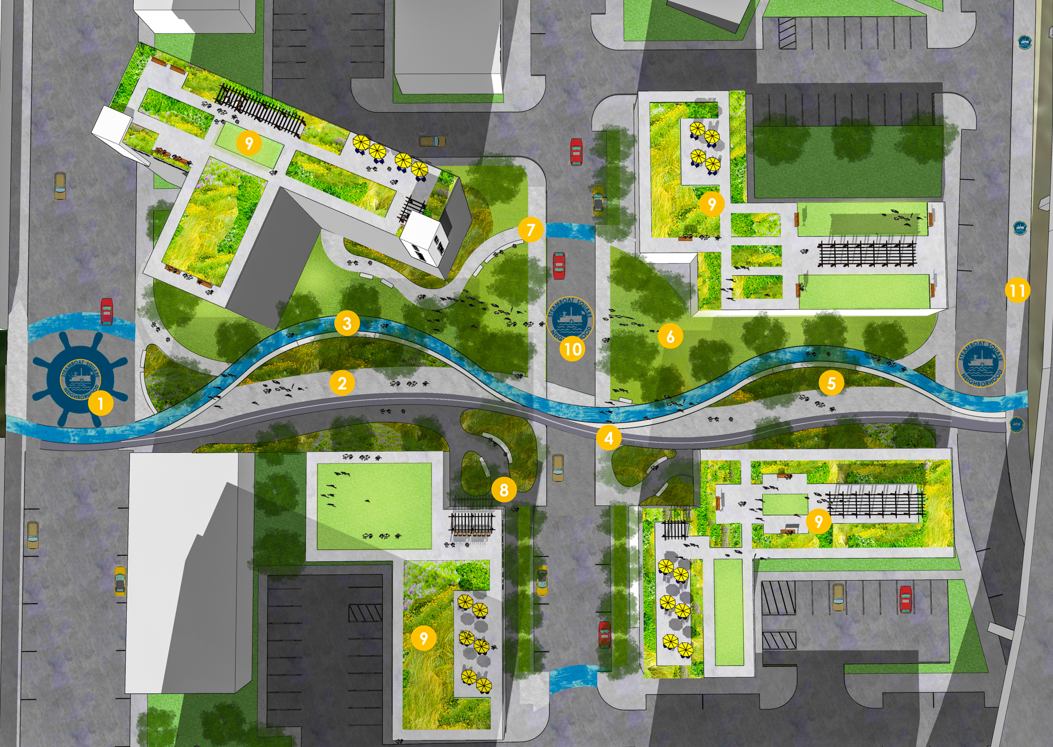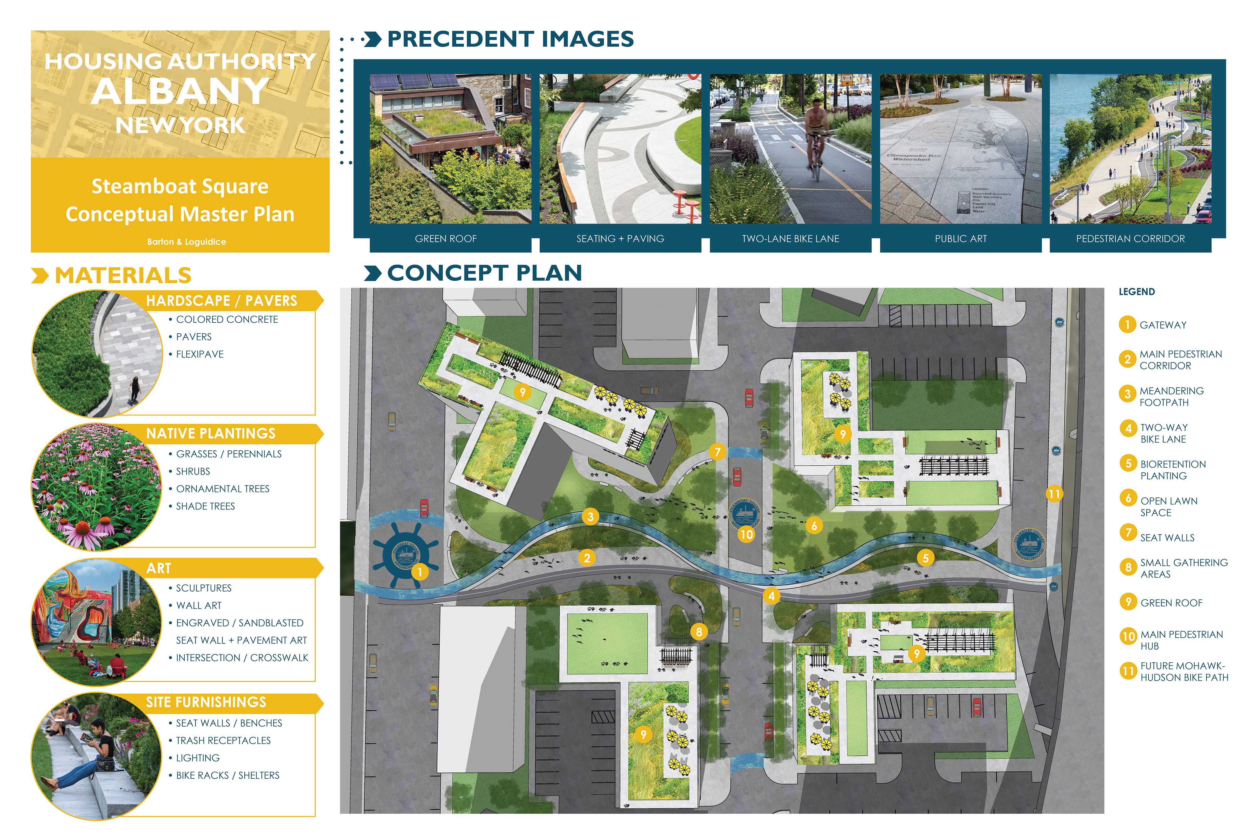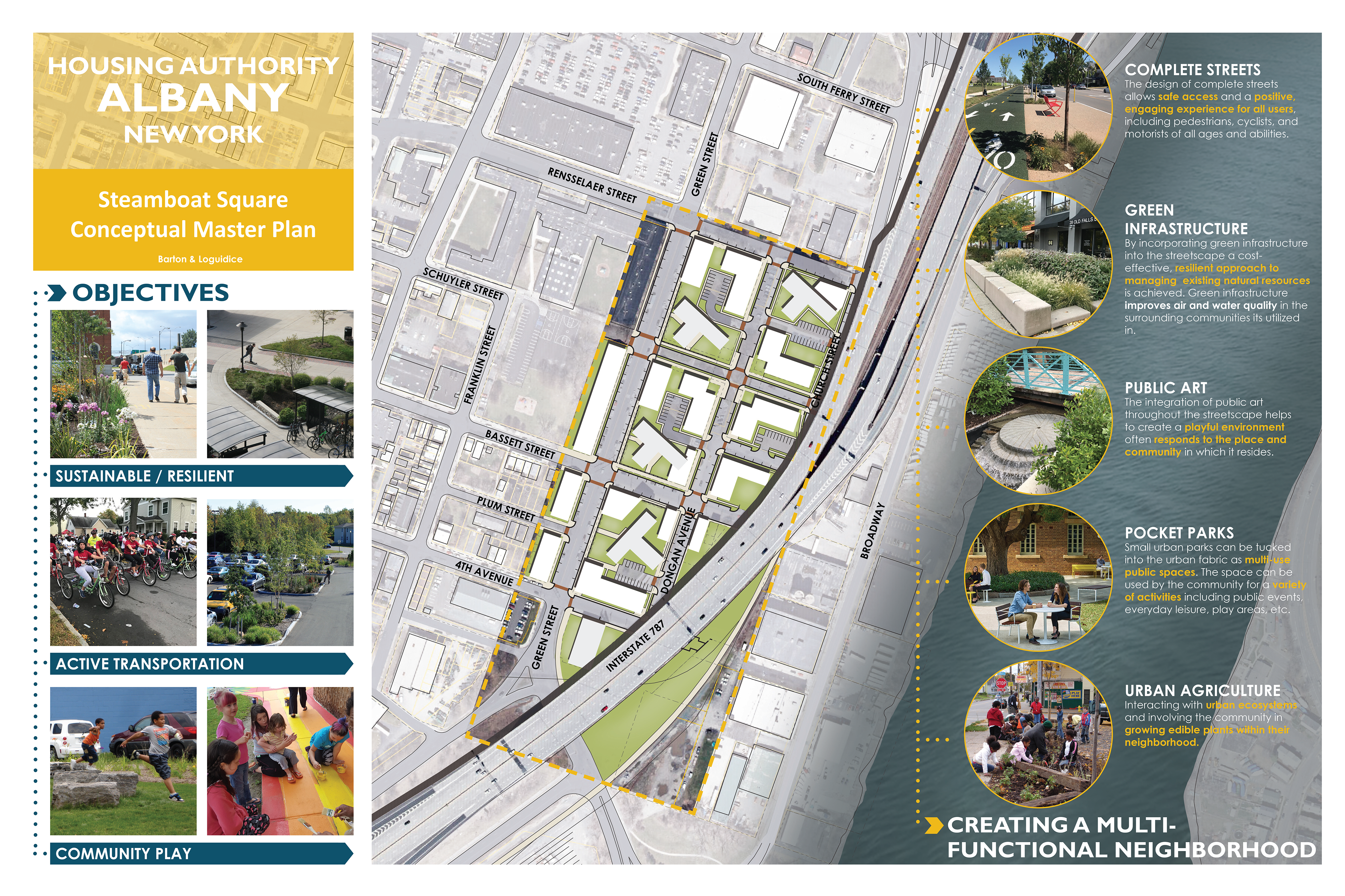 B&L has been hired to assist PLAN Architectural Studio with completing the Steamboat Square Master Plan for the client, Albany Housing Authority. To support a series of phasing diagrams from PLAN that illustrate infill locations and new development within the Steamboat Neighborhood, B&L created a strong conceptual master plan design consisting of complete streets, green infrastructure, public art, pocket parks, and urban agriculture.