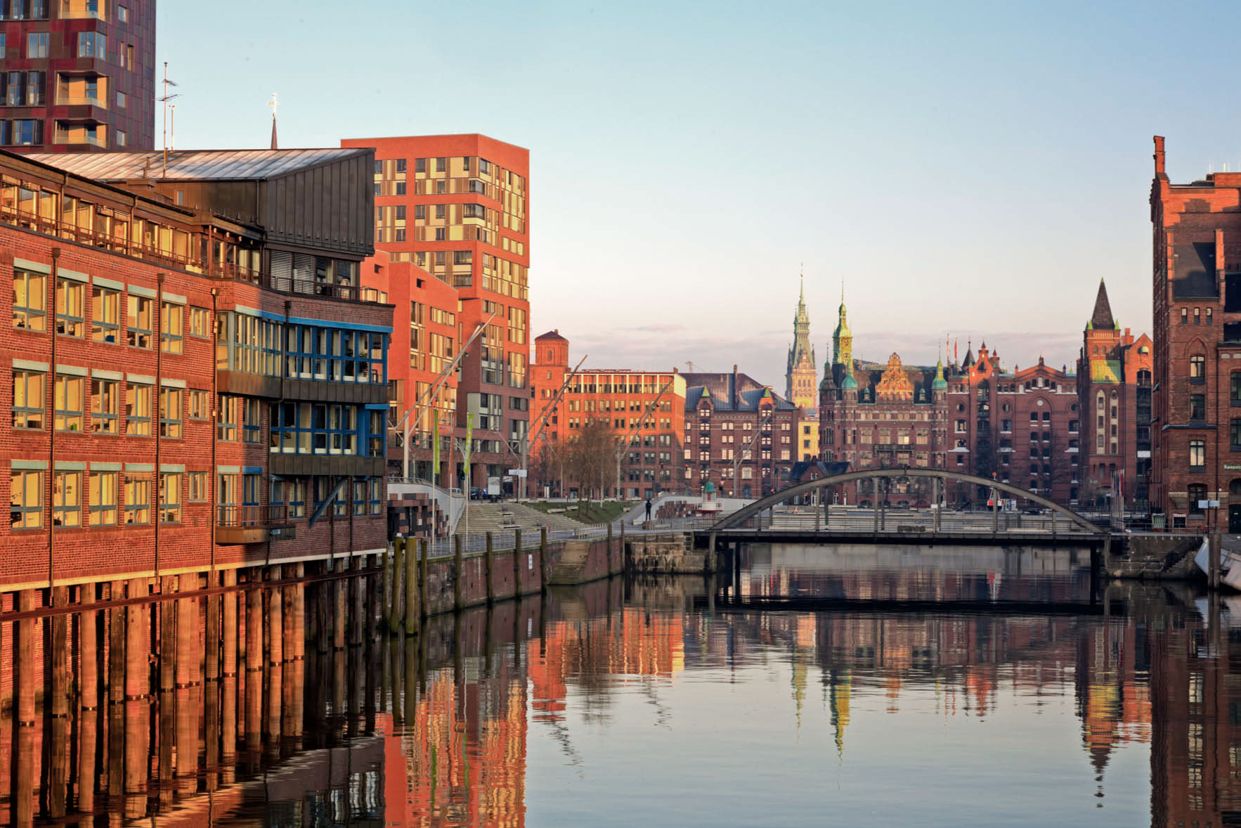View into the Magdeburger harbour with new buildings of HafenCity and the historical Speicherstadt (UNESCO), tower of City Hall in the background