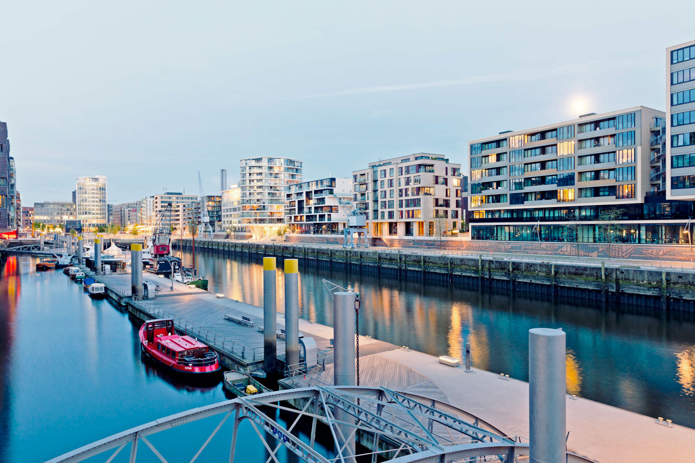 View on the Sandtorhafen and the new buildings along Kaiserkai at a full moon night, district HafenCity