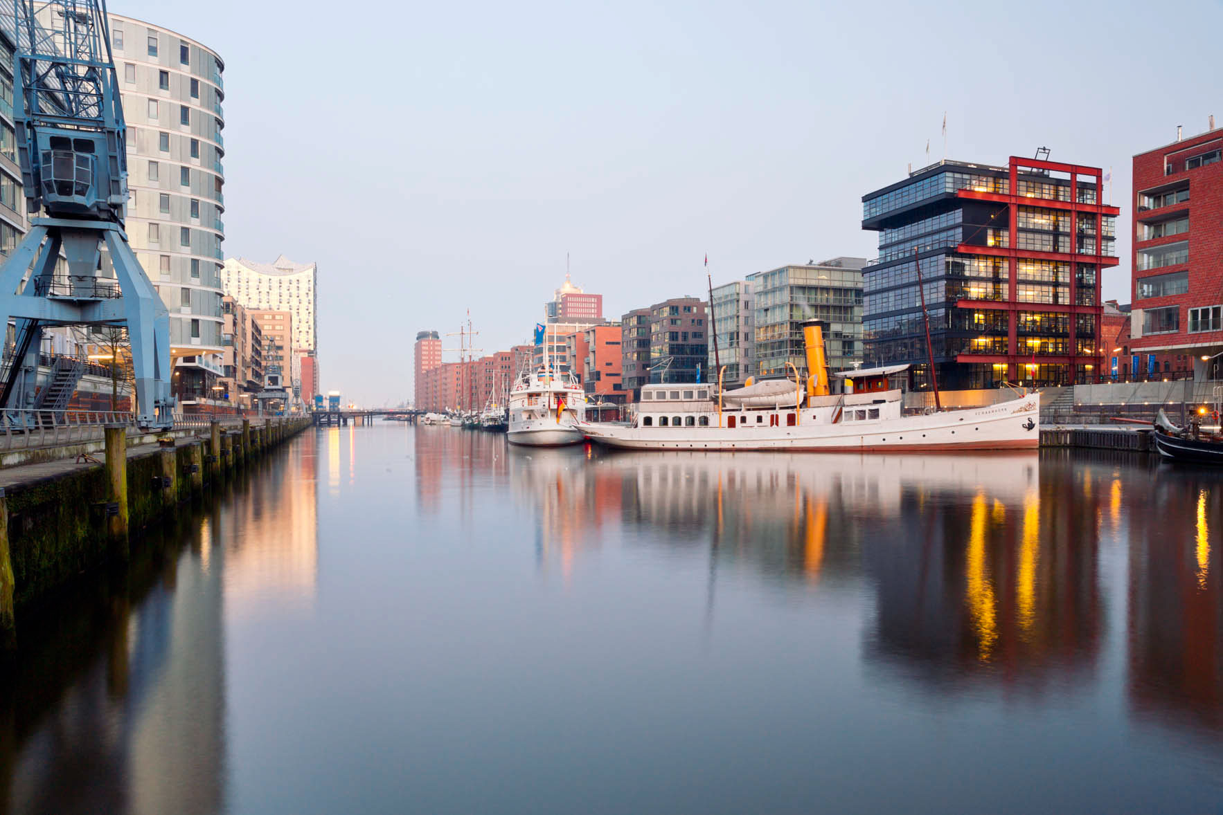 View on the Sandtorhafen and the new buildings along Kaiserkai, Elbphilharmony at the very end left, district HafenCity