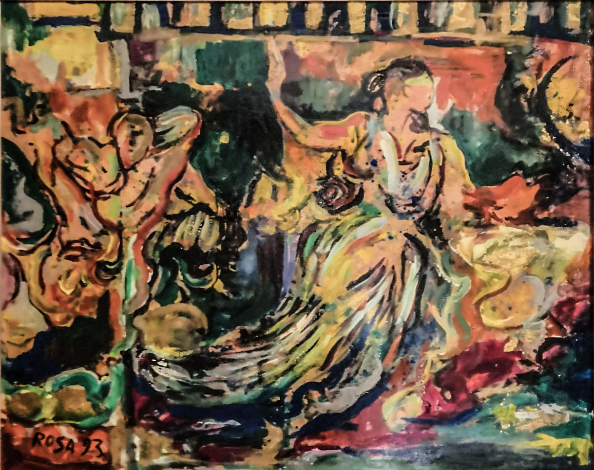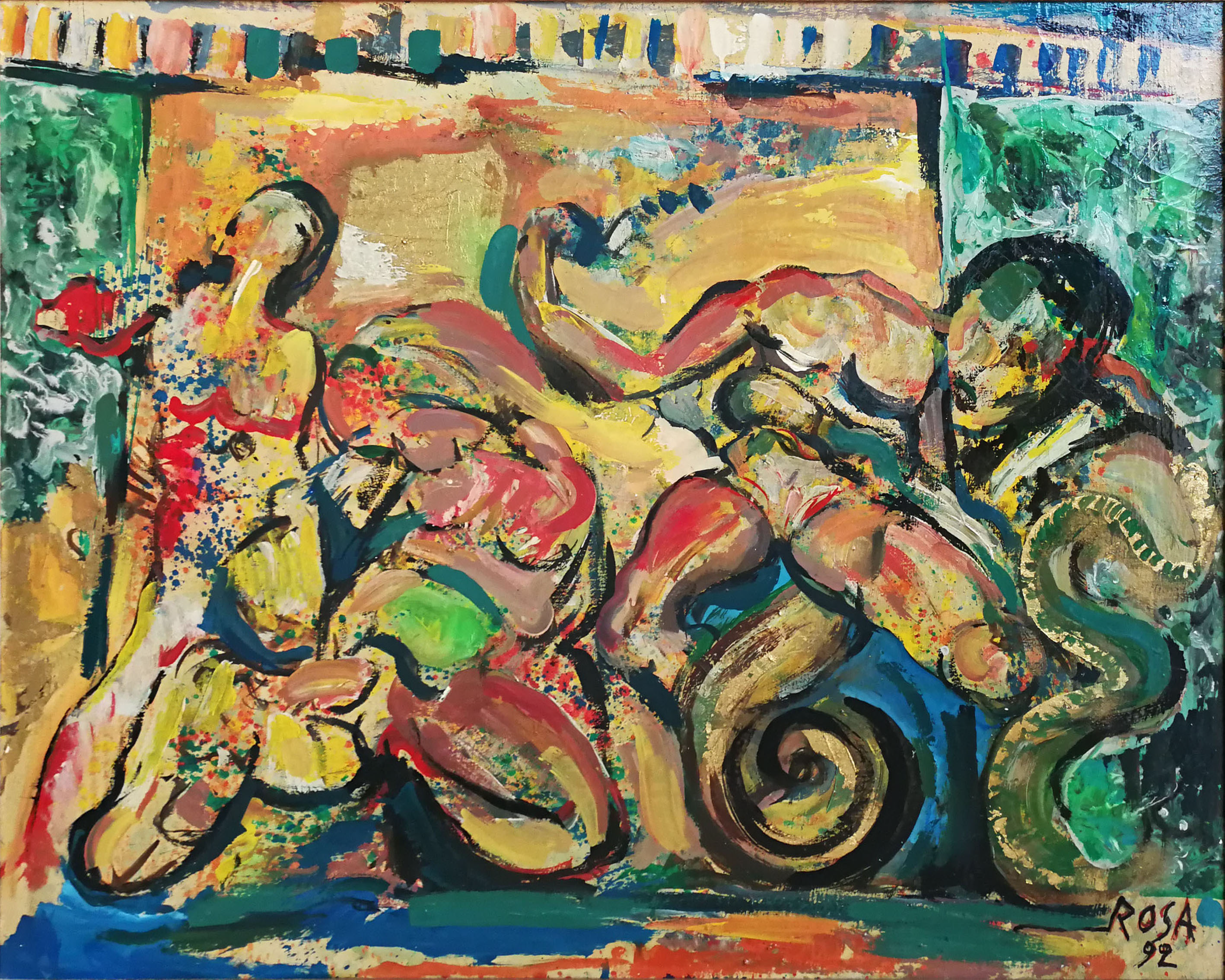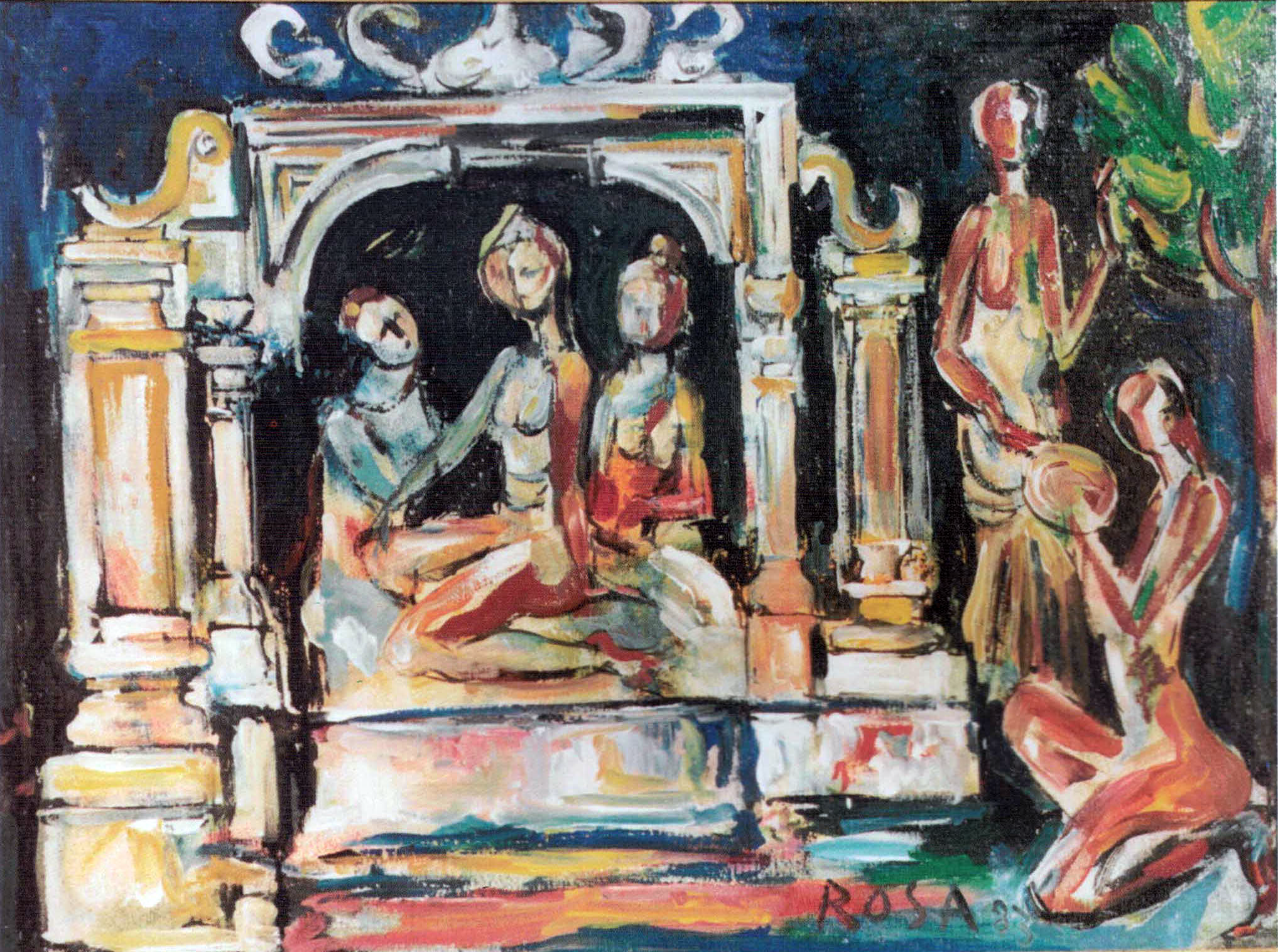 Agli inizi degli anni '80 del secolo scorso risalgono le elaborazioni pittoriche che illustrano rituali esotici attinti dall'artista dal repertorio decorativo di monumenti risalenti ad antiche civiltà orientali.