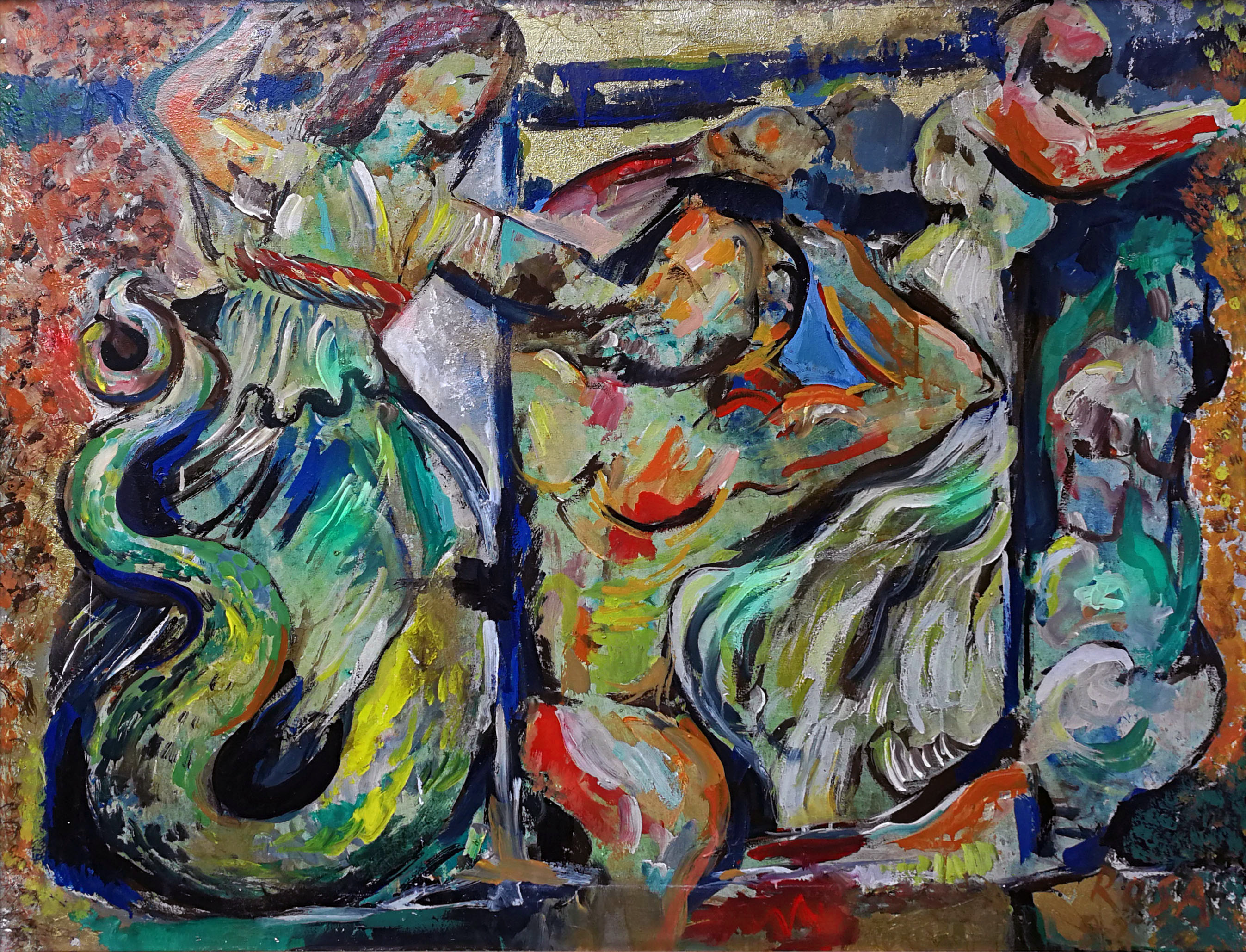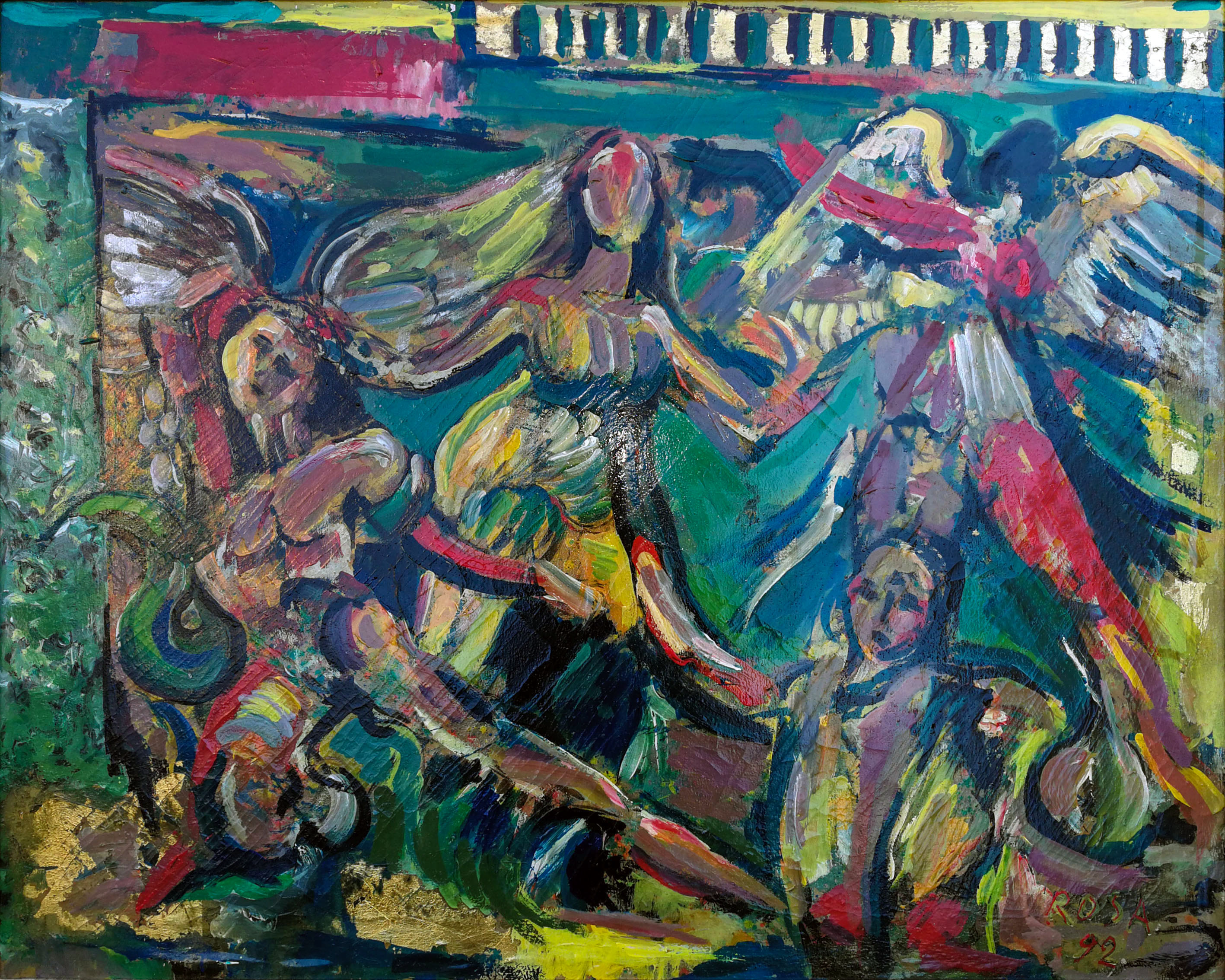 D’ispirazione asiatica, questi dipinti sono correlati al tema della religiosità pagana, che vuole l’uomo vittima di un inganno: l’obbligo di dare senza ricevere. Gli impasti sontuosi e i riflessi cangianti dei colori, utilizzati non per sfondo, particolarmente buio, ma per tutte le figure (uomini adoranti e divinità pagane), esercitano una pressante seduzione agli occhi delle anime, simboli sottesi all’astrattismo delle figure stesse.