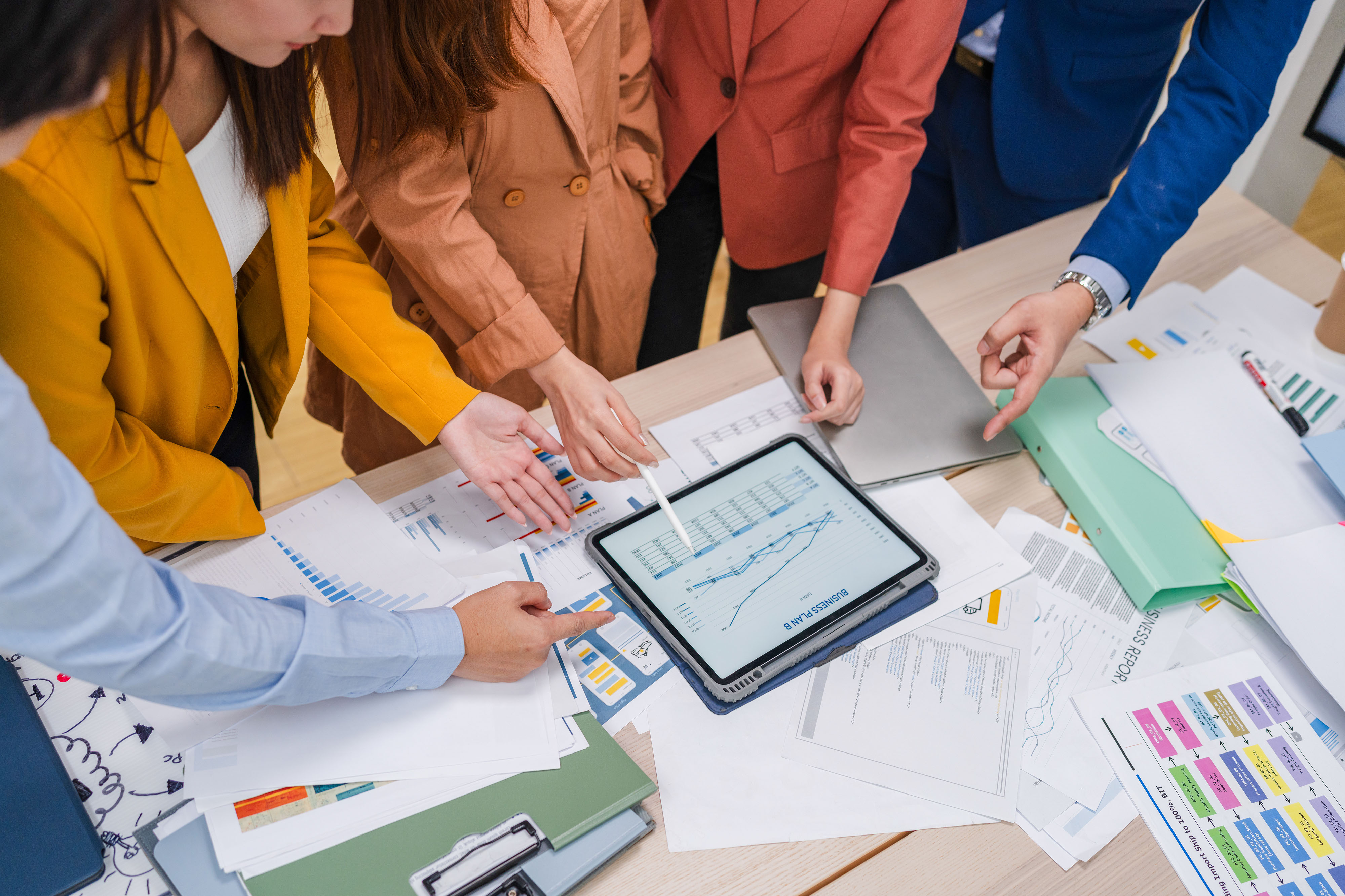 Created with images by David - "Group of confident business people point to graphs and charts to analyze market data, balance sheet, account, net profit to plan new sales strategies to increase production capacity." • whyframeshot - "Business meeting showcases agile brainstorming with data analysis charts on tablets.,Financial growth prediction strategy through predictive analytics and data-driven insights for strategic business"