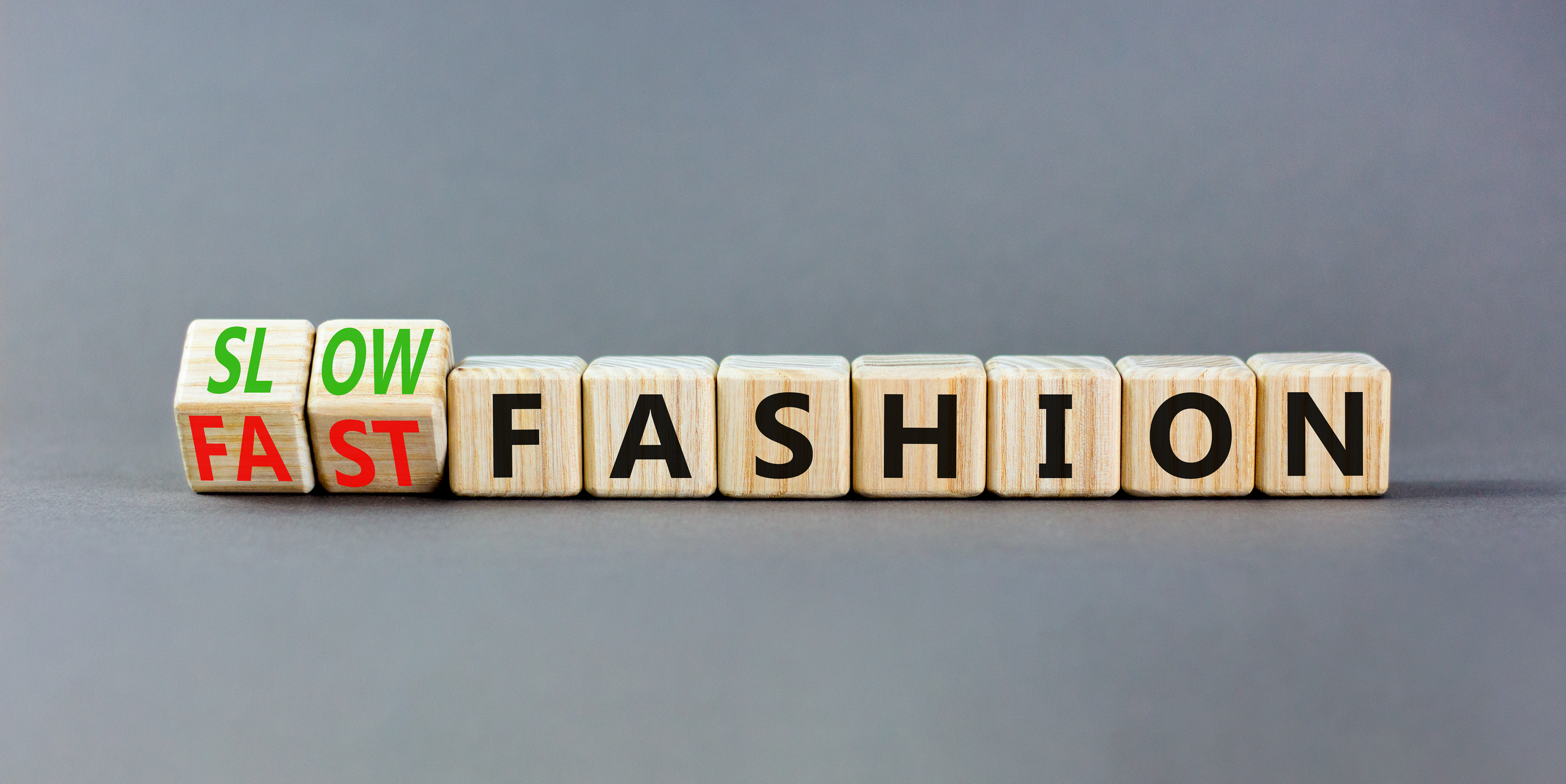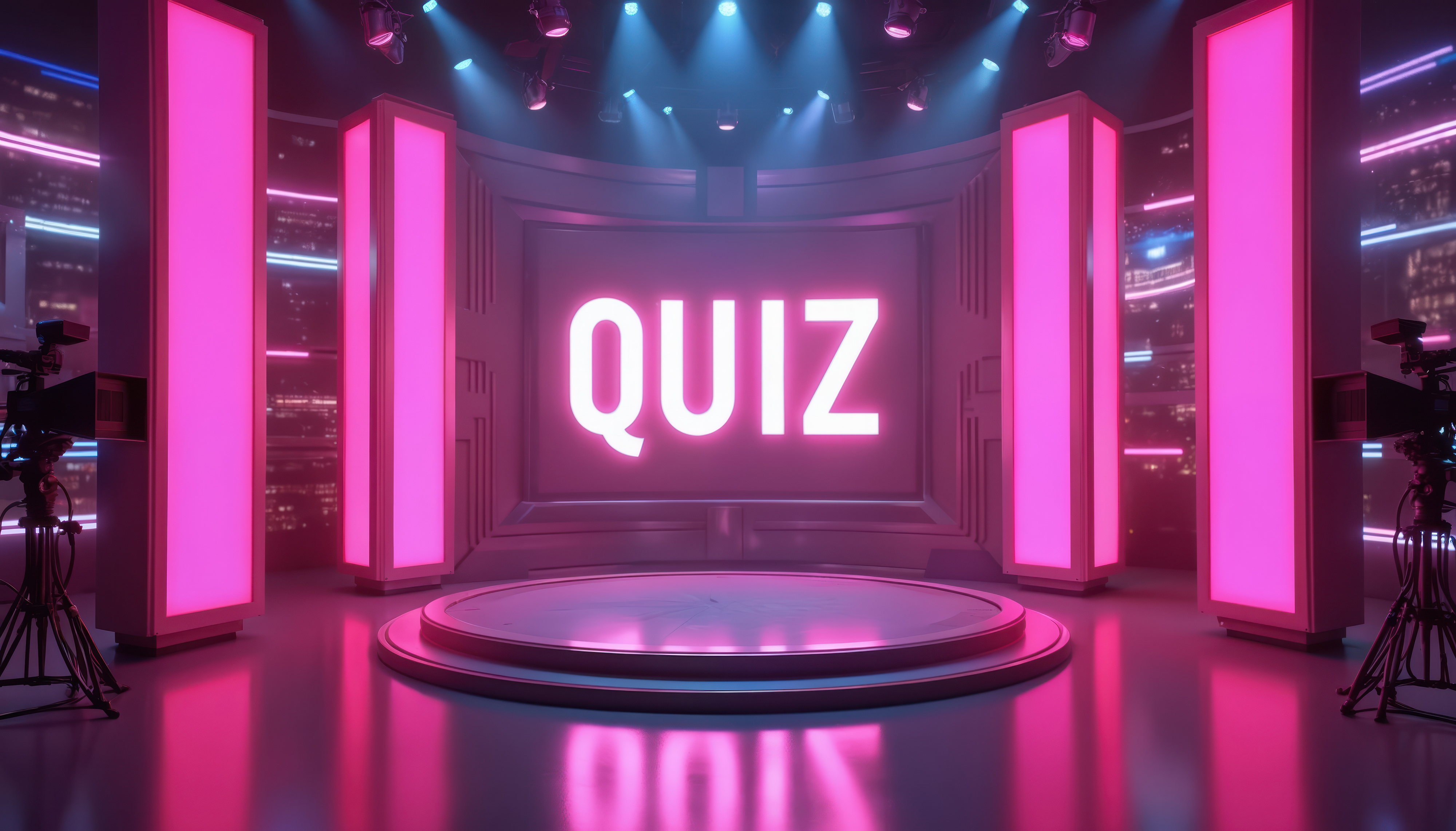 Créé à partir d’images de : Vadym - "Modern quiz show studio set illuminated by neon lights. Big screen displays word QUIZ. Cameras, stylish geometric backdrops, stage for competition, pink, purple lighting tech design elements. Trendy" • Niklas - "Isolated Shopping Cart" • Dzmitry - "Fast or slow fashion symbol. Concept words Fast fashion and Slow fashion on wooden cubes. Beautiful grey table grey background. Business fast or slow fashion concept. Copy space."