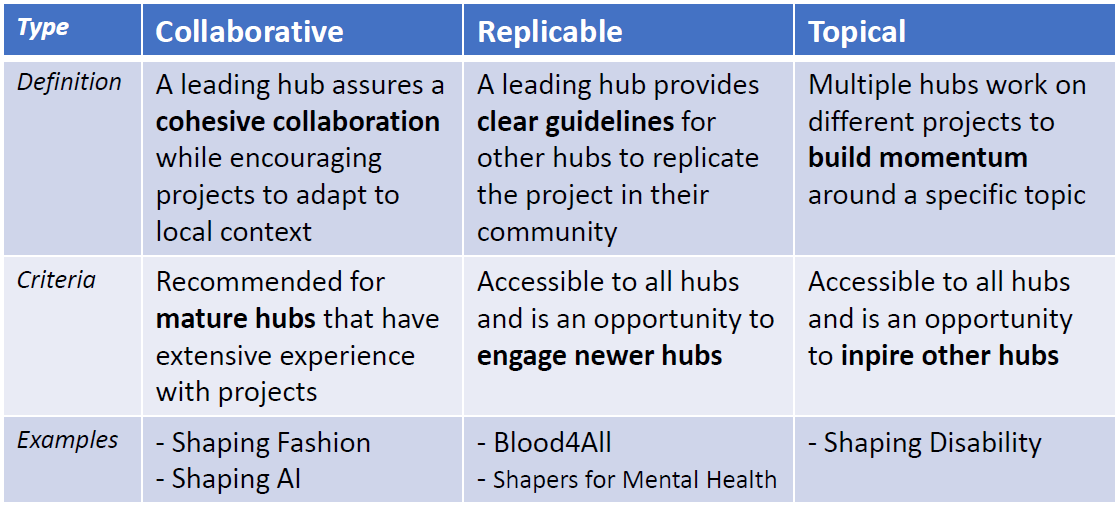- Hub projects may be new initiatives created by the hub or partnerships to support existing initiatives.
