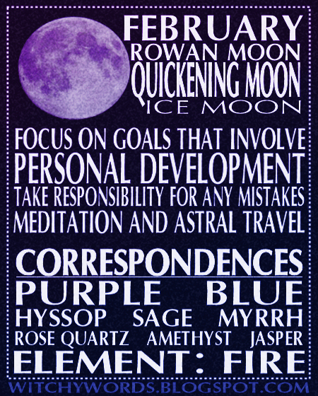 Thanks to its proximity to Imbolc, the Quickening Moon season is a time of magical energy related to the feminine aspect of the goddess, of new beginnings, and of fire. It's a great time to focus on divination and increasing your own magical gifts and abilities. Take advantage of these concepts, and plan your workings accordingly.