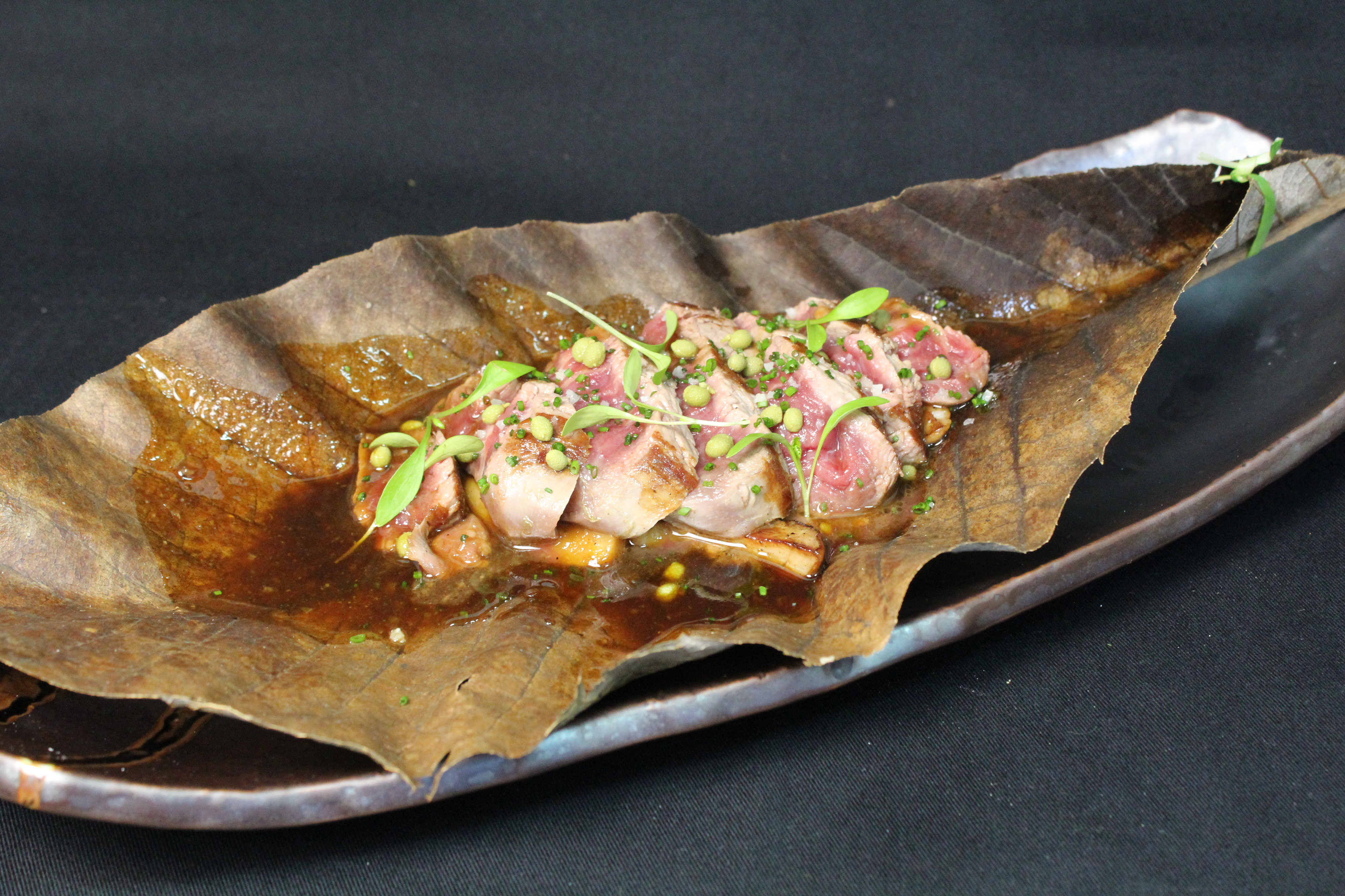 PRESENTADO EN UNA HOJA DE MAGNOLIA, SOLOMILLO DE BUEY LONCHEADO Y MARCADO EN EL TEPPANYAKI, SALTEADO CON AJETES, BOLETUS Y PIMIENTA SANSHO, SERVIDO SOBRE GLASE DE SU HUESO TOSTADO CON MIEL Y MISO. - 19,00€