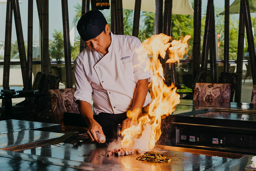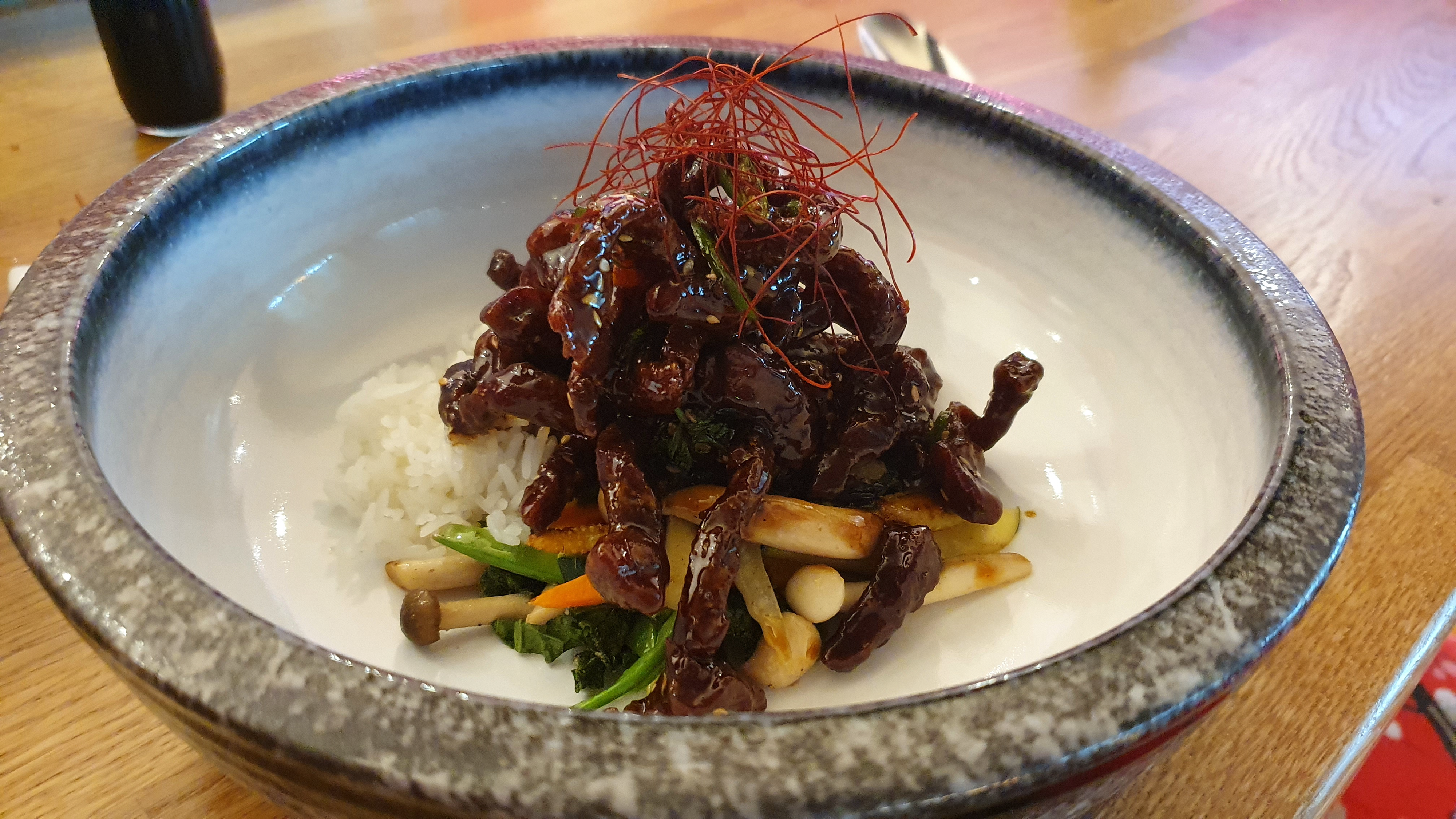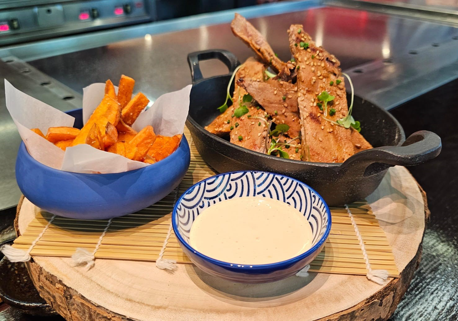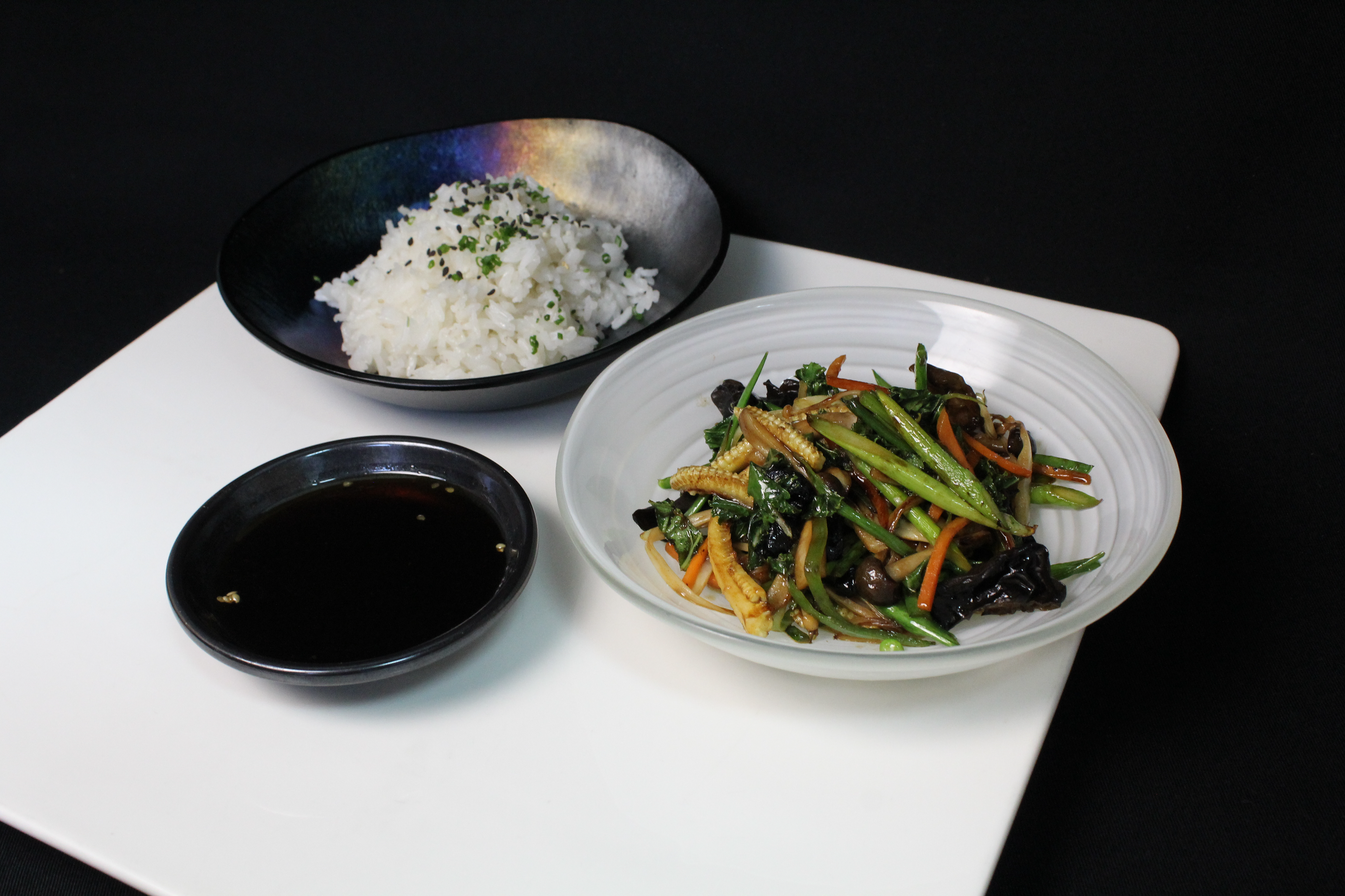 LOMO ALTO DE BUEY AL TEPPANYAKI PRESENTADO EN PIRAMIDE SOBRE UNA CRUZ PINTADA DE AJO MOMOYA, CON SNACK DE AJO BLANCO FRITO ACOMPAÑADO DE UN CUENCO DE VERDURAS SALTEADAS CON AJO NEGRO Y TERIYAKI, ARROZ CON ACEITE DE AJO FRITO Y SALSA YAKINIKU. - 25,00€