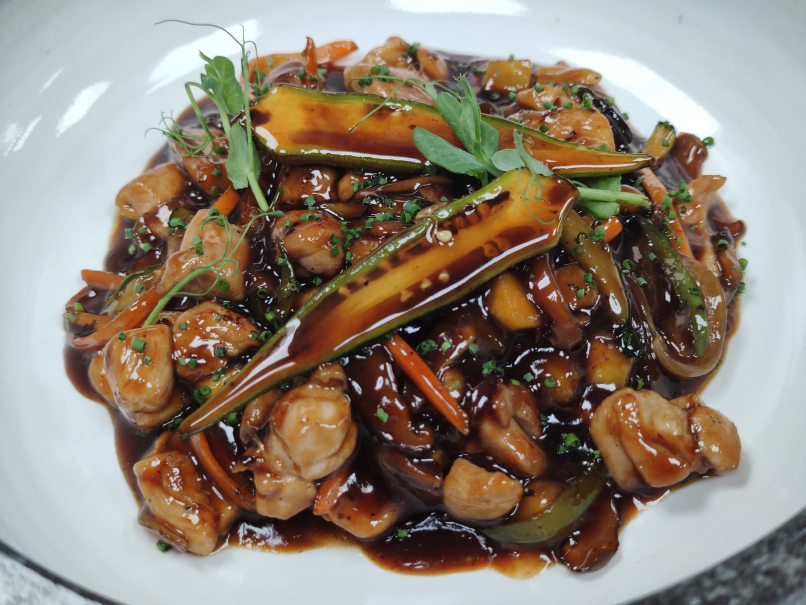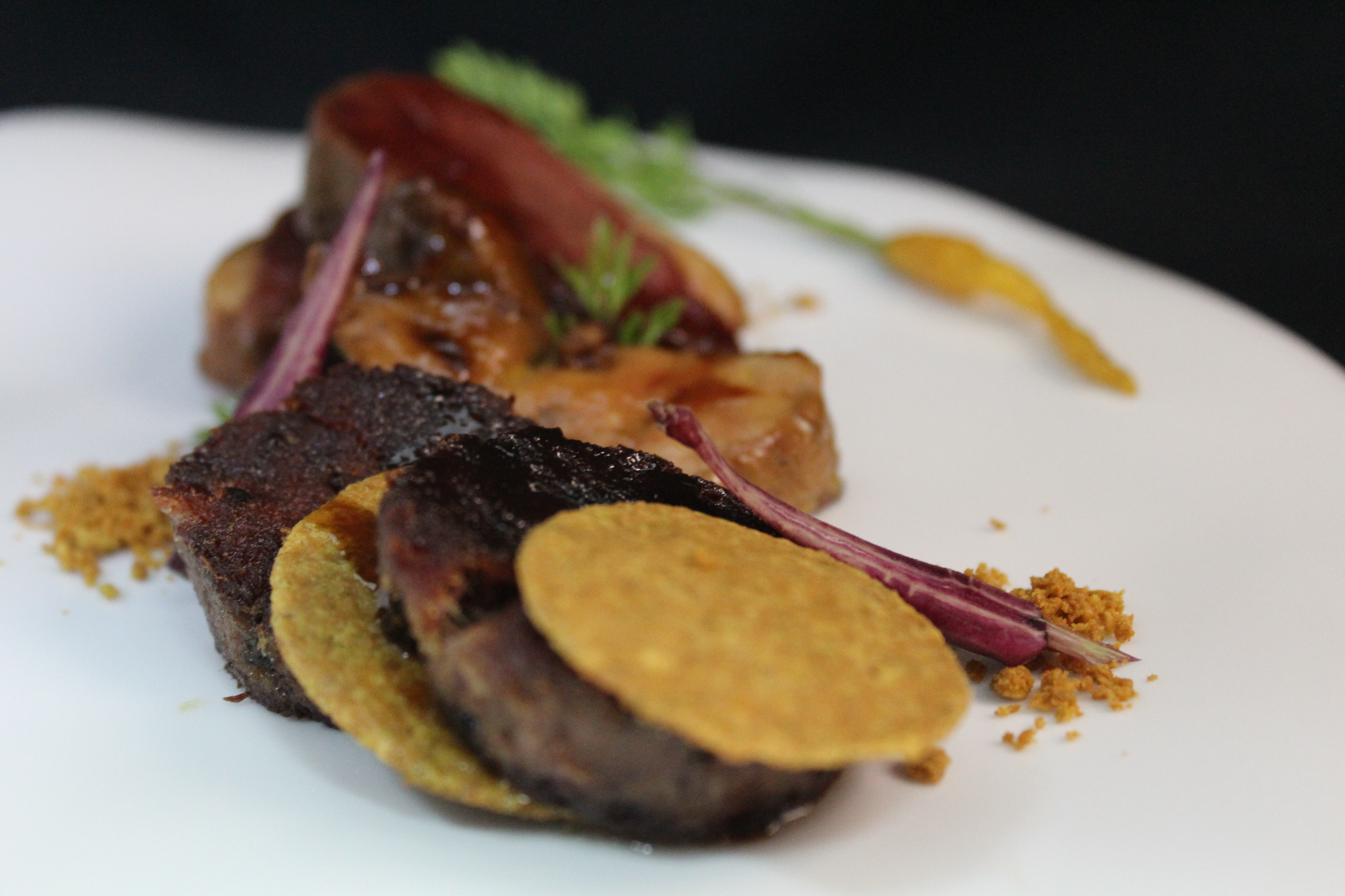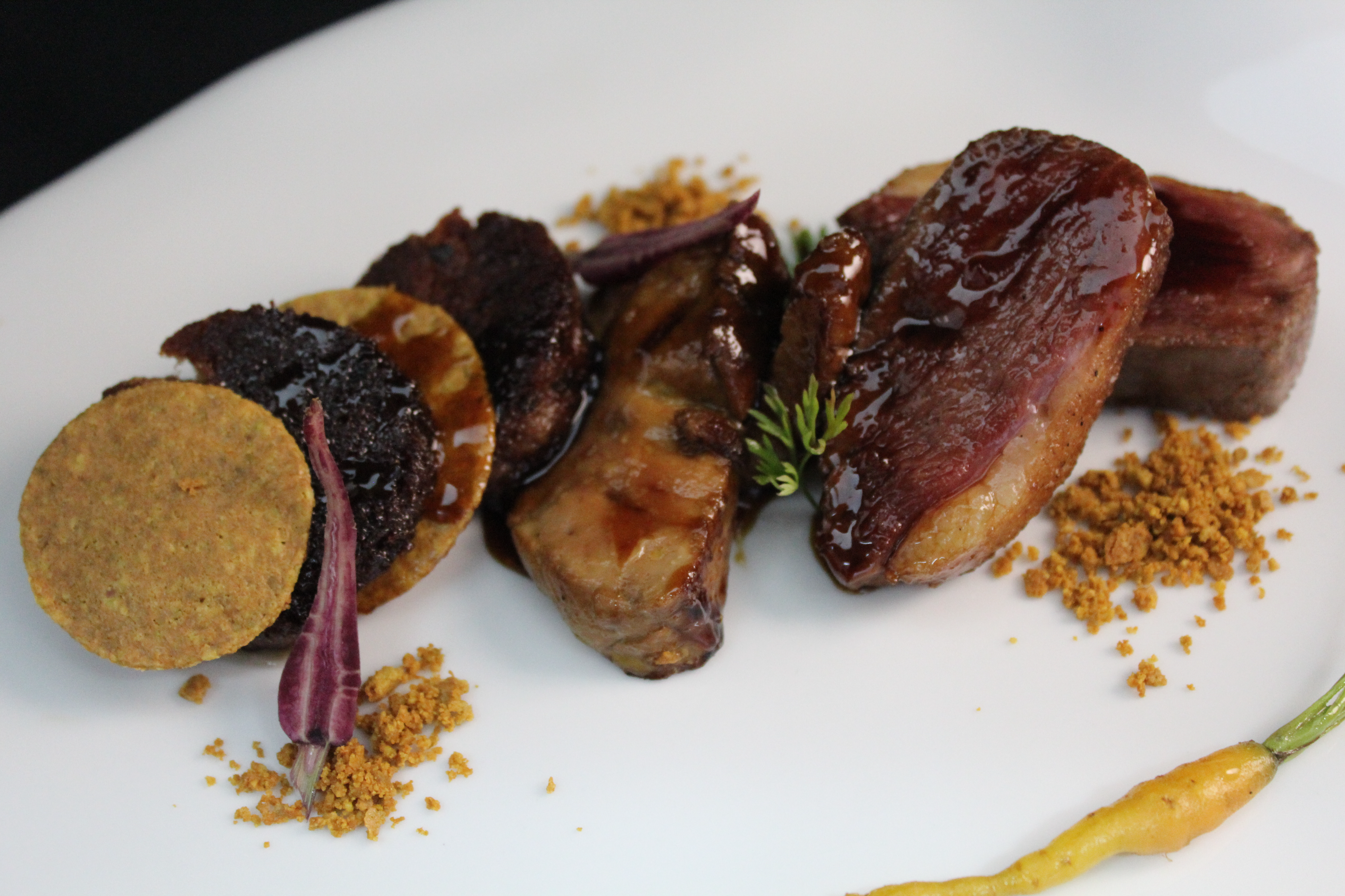 TRILOGIA DE PATO: MAGRET, FOIE MARINADO CON SOJA Y TERRINA DE CONFIT A LA PLANCHA CON TERIYAKI, GLACE DE MIEL Y GALLETA DE PISTACHO. - 19,00€