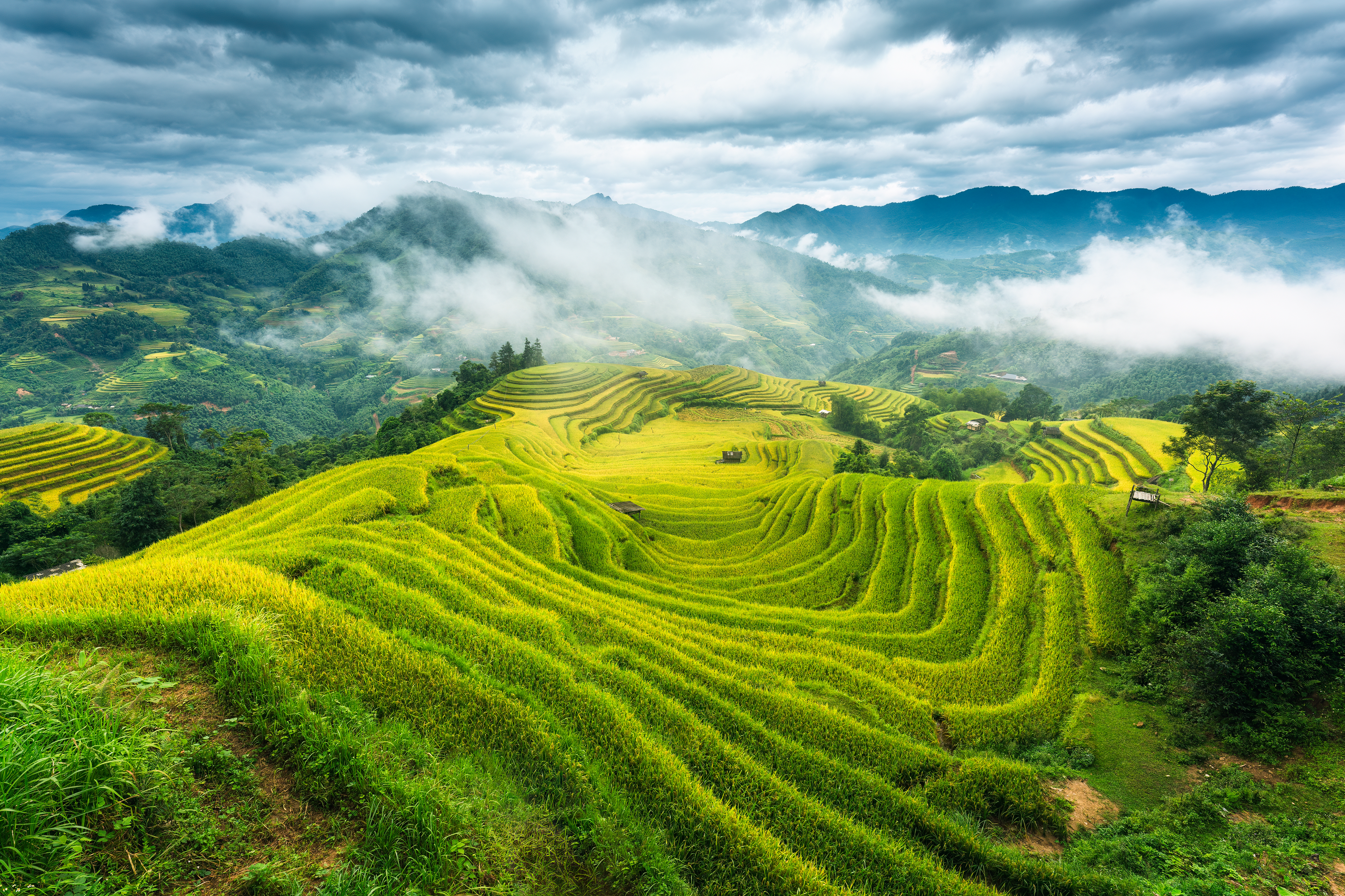 Luotu käyttämällä kuvia, jotka on ottanut/tehnyt Mumemories - "Lush green rice field terraces enveloped in fog during harvest season in countryside at Hoang Su Phi, Vietnam" • icemanphotos - "Beachfront sunset. Beautiful panoramic landscape, colorful golden sunlight over calm sea waves splashing softly on idyllic sandy beach. Amazing sunrise landscape, summer nature, peaceful morning coast"