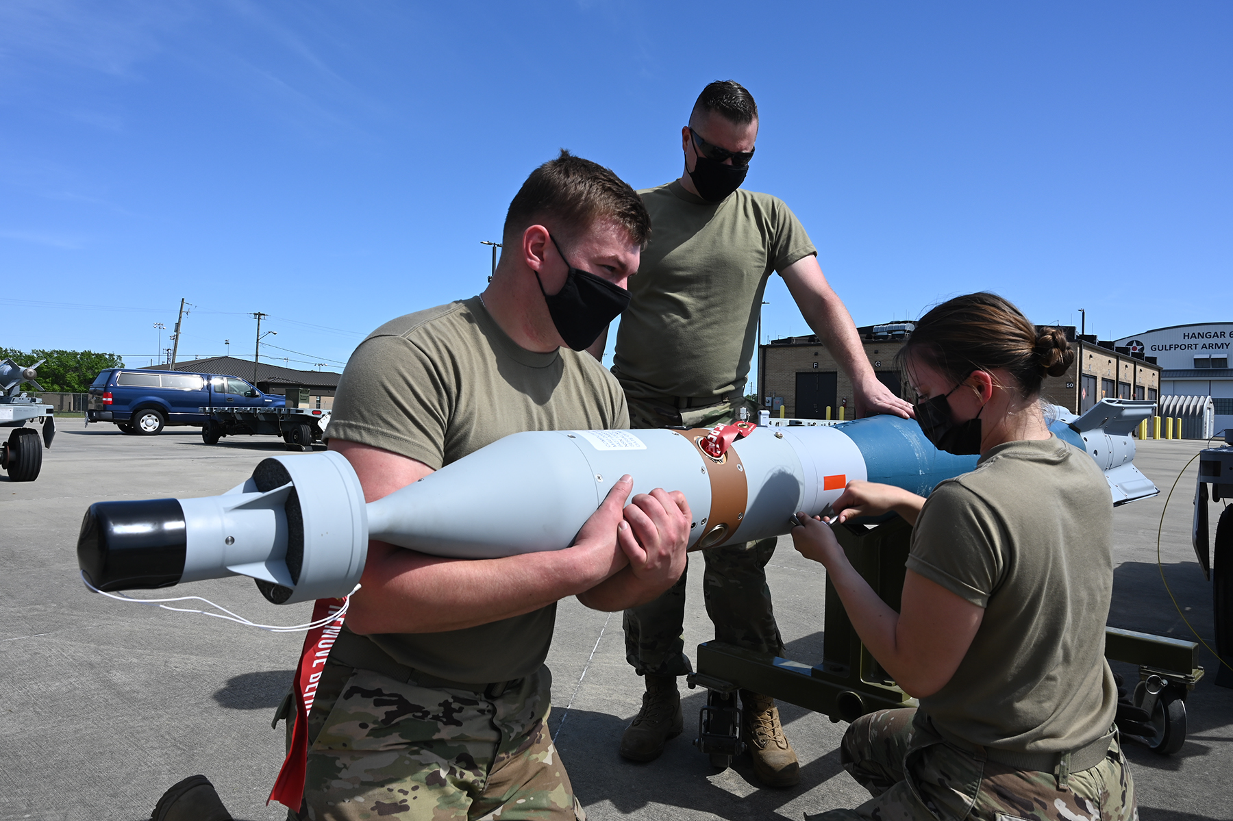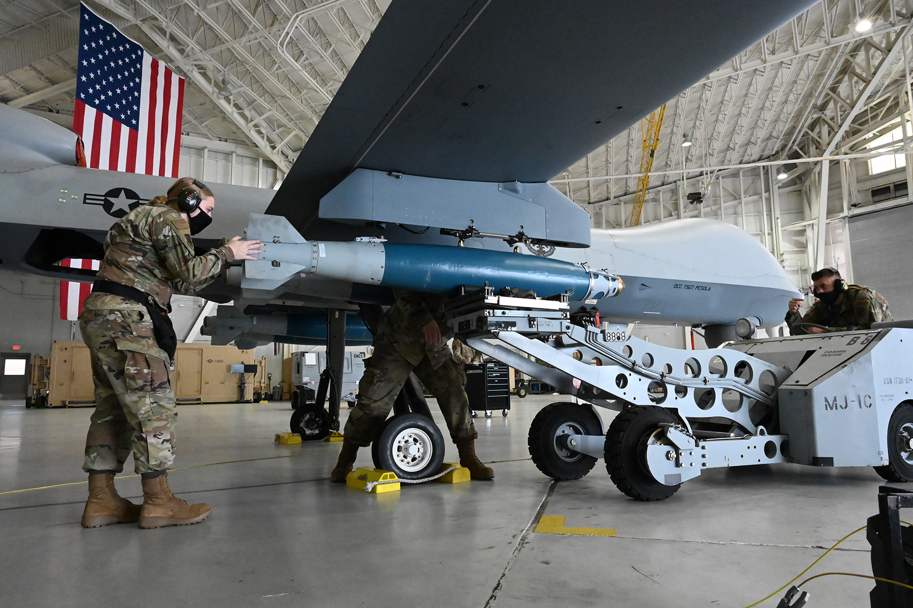 119th Wing Maintenance Squadron members load inert munitions onto an MQ-9 Reaper in the hangar at the Combat Readiness Training Center, Gulfport, Miss., on April 14, 2021.