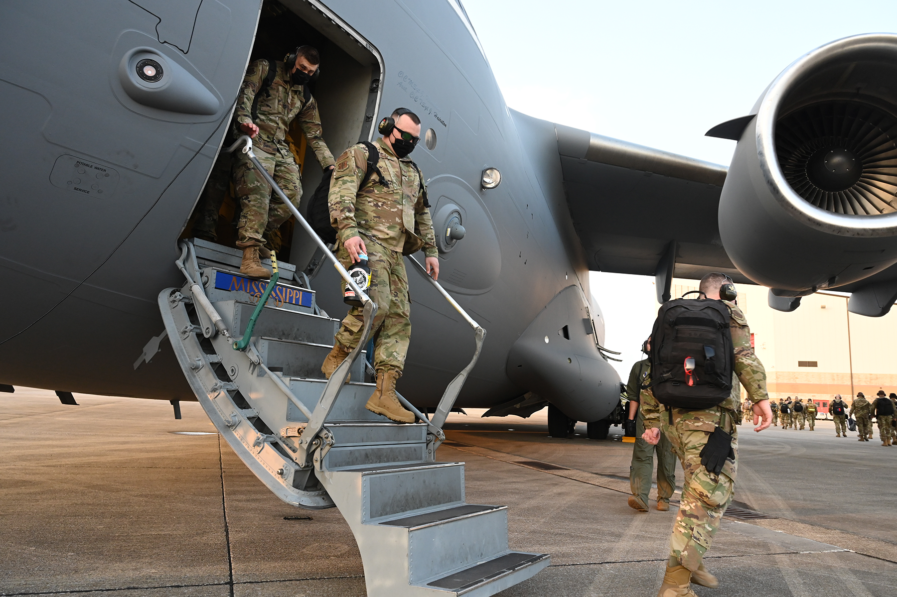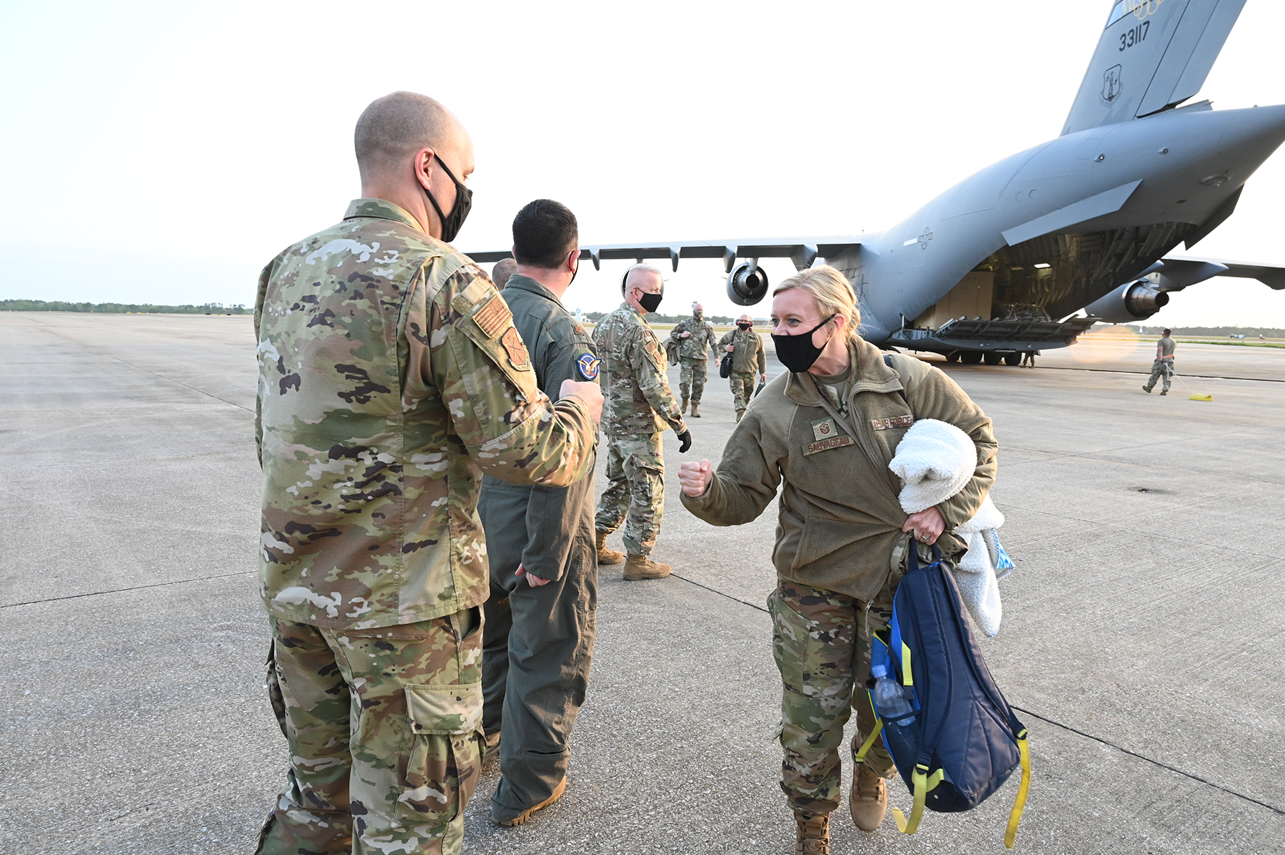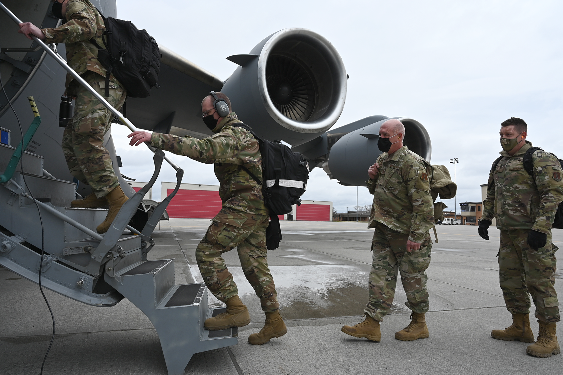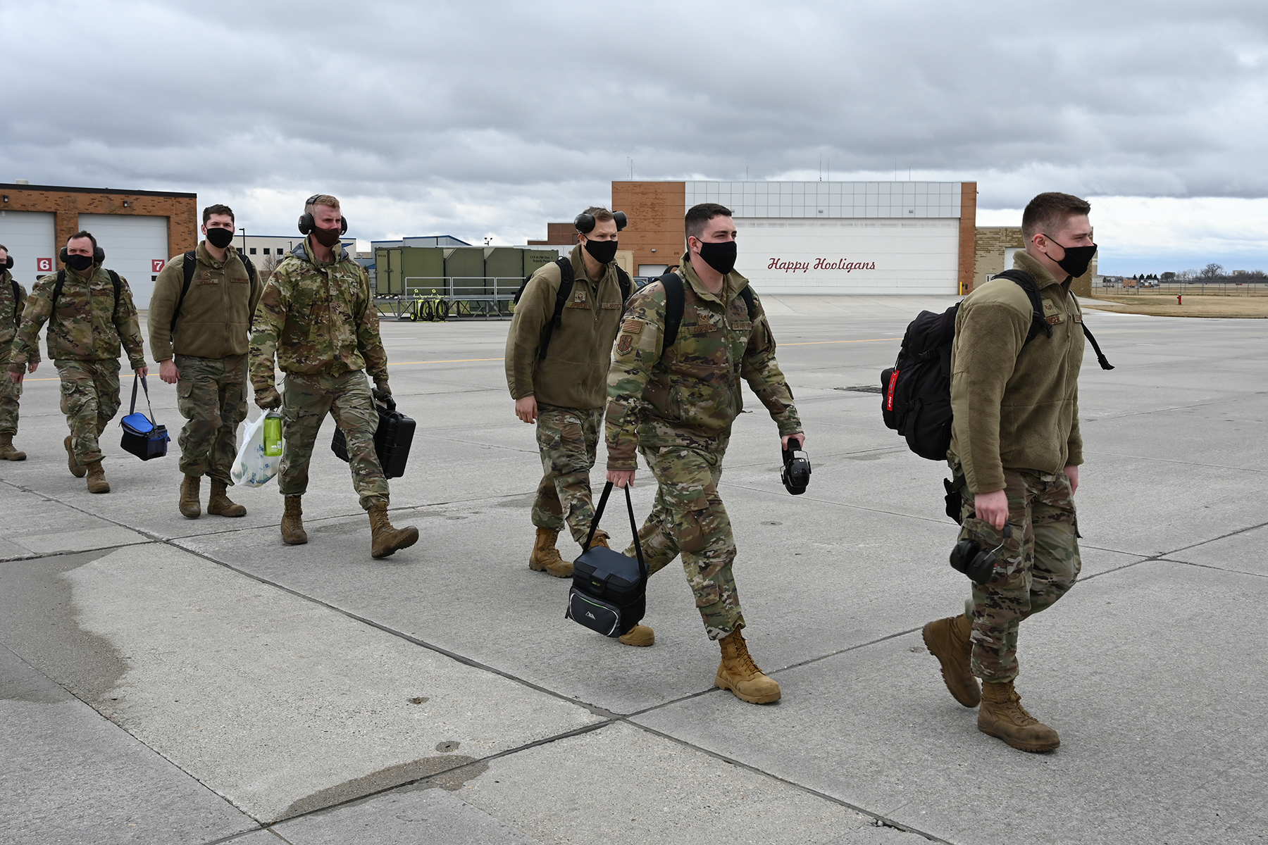 Hooligans of the 119th Wing walk across the flight line as they prepare to board a C-17 Globemaster at the N.D. Air National Guard Base, Fargo, N.D., en route to Exercise Southern Strike 2021 on April 9, 2021.