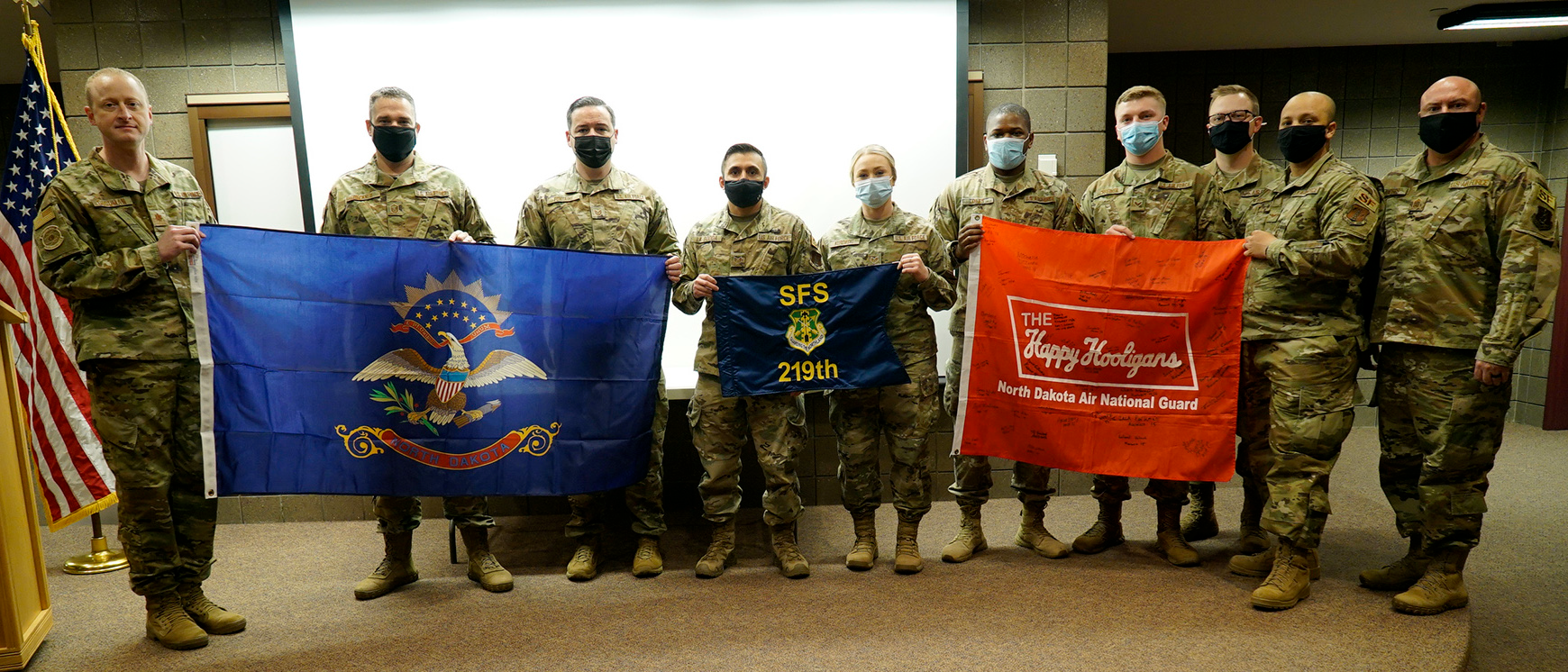 Nine Airmen were honored at a sendoff ceremony at the Minot Armed Forces Center on April 12, 2021. The Airmen, assigned to the 219th Security Forces Squadron (SFS) based at the Minot Air Force Base, Minot, N.D., left April 14 for six months of duty in the U.S. Central Command (CENTCOM) area of operations. (National Guard story and photos by Sgt. 1st Class Charles Highland, N.D. National Guard Public Affairs Office)
