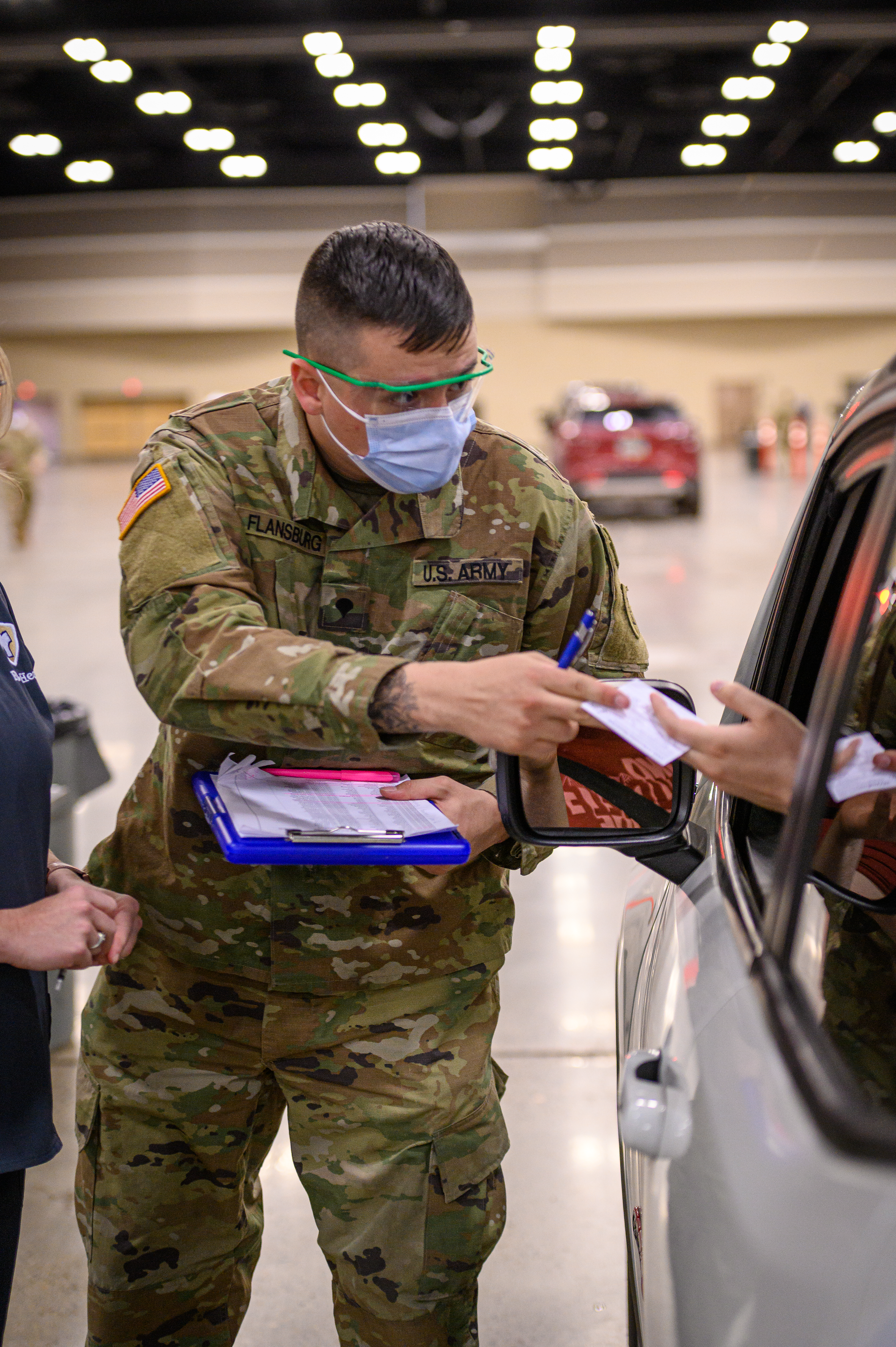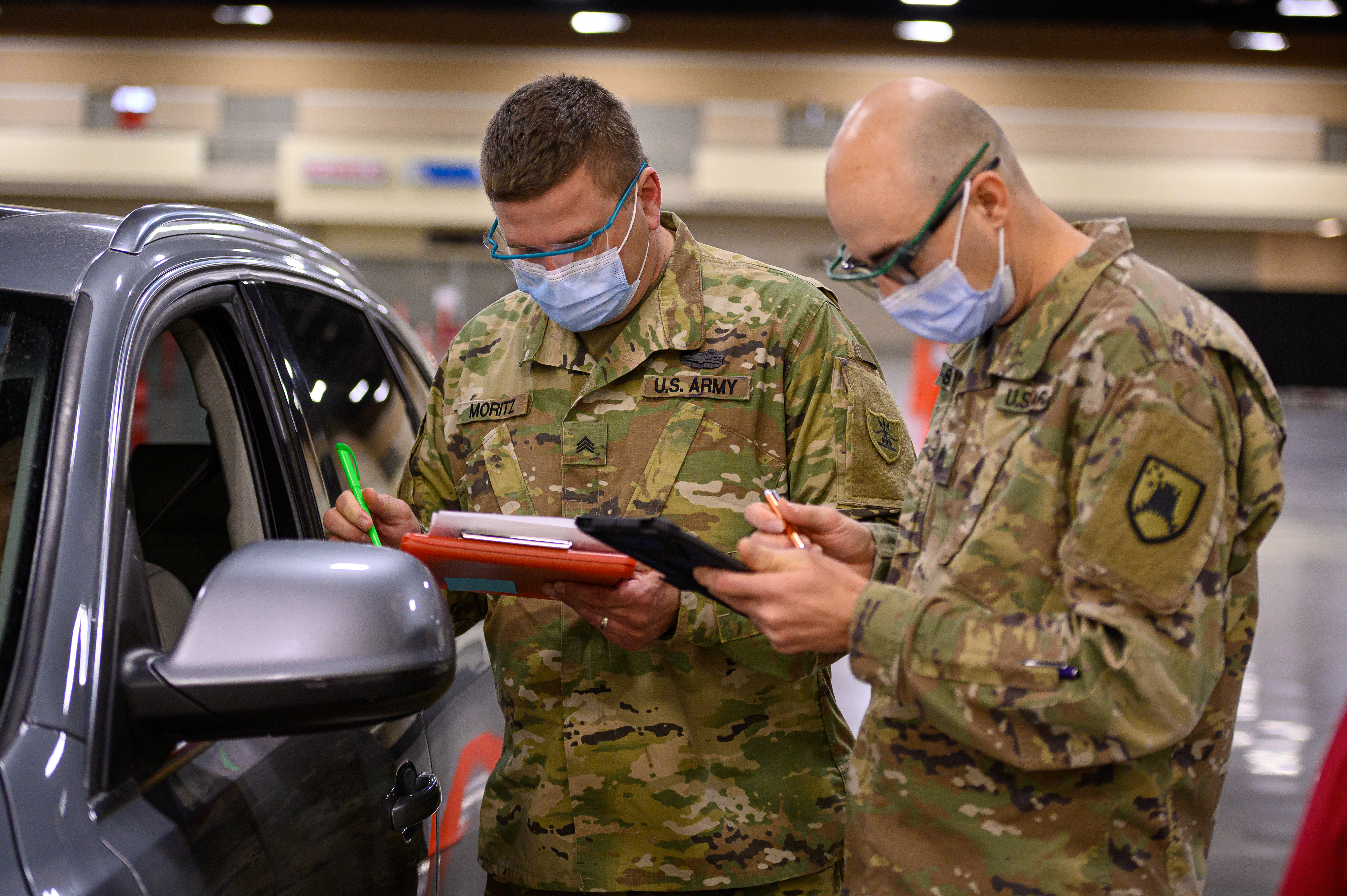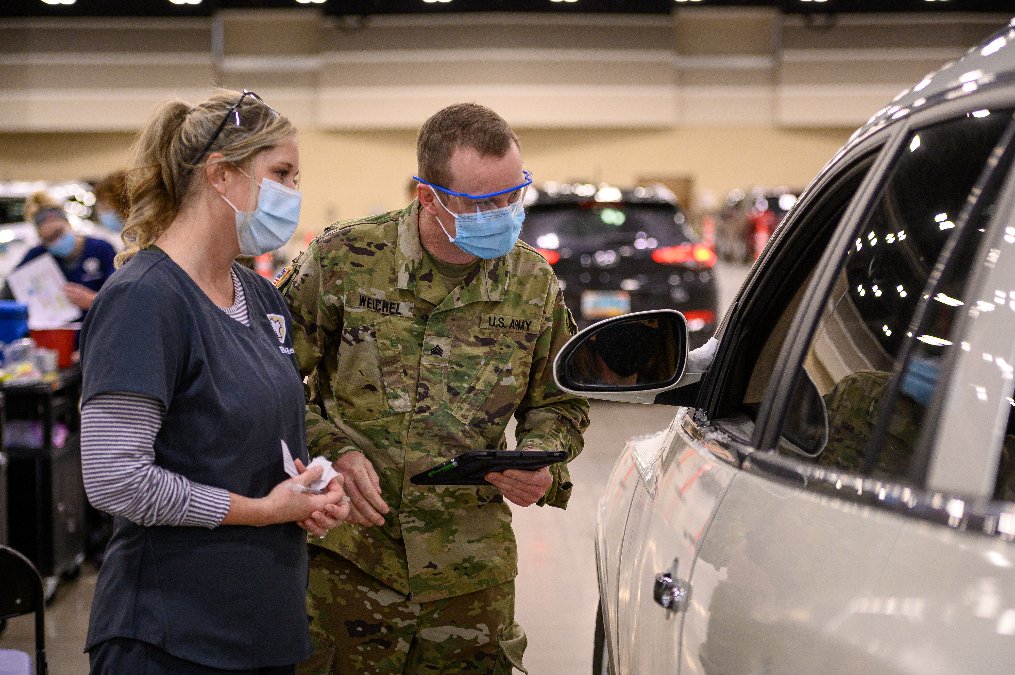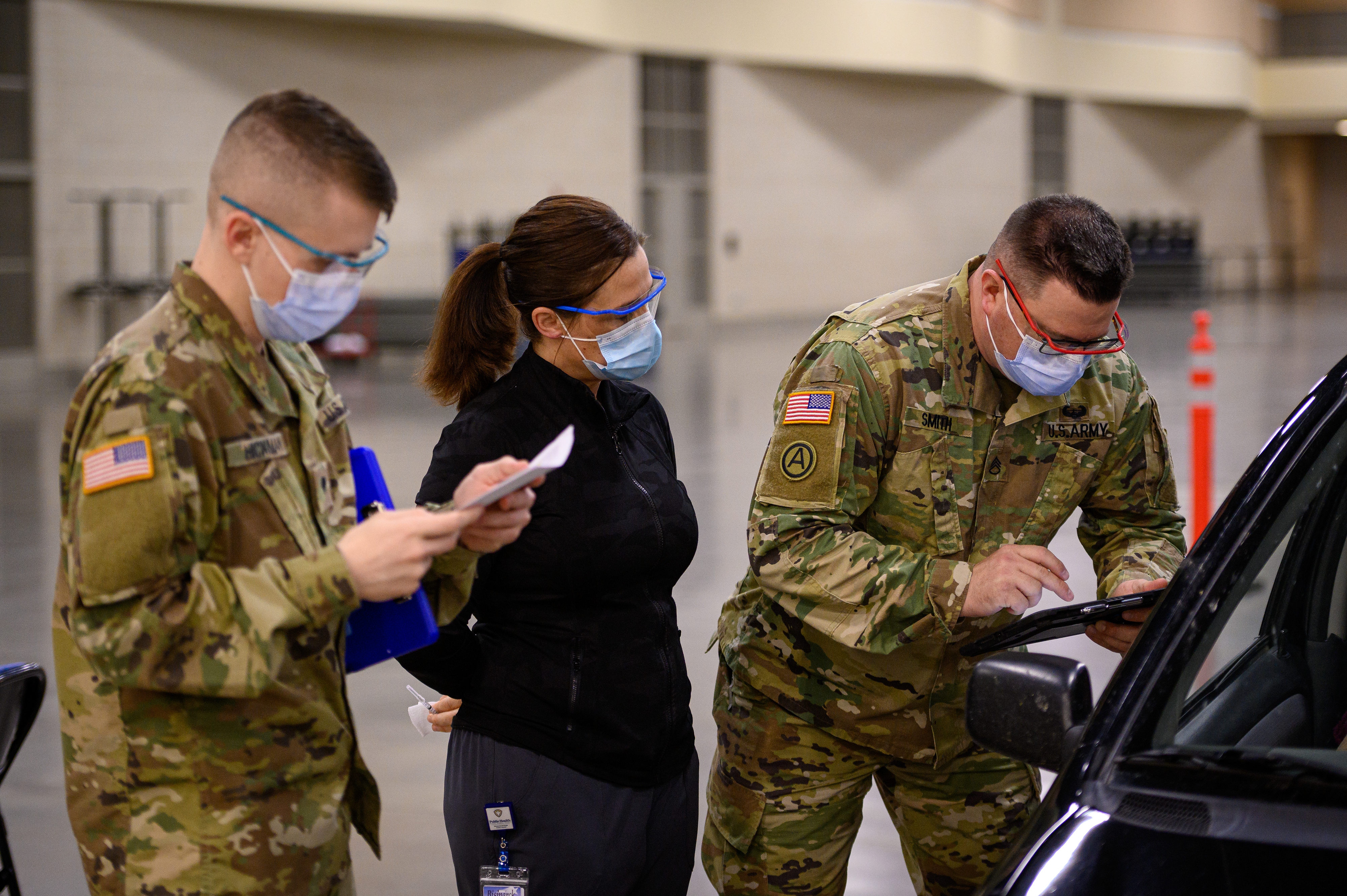 N.D. National Guard Soldiers and Airmen supported Bismarck-Burleigh Public Health in administering drive-through COVID-19 vaccines at the Bismarck Event Center on April 14, 2021. Guard members provided traffic control, collected information, recorded vaccine cards and administered vaccine shots. They also assisted with observing participants for 15 minutes after vaccines were administered to ensure that there were no severe side-efforts.