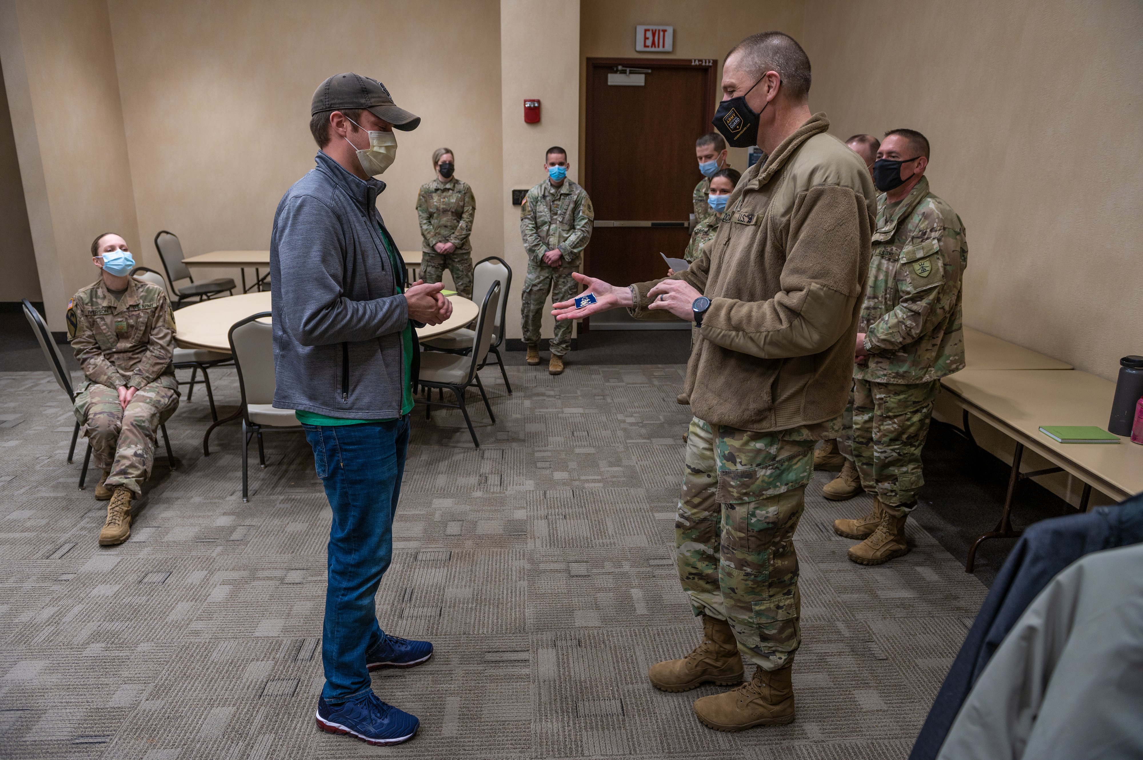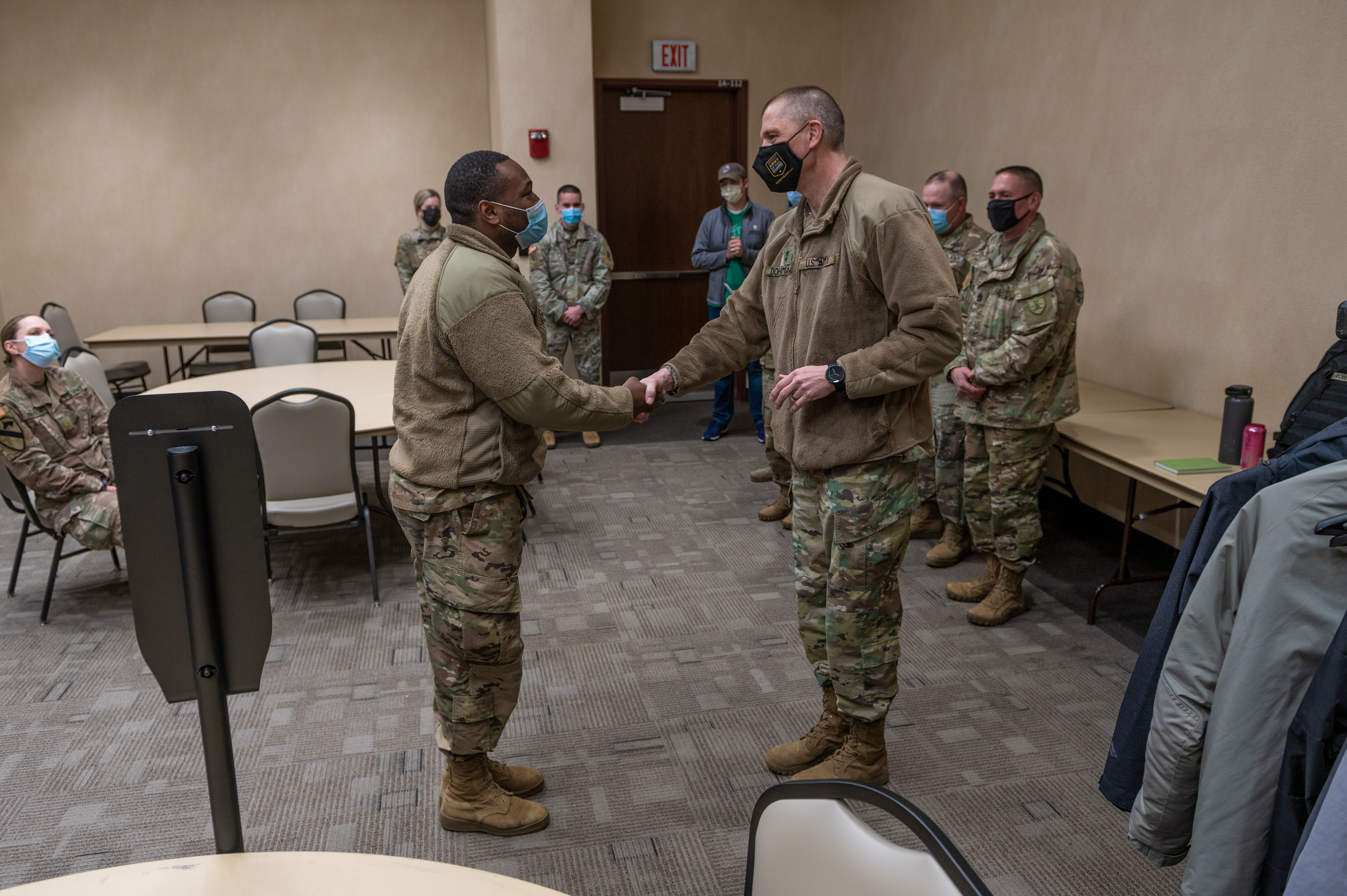 Maj. Gen. Al Dohrmann, N.D. adjutant general, right, presents a challenge coin to Pfc. Yusuf Mustapha in recognition of his professionalism and efficiency while participating in the N.D. National Guard's COVID-19 response efforts, at the Alerus Center in Grand Forks, April 14, 2021.