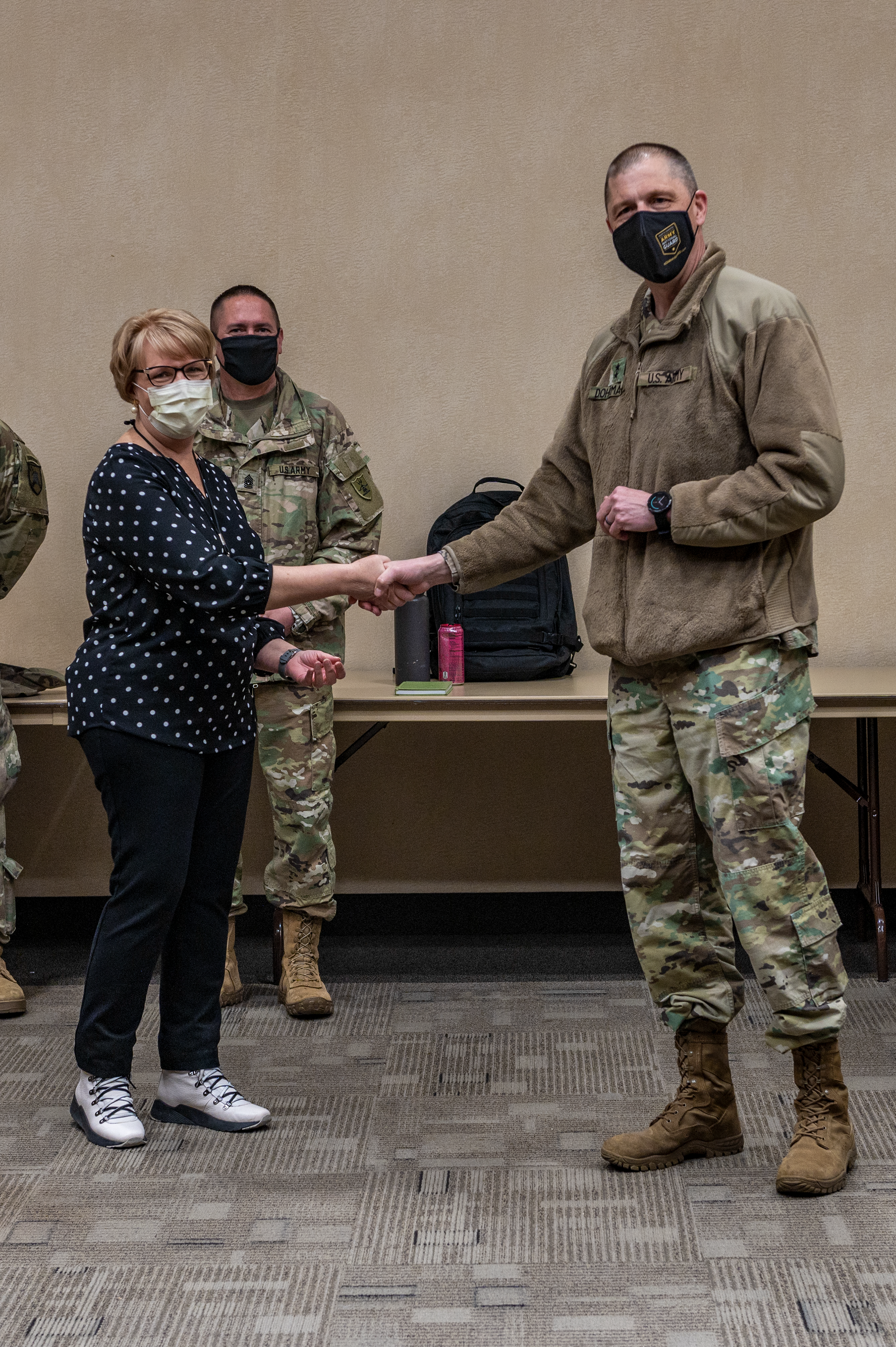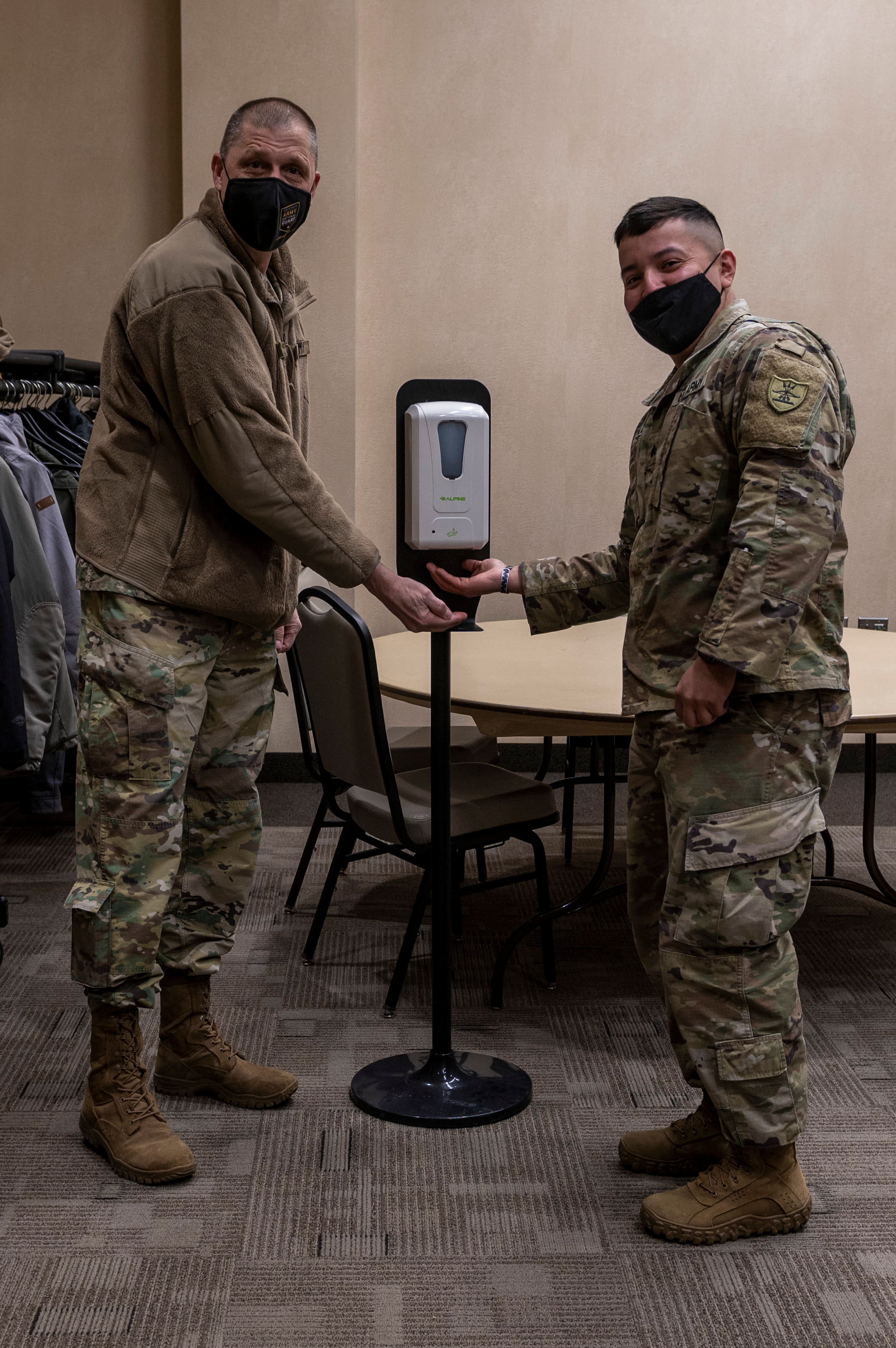 Maj. Gen. Al Dohrmann, N.D. adjutant general, left, and Sgt. Arturo Delacruz, team lead for Region 4, sanitize their hands after Delacruz received a challenge coin for his leadership and commitment to duty in support of the N.D. National Guard's COVID-19 response mission at the Alerus Center, Grand Forks, April 14, 2021.