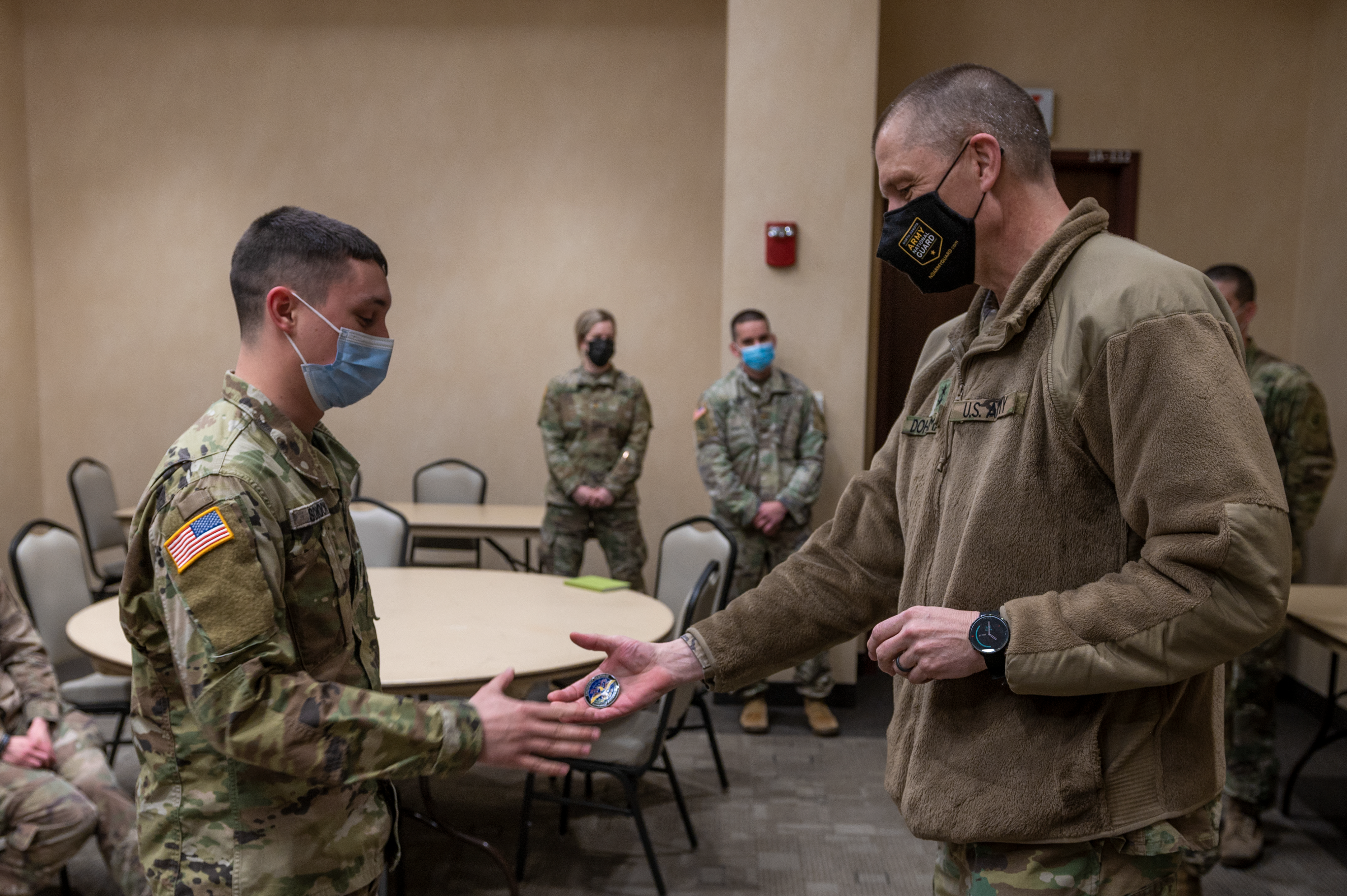 Maj. Gen. Al Dohrmann, N.D. adjutant general, right, presents a challenge coin to Spc. Dylan Schock in recognition of his professionalism and positive impact while participating in the N.D. National Guard's COVID-19 response efforts, at the Alerus Center in Grand Forks, April 14, 2021.