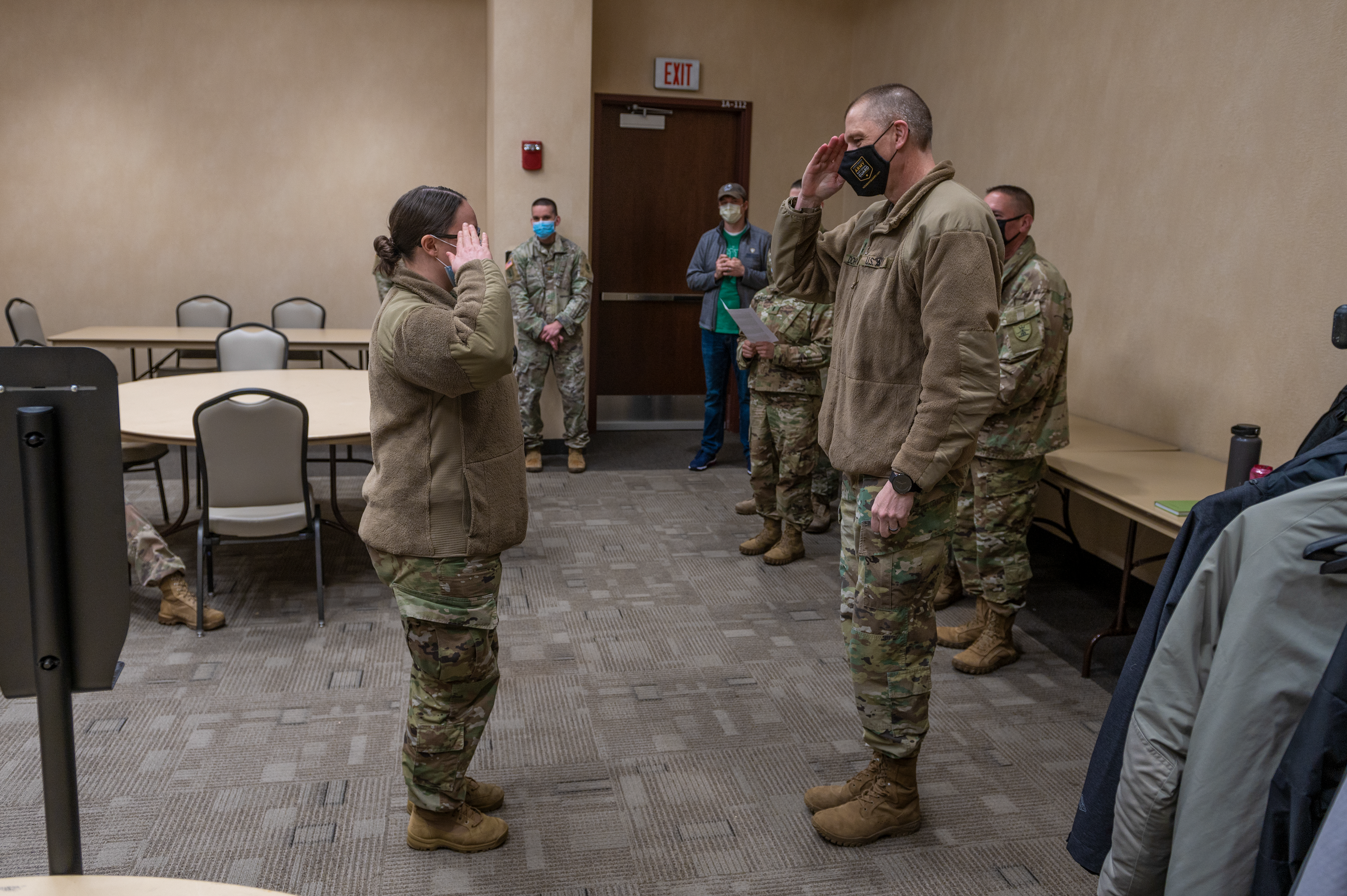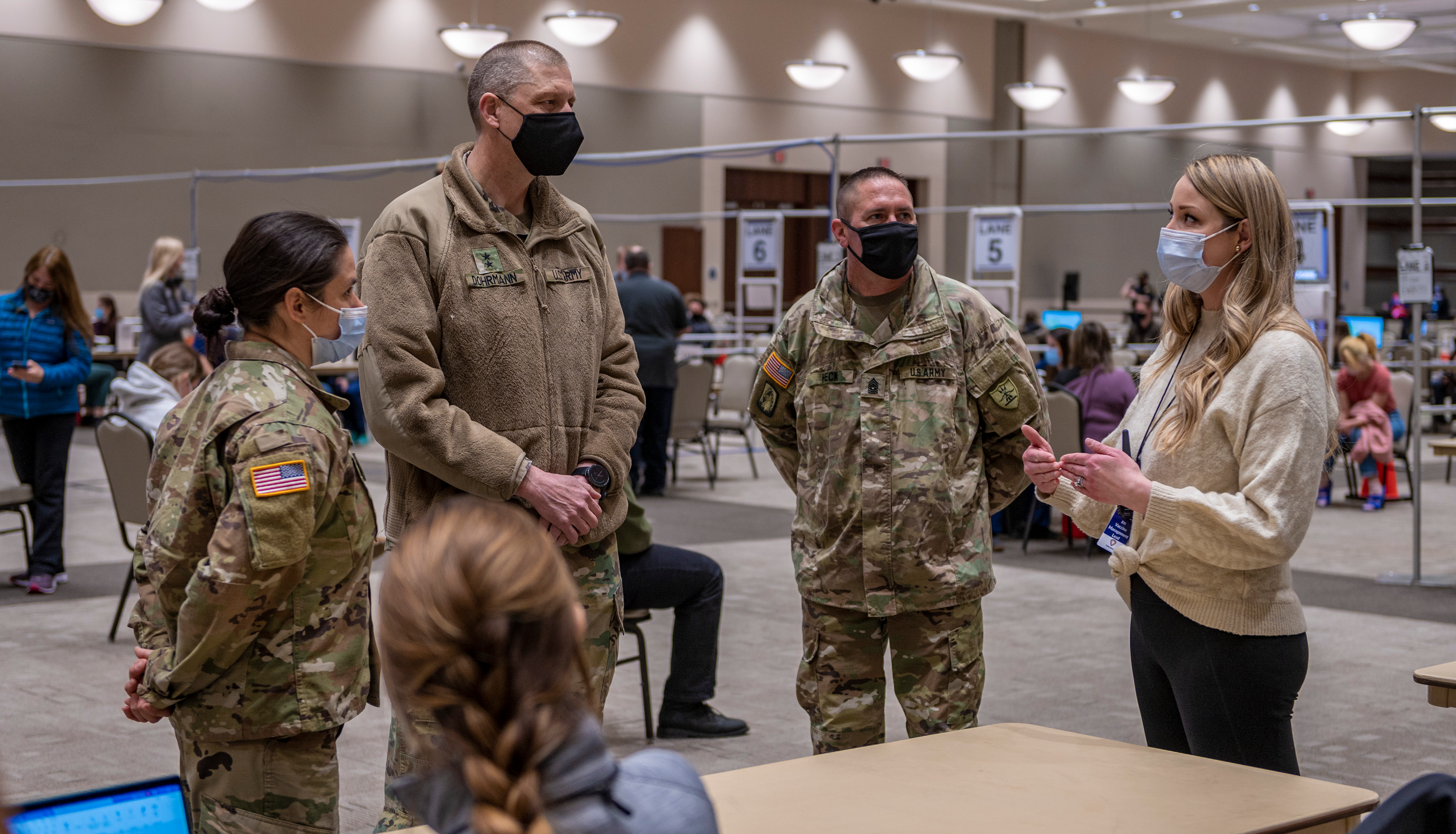 Maj. Gen. Al Dohrmann, N.D. adjutant general, and Command Sgt. Maj. Derek Heck, N.D. National Guard state command sergeant major, traveled to the Alerus Center in Grand Forks on April 14, 2021 to meet with COVID-19 responders. They toured the vaccination site and were briefed on operations. Dohrmann recognized the extraordinary efforts of seven Soldiers and two civilians from the Grand Forks Public Health office. (National Guard story and photos by Officer Candidate Michaela C.P. Granger, N.D. National Guard Public Affairs Office)