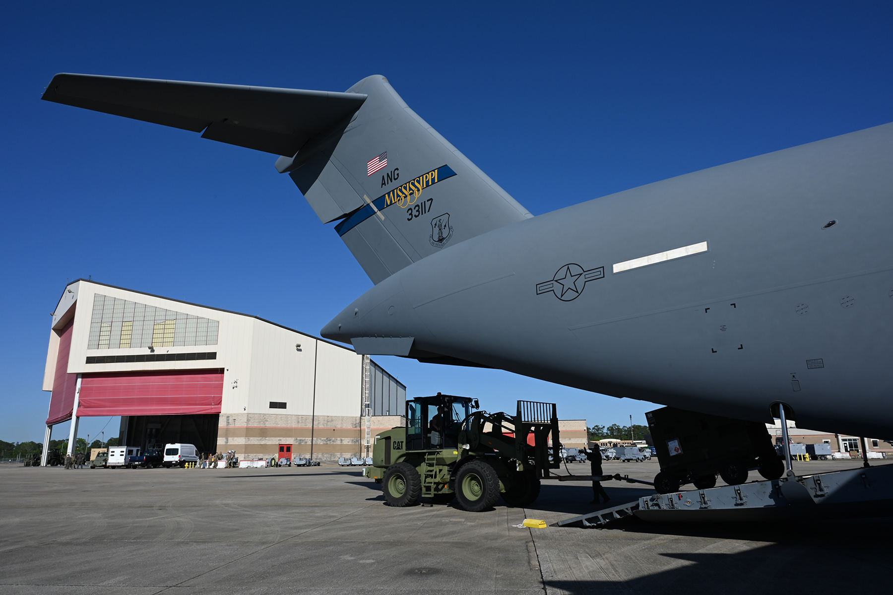 119th Wing members unload cargo from a Mississippi Air National Guard C-17 Globemaster in front of the hangar at the Combat Readiness Training Center, Gulfport, Miss., on April 11, 2021, in support of the wing’s participation in Exercise Southern Strike 2021.