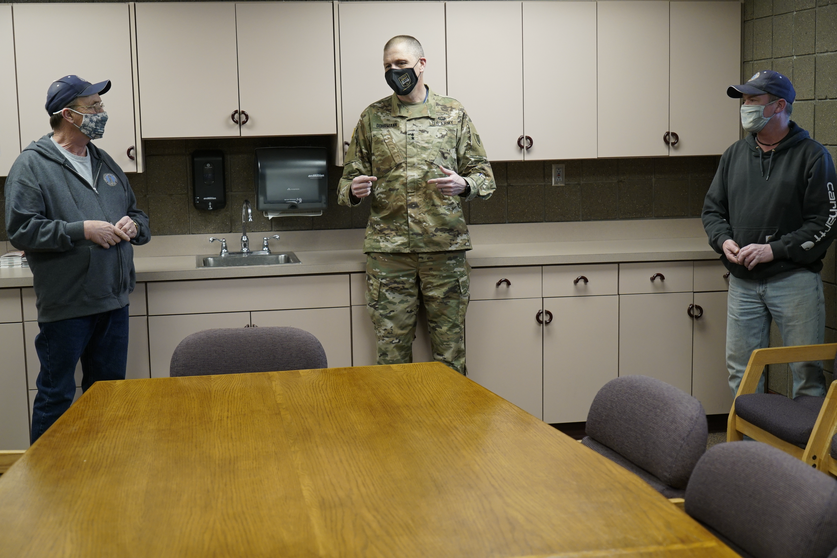 Maj. Gen. Al Dohrmann, N.D. adjutant general, awarded coins to Steve Brunelle, Elliot Johnson and Joel Brenna at the Minot Armed Forces Reserve Center on April 12, 2021. The team was presented recognition coins for their assistance in hosting the North Central Veterans Stand Down. The event helped nearly 200 Veterans and 35 family members connect with service available through Veteran and government organizations. (National Guard story and photo by Sgt. 1st Class Charles Highland, N.D. National Guard Public Affairs Office)