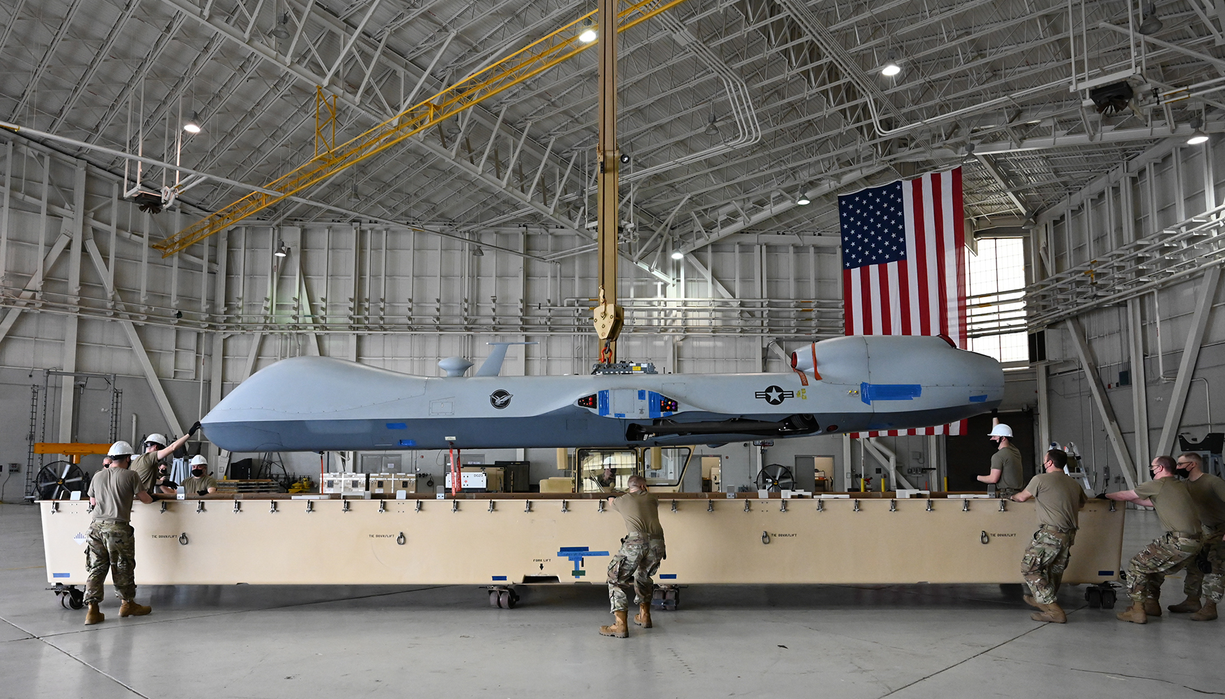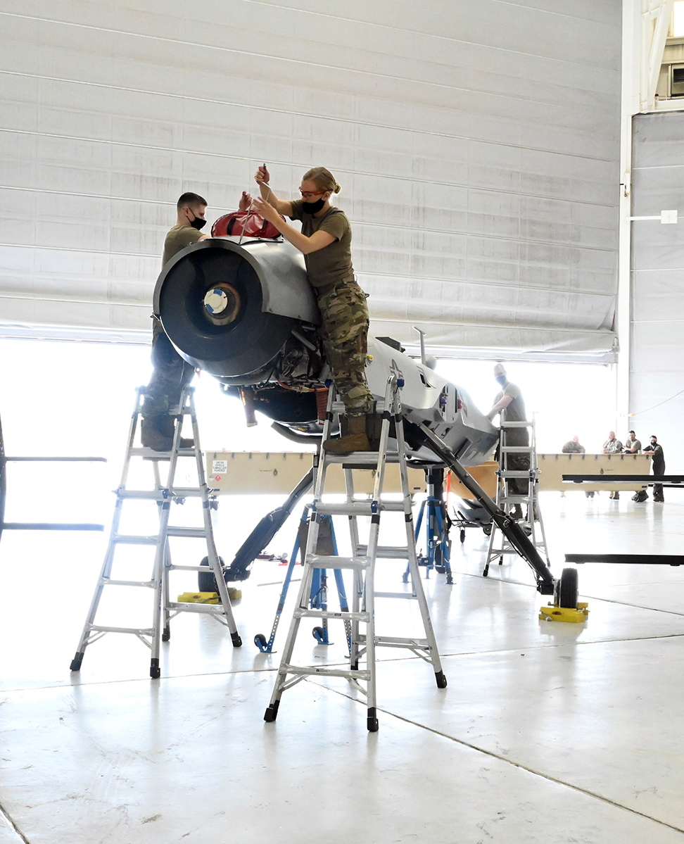 Airmen of the 119th Wing maintenance squadron unpack an MQ-9 Reaper in a hangar at the Combat Readiness Training Center, Gulfport, Miss., April 10, 2021. (U.S. Air National Guard photo by Chief Master Sgt. David H. Lipp, 119th Wing)