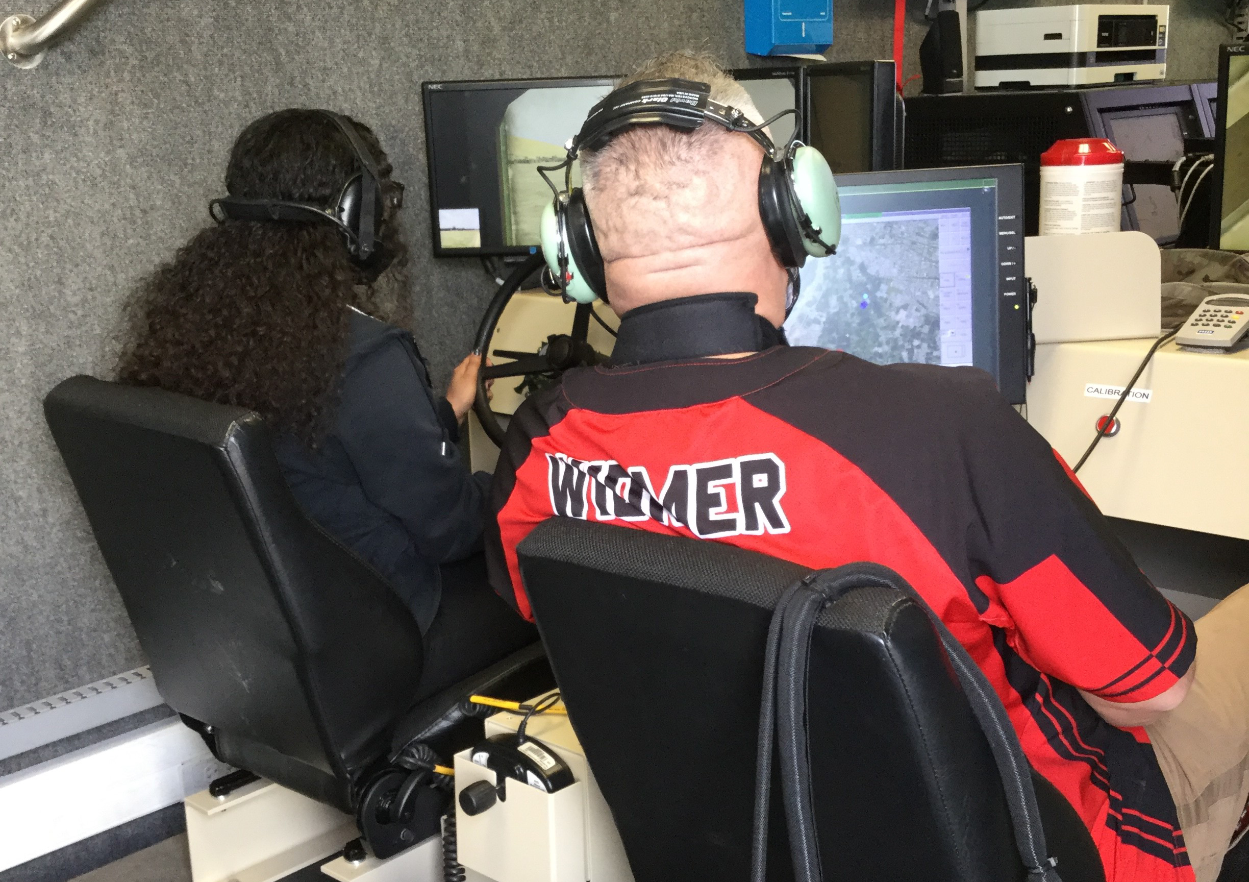 About 55 JROTC cadets and 40 students from Devils Lake High School experienced the Vehicle Convoy Operator Trainer (VCOT). This trailer-mounted simulator has four stations with three positions each (driver, assistant driver and gunner for security) allowing up to 12 individuals to train simultaneously in military convoy operations. Each of the four stations represents a High Mobility Multi-purposed Wheeled Vehicle (HMMWV) in convoy. This trainer helps develops leadership and communication skills.