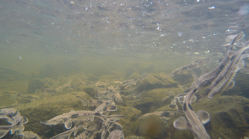 To the right, a large group of juvenile Lake Sturgeon are seen clustering around rocks on a shallow bank. (Used with permission of Scott Schlueter/USFWS)