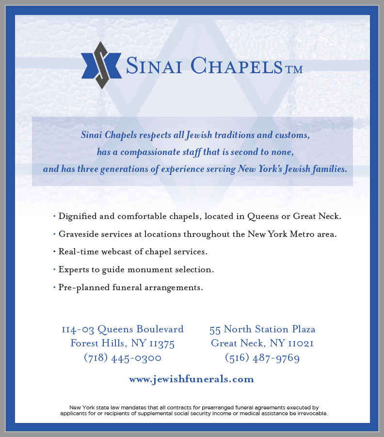 • Joan Weiner ~ Thank you to everyone for your thoughtful calls, your lovely emails, and the beautiful cards that were sent to me on the passing of my beloved son, Lewis Wiener.