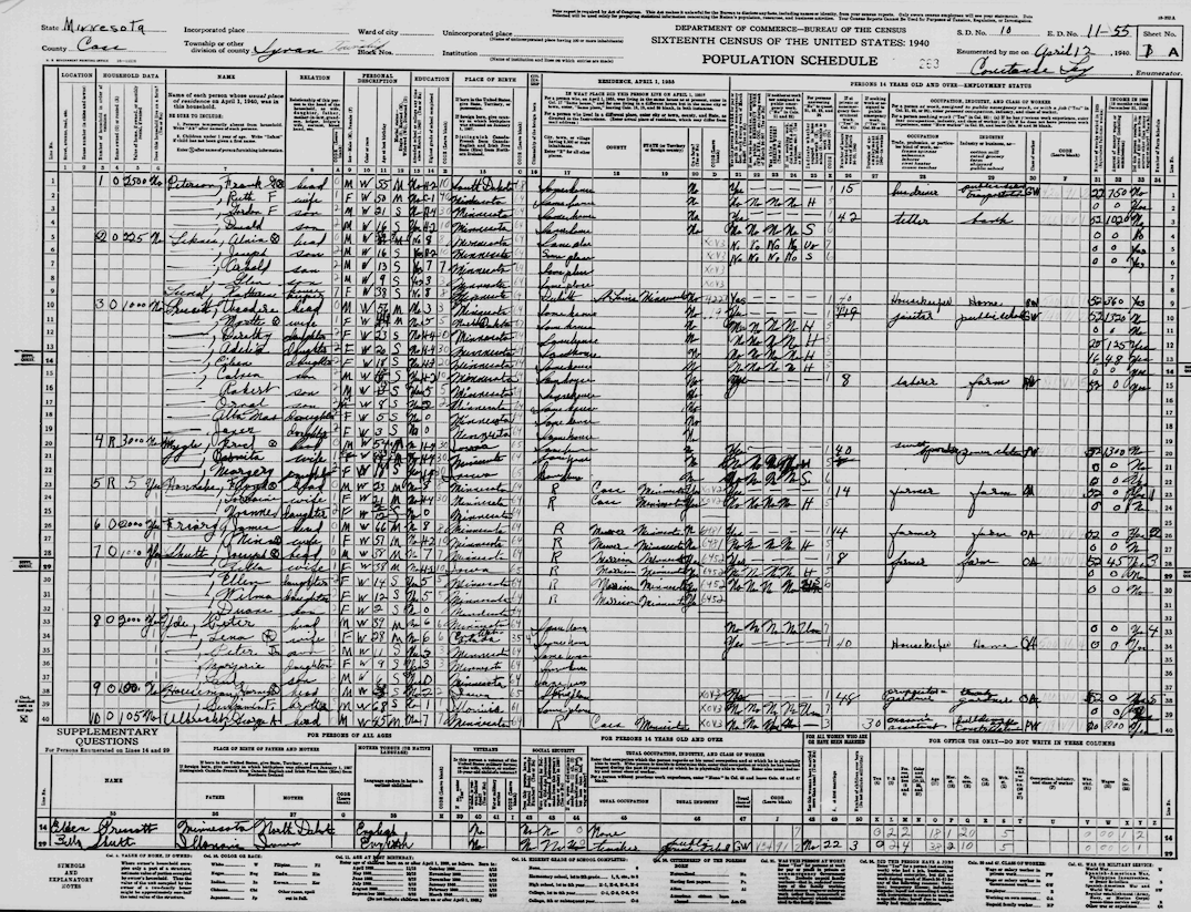 Father Fred Wygle was listed as working in Minnesota at a power station – his grandson later specified Fred Wygle worked at the Crow Wing Dam. Wygle's wife Bonita and daughter Margery were also listed as part of the household in 1940.
