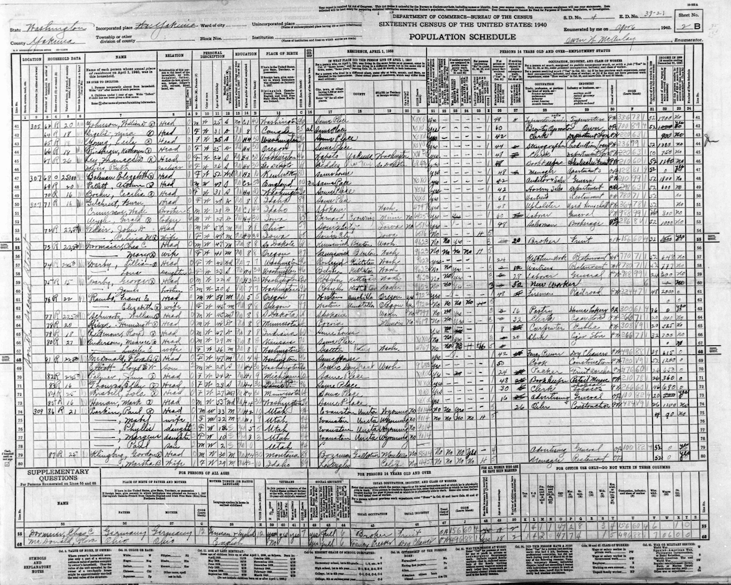 Earlier research had already found mention of Gerald Wygle living in Seattle, Washington, around 1943, and U.S. Census records from 1940 listed him as a general laborer in Yakima County, Washington. He had been born in Iowa but relocated to the Evergreen State from Minnesota, according to the hand-written census. A cursive letter "D" in the twelfth column of the page indicated Wygle was divorced. Other census records that year listed a 5-year-old Donald Wygle as part of his grandparents' household in Cass County, Minnesota.