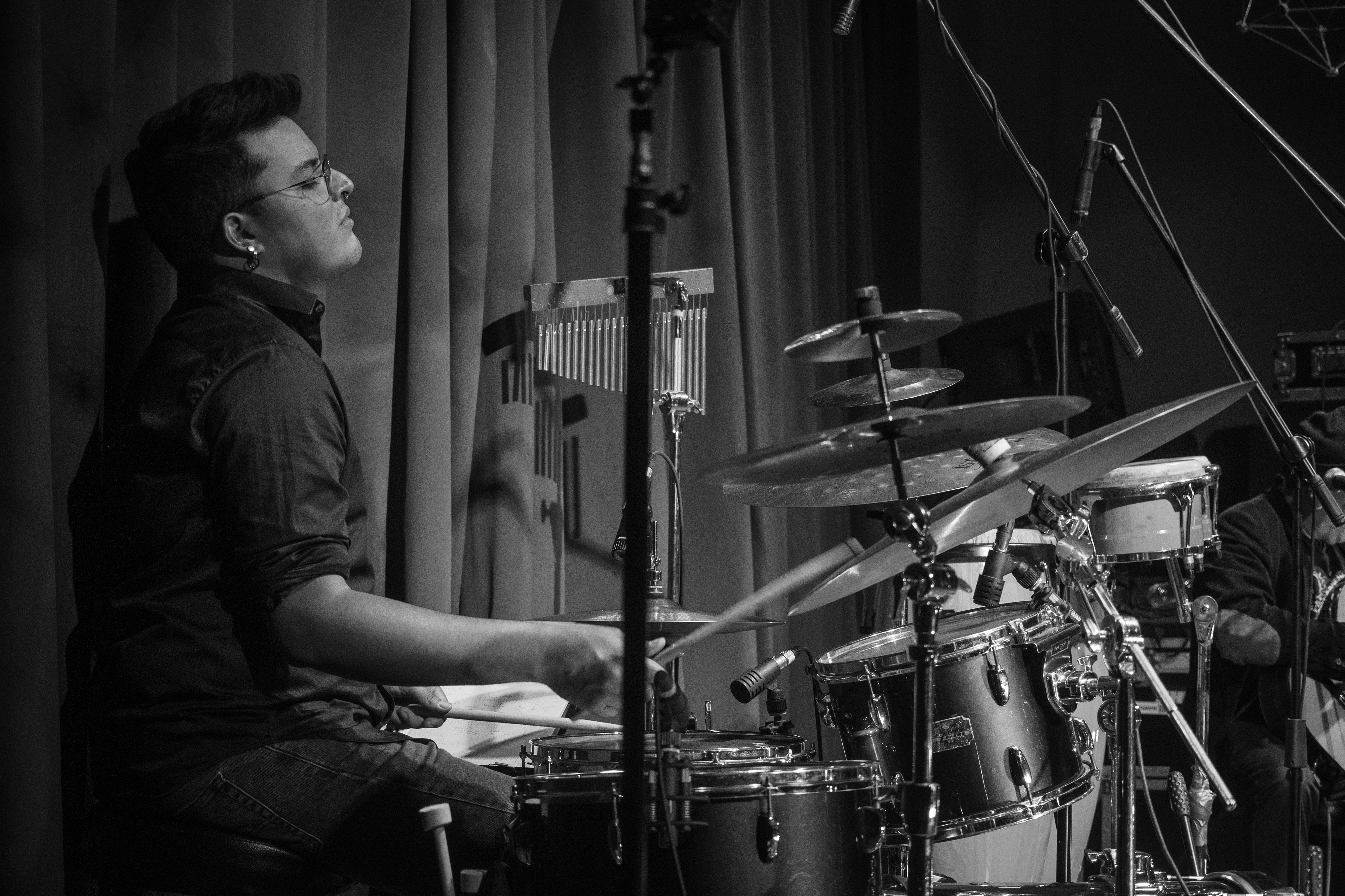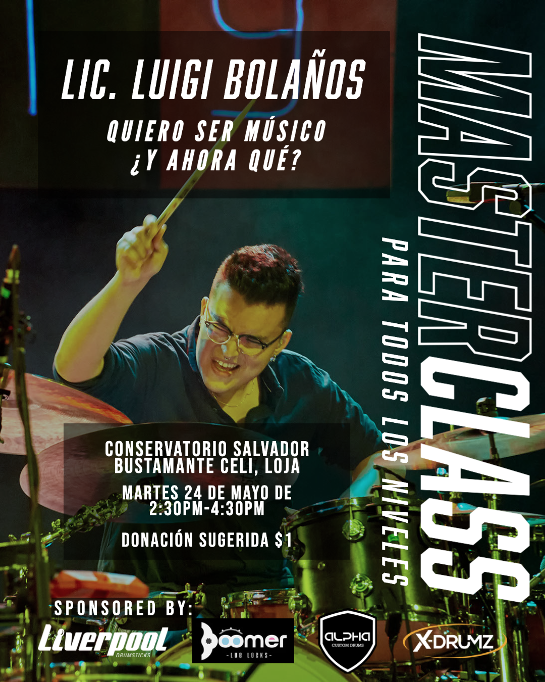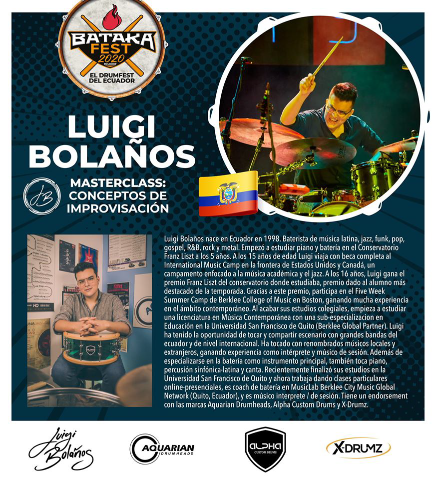 Luigi Bolaños (Ecuador, 1998) es baterista, percusionista, productor musical, compositor y educador. Inició su formación a los 5 años en el Conservatorio Franz Liszt de Quito, estudiando piano y batería. A los 15 años obtuvo una beca para el International Music Camp en EE.UU./Canadá, y al año siguiente fue galardonado con el Premio Franz Liszt al mejor alumno del conservatorio, lo que lo llevó al Five Week Summer Camp de Berklee College of Music en Boston.