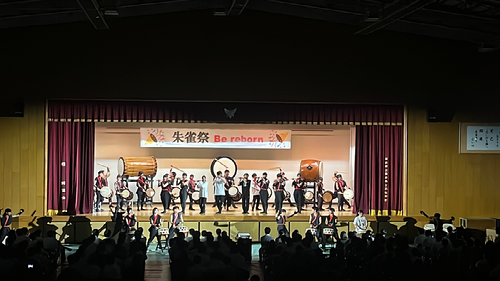 2曲目は「遙か」です。笛の数や小物の数も増やし、全員でステージに立ちました。全員で舞台の上で打つのは最後となり、寂しさもありますが、全員が楽しそうに太鼓を打っていました。