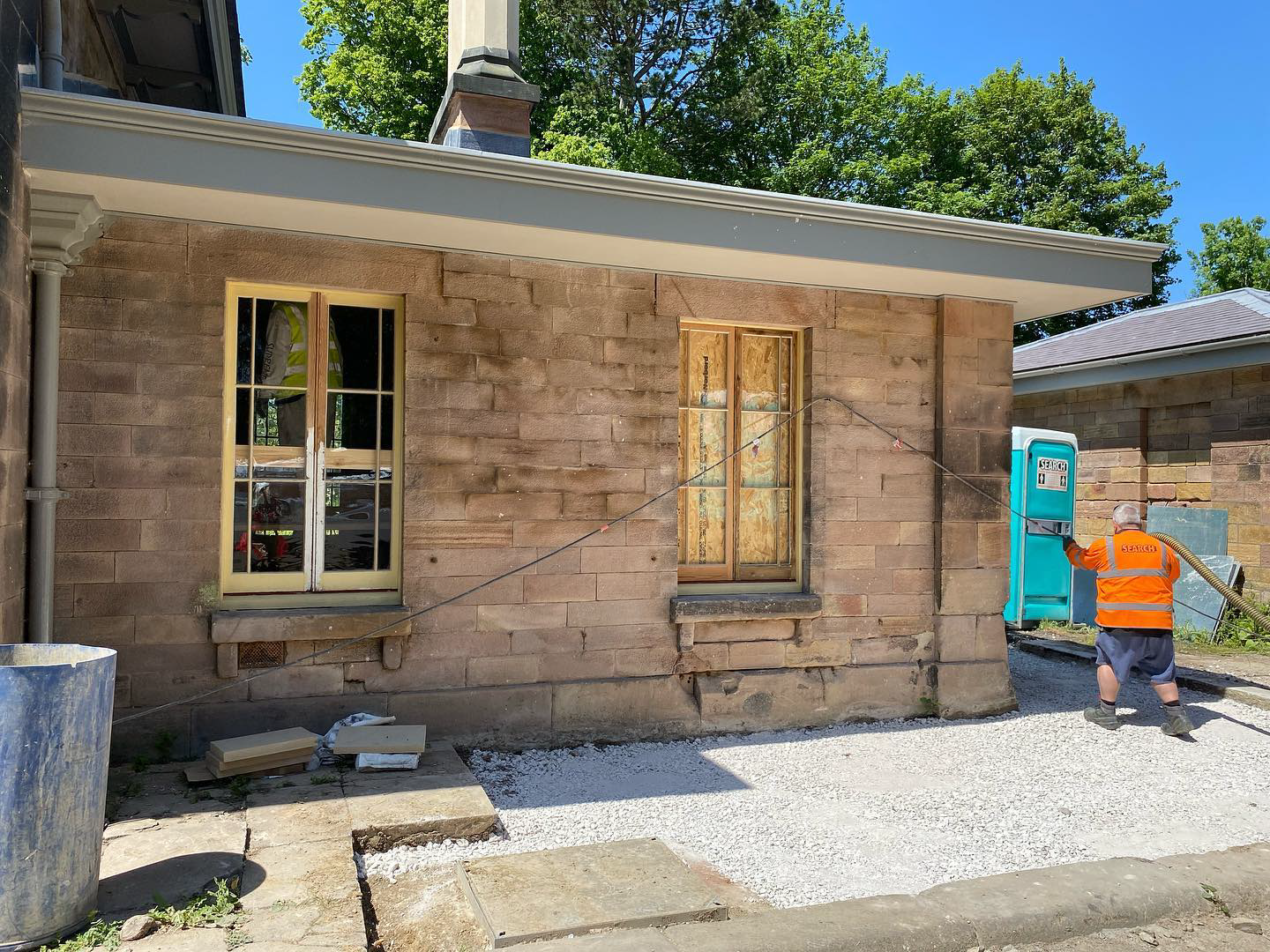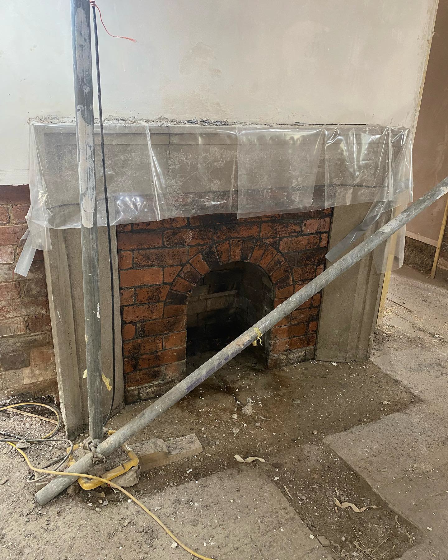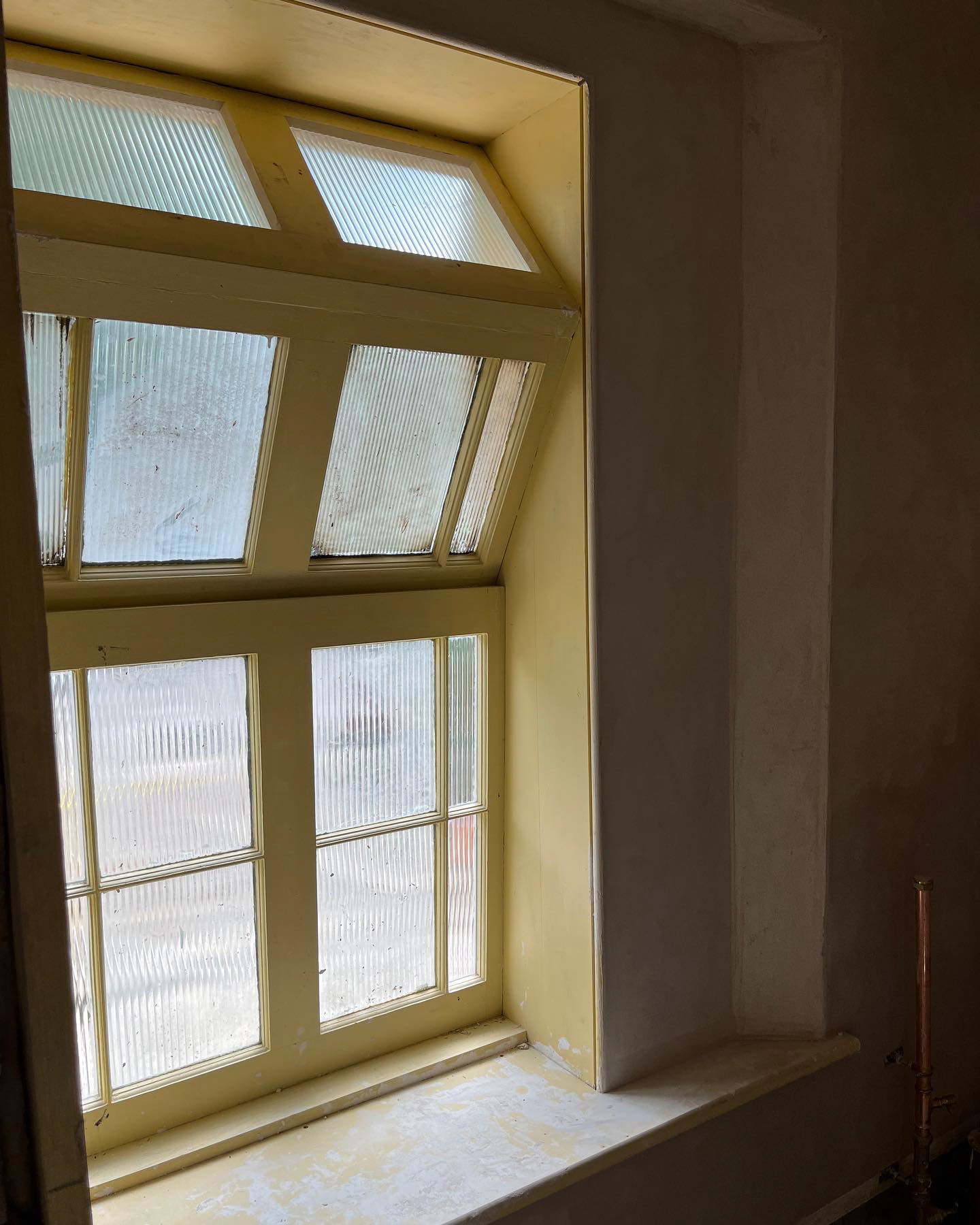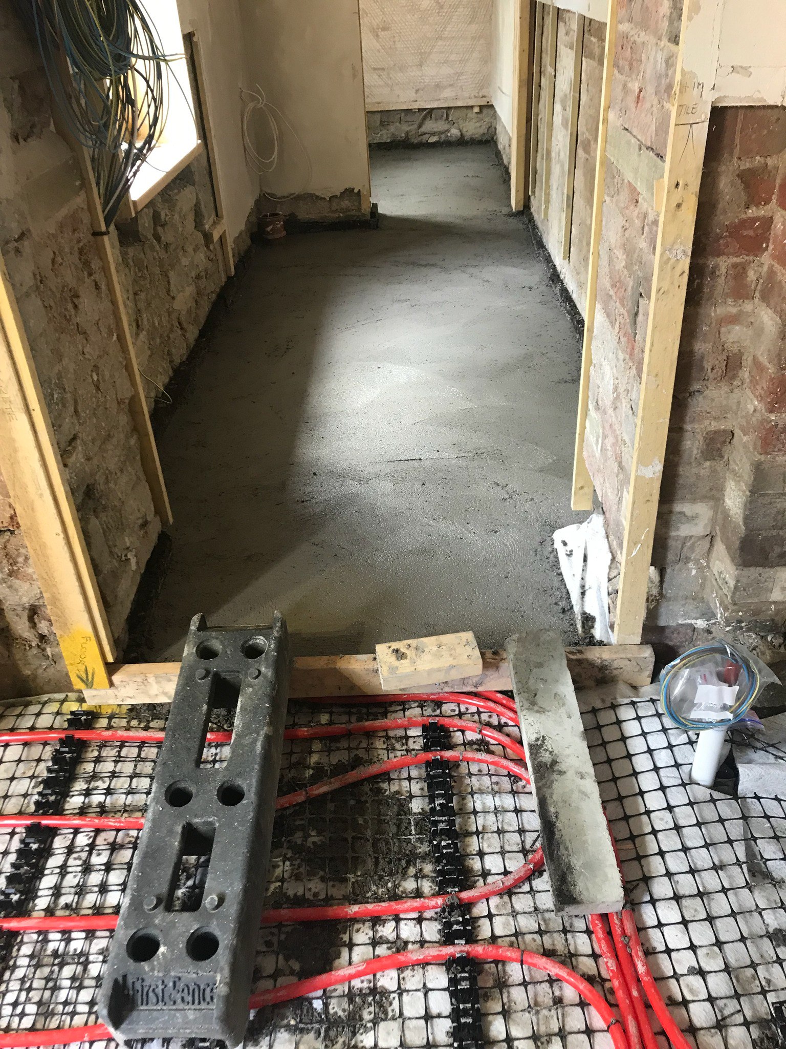 Later on this month, following the 28 day curing period for the floor, the plaster cornice work will be completed. The water connection is also booked in for this time. The window repairs and glazing are now complete and external door repairs are well underway.