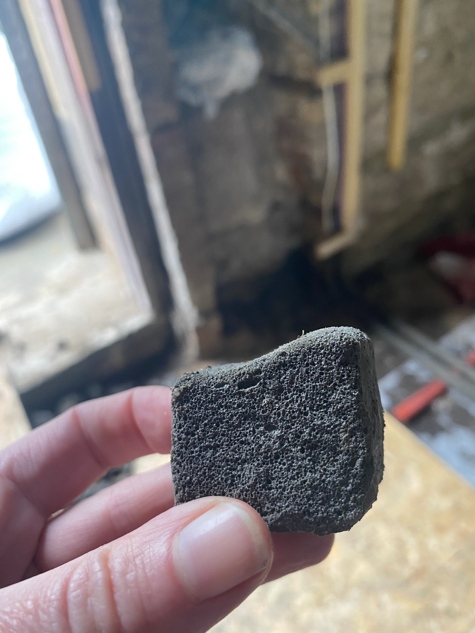 The substance with a coal like appearance, below, is Geocell, which is actually a foam glass aggregate made from 99% recycled glass. It is an insulation material for underground use and is both economical and environmentally sound. It is surprisingly light weight and combines a drainage layer and insulation in a single product, thus reducing the depth required for floors etc.