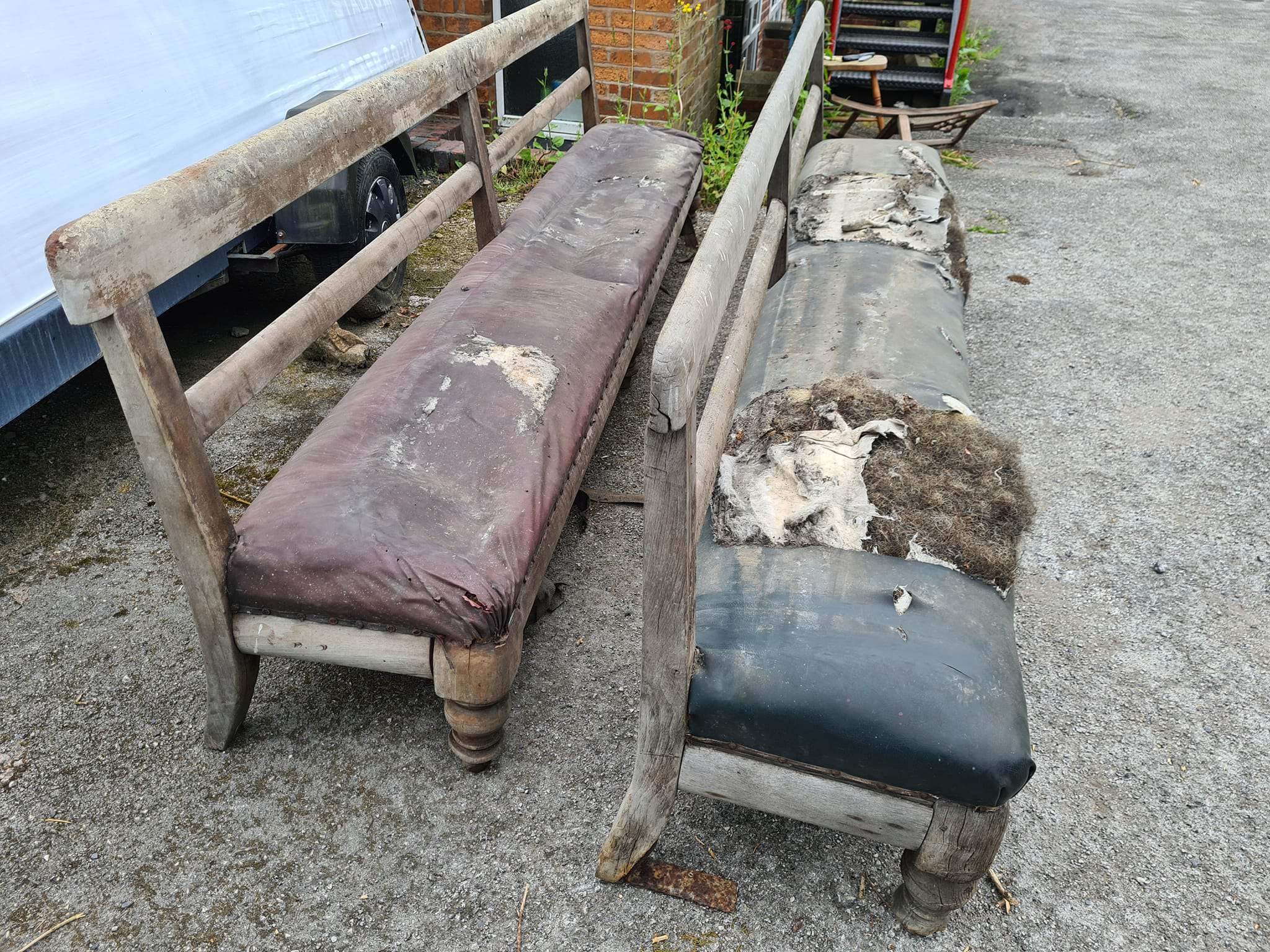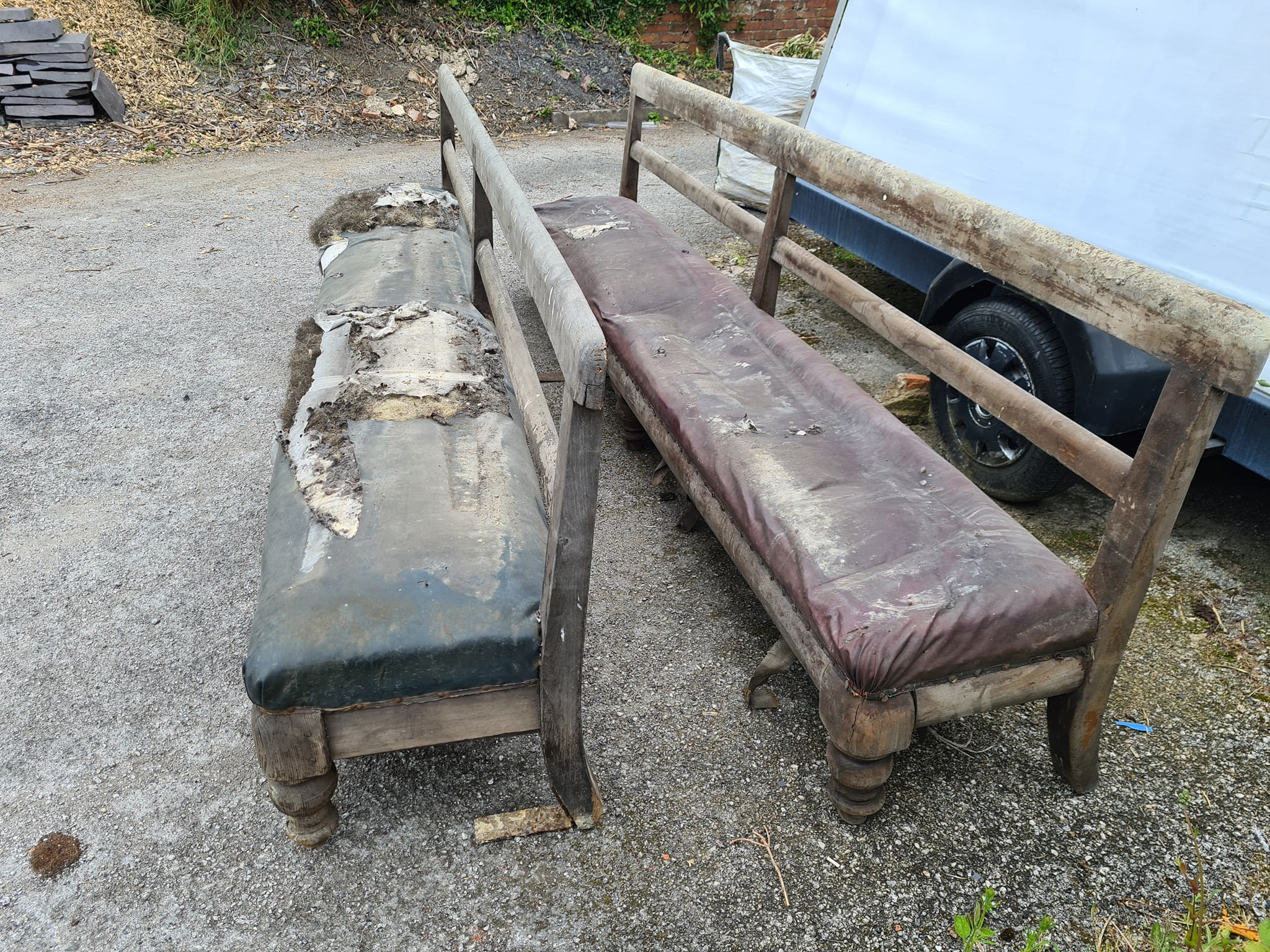They've being drying out in Andrew's workshop for the last few weeks. The refurbishment process will then involve French polishing, ageing, waxing and fitting the new base boards for the seats. They need a lot of work but we can't wait to see the finished product!
