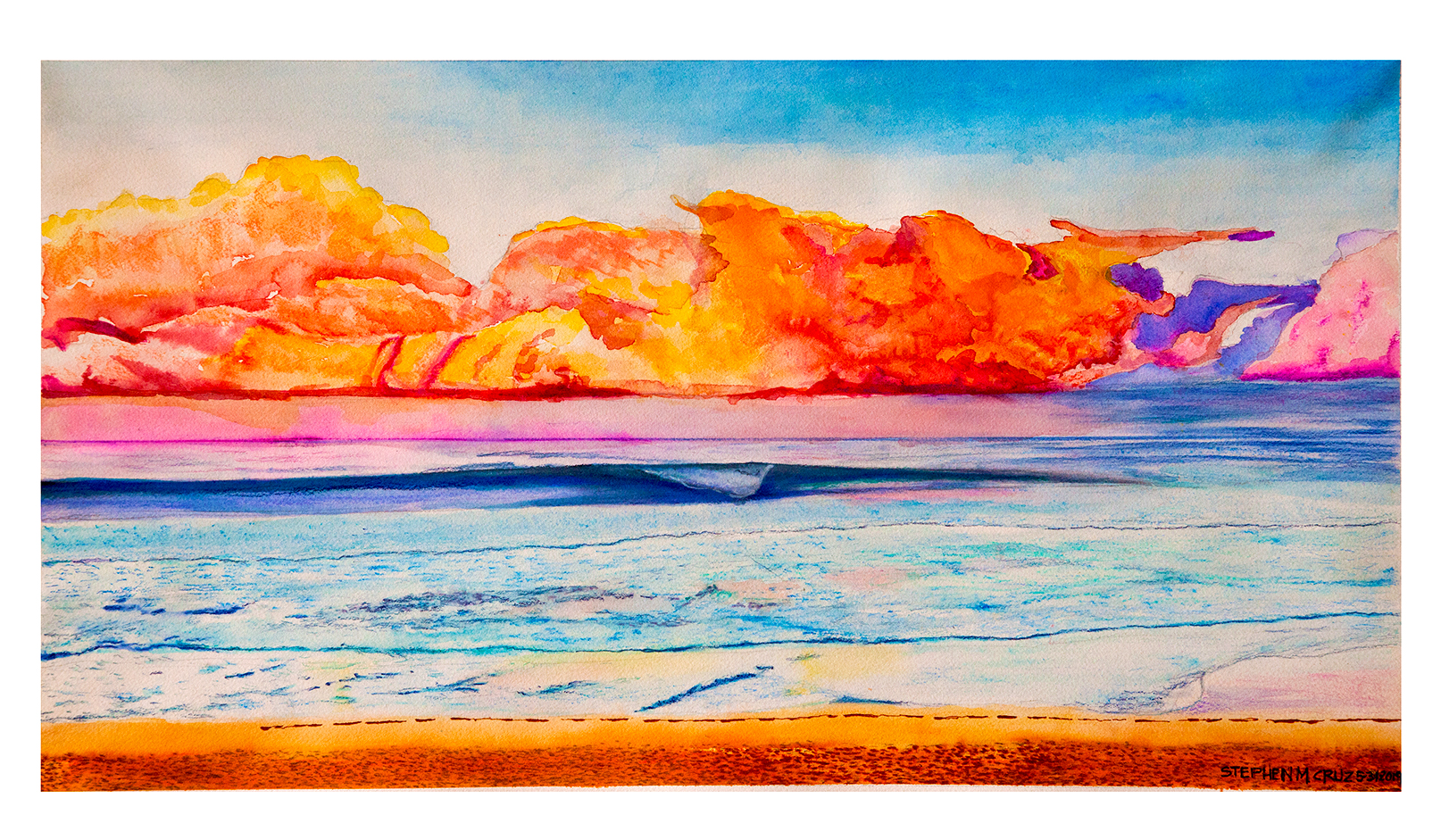 Cold-water waves hold their own singular allure, they are generally larger than their warm-water counterparts. Driven by Arctic storms, long-period swells drive sets of waves thousands of miles south on both coasts of the continental U.S.. I conceived of Winter Wave as a graphic piece, a stark tableau of an Eastern Pacific slab somewhere in the central California coast. The saturated blue sky offsets the green surface of the breaking wave with the choppy water in the foreground. First light, like twilight, is a magical time, especially on the eastern seaboard when the Atlantic storms generate swells that bring undulating tubes uncharted territory for the adventurous and the fortunate surfer. With Dawn Patrol, I intended to depict the early-morning light in saturated hues of yellow, orange, red, purple and blue capturing diaphanous waves set ablaze by the dawn. Psychedelic Wave captures a rapturous moment when the fading light of the sun reflects and refracts off the clouds and moisture-laden atmosphere to provide one of nature’s most vivid and surreal light shows !