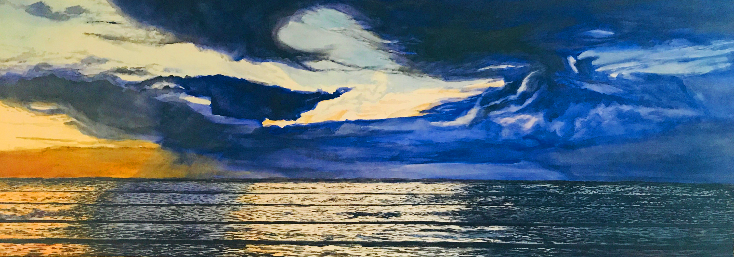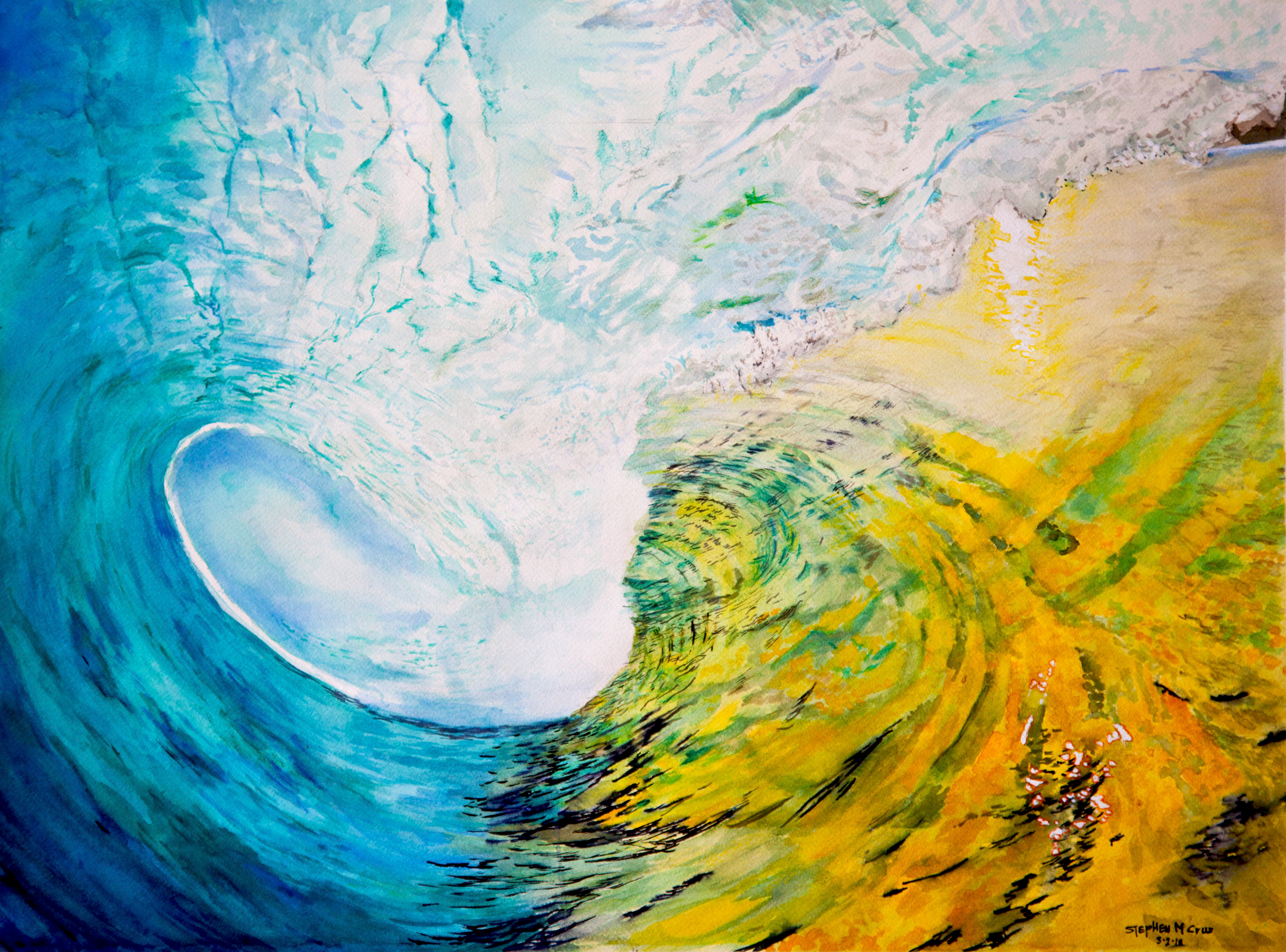 These moving sculptures of water move rapidly swelling up into a mountainous wall of water, their surface ebbing and flowing in the turbulence and throw themselves against rocks and sand , dying instantly releasing their energy in a sequence of fury ! Section by section waves play out this pattern, perfectly synched into the rhythms of our planetary weather systems , yet each a unique work of energy and beauty. Two of my paintings, Cyclops and Turbulence capture this drama played out in water, rock and sand. Cyclops offers us a glimpse into the maw of a breaking wave, a look straight into the beast’s eye, Turbulence captures an instantaneous image of a wave’s surface, plastic flowing graceful in its violence. Like the ocean itself the energy engendered in these paintings inspired the randomness and chaos of watercolors interacting on a watercolor stage, capturing the drama of the moment. Turbulence graphically describes the chaotic expenditure of potential energy manifested in a kinetic composition of colliding water .