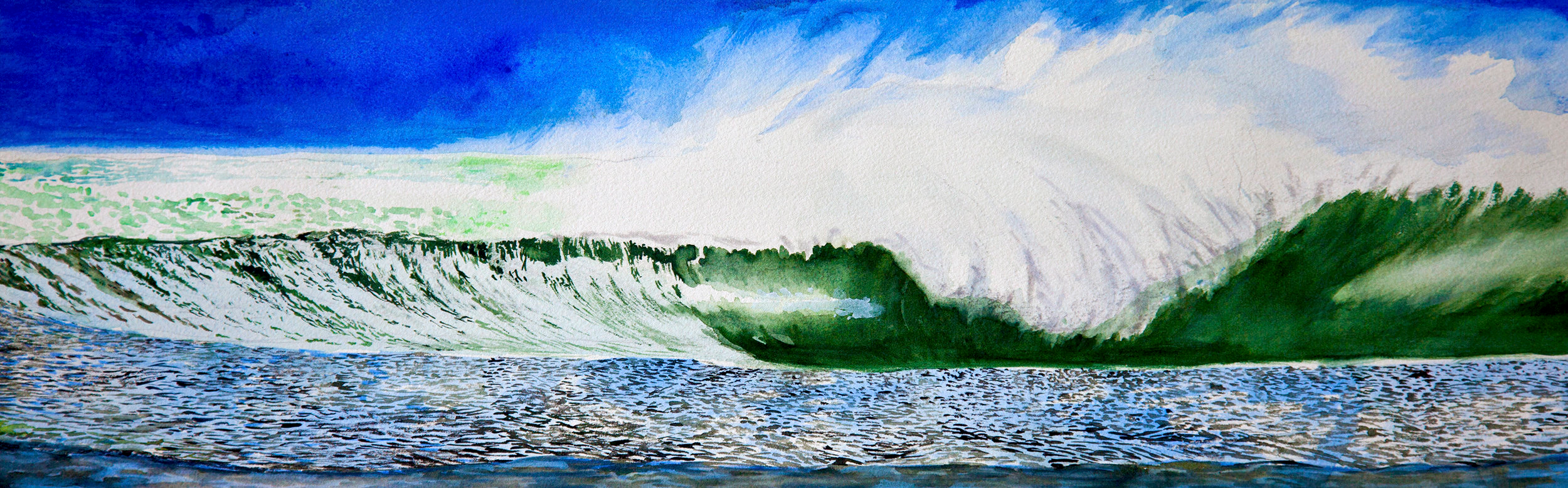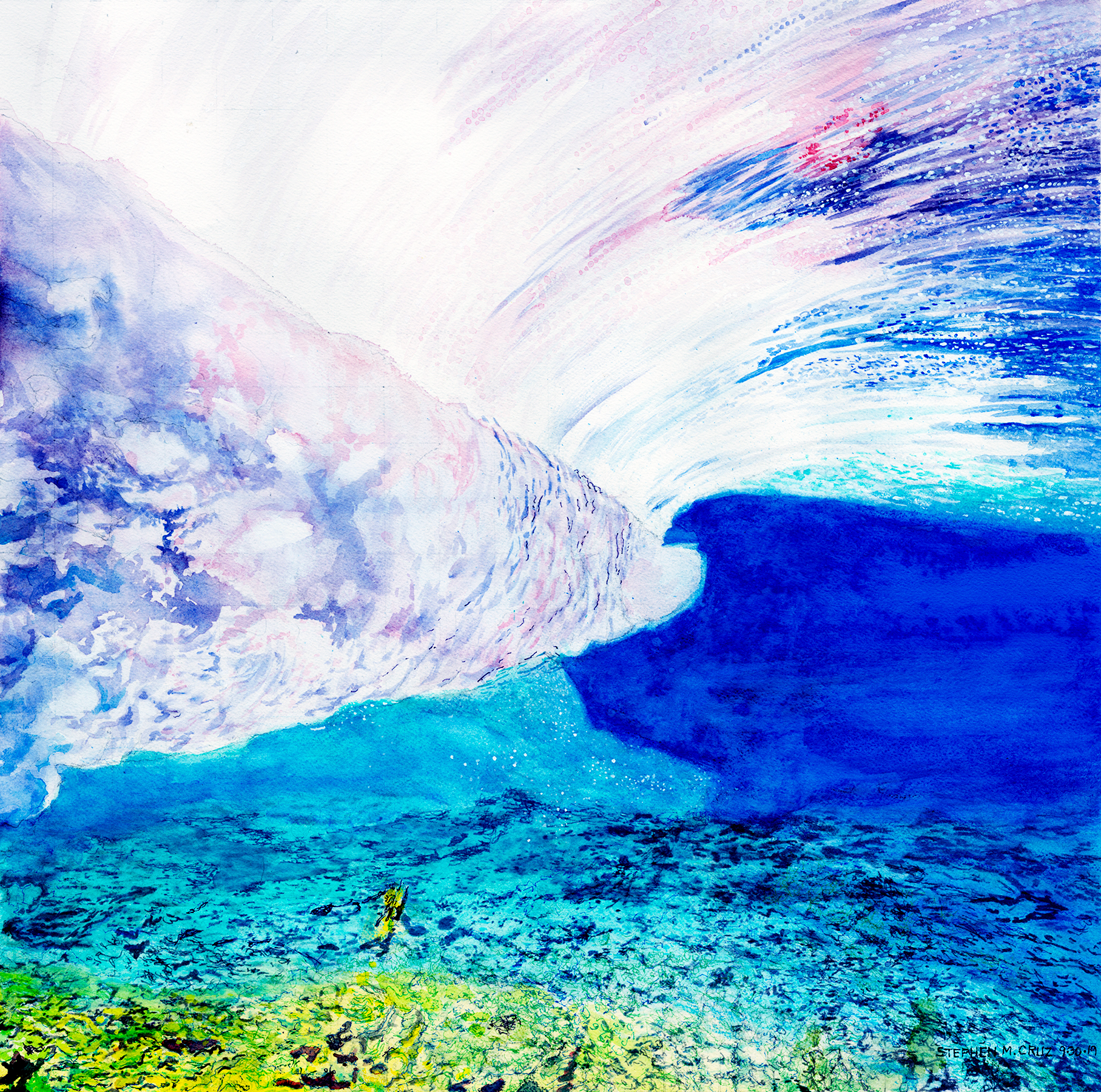 Being artifacts of nature, waves offer us many ways to witness their beauty and power. Some of these vistas afford us an intimate view of a wave in space and time. Vortex represents one of those moments inside the tube looking down the line of a cresting wave witnessing the menacing white cloud of spray. Where the lip of the wave crashes onto the surface of the water beyond in the upper right corner of the painting one can see the relative safety and calm of the shore. Tubular affords us a temporary glimpse from inside the hollow face of a wave towards the opening as the massive canopy of water prepares to collapse on itself. Walled-Up presents an approaching wave as a mountainous wall of water, from the p.o.v. of a surfer paddling desperately to make it over, or under , whatever it takes.