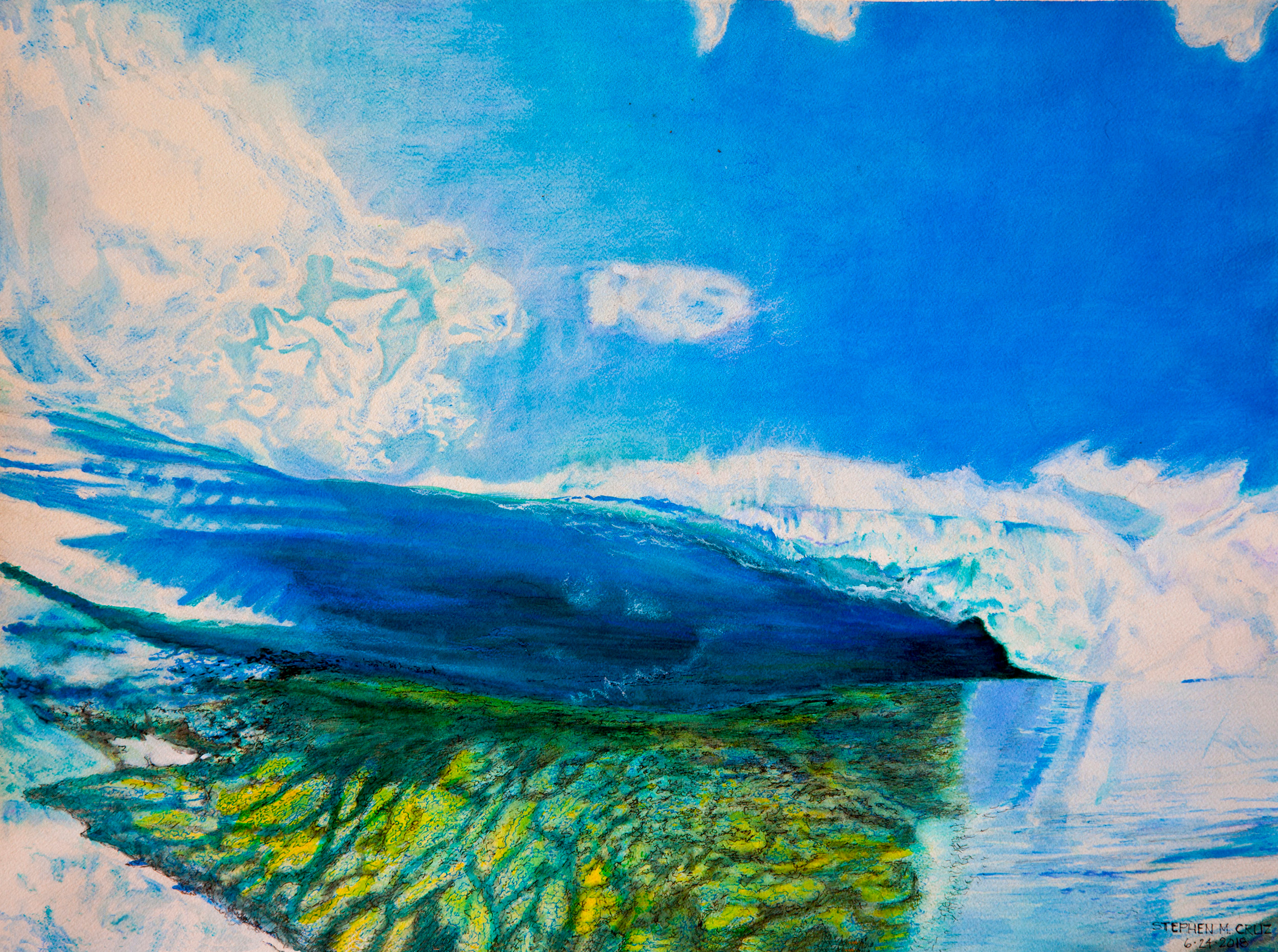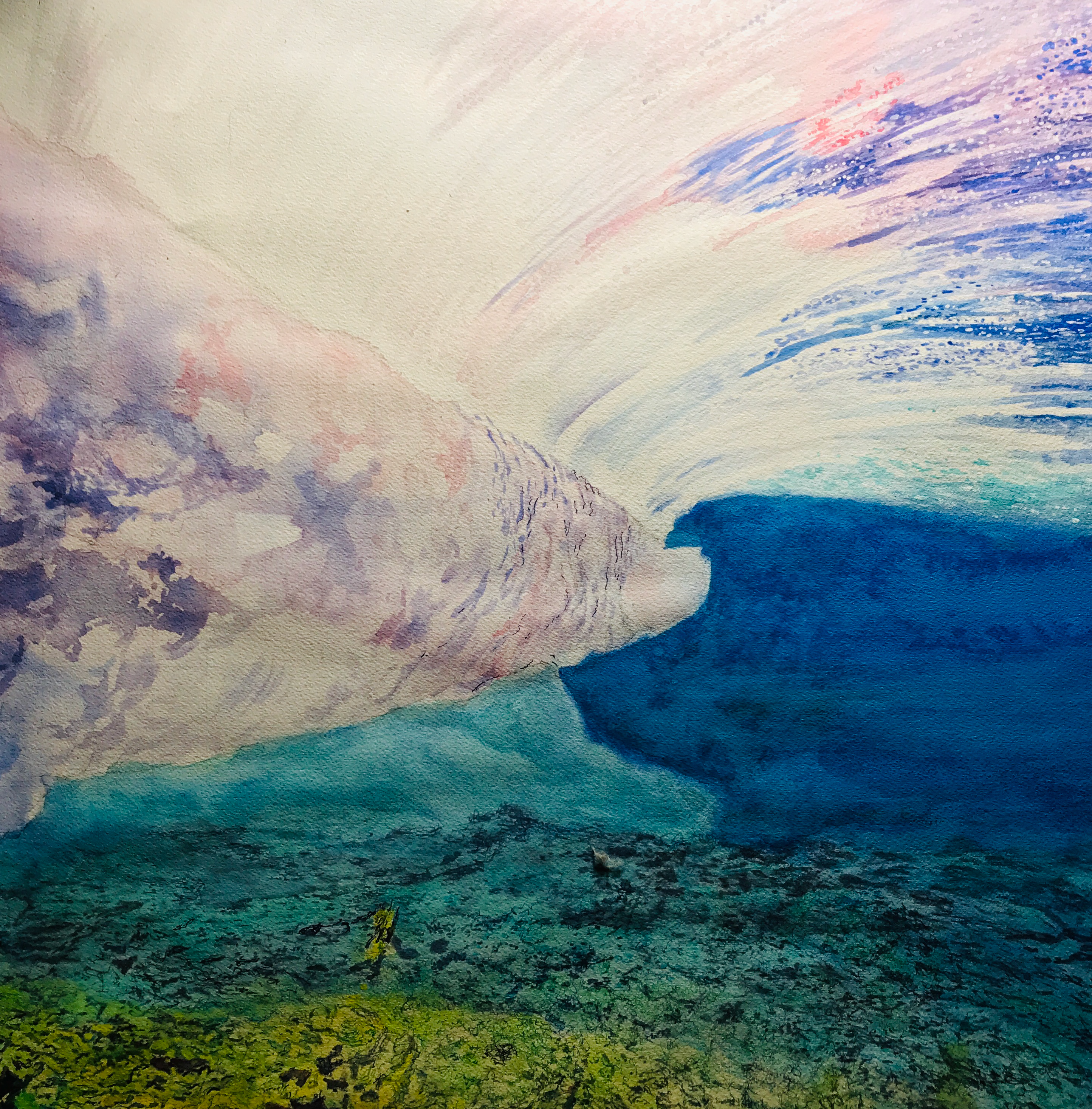 Reef breaks are a world unto themselves; not dry land but rather an intermediate world of coral and water that is its own eco-system. Teeming with life, these living gardens of limestone create some of the most perfect waves. Reef Break presents to us a vista over a coral reef into the heart of the sea. Ocean + Sky offers us a glimpse into two worlds. Where the deep ocean meets the edge of a coral reef is where water is hurled up into the sky, in an offering to the gods as well as the adventurous surfer. In this painting both the dynamic fury on the surface belies the calmness of the coral reef below, the expression Chi, the embodiment of the dynamic and serene, the Ying and Yang of a reef break. Over the Reef offers us an aerial perspective of wave breaking . The crystalline waters act like a lense, refracting light to create an optical illusion that distorts the clearly-seen features of the reef surface below.