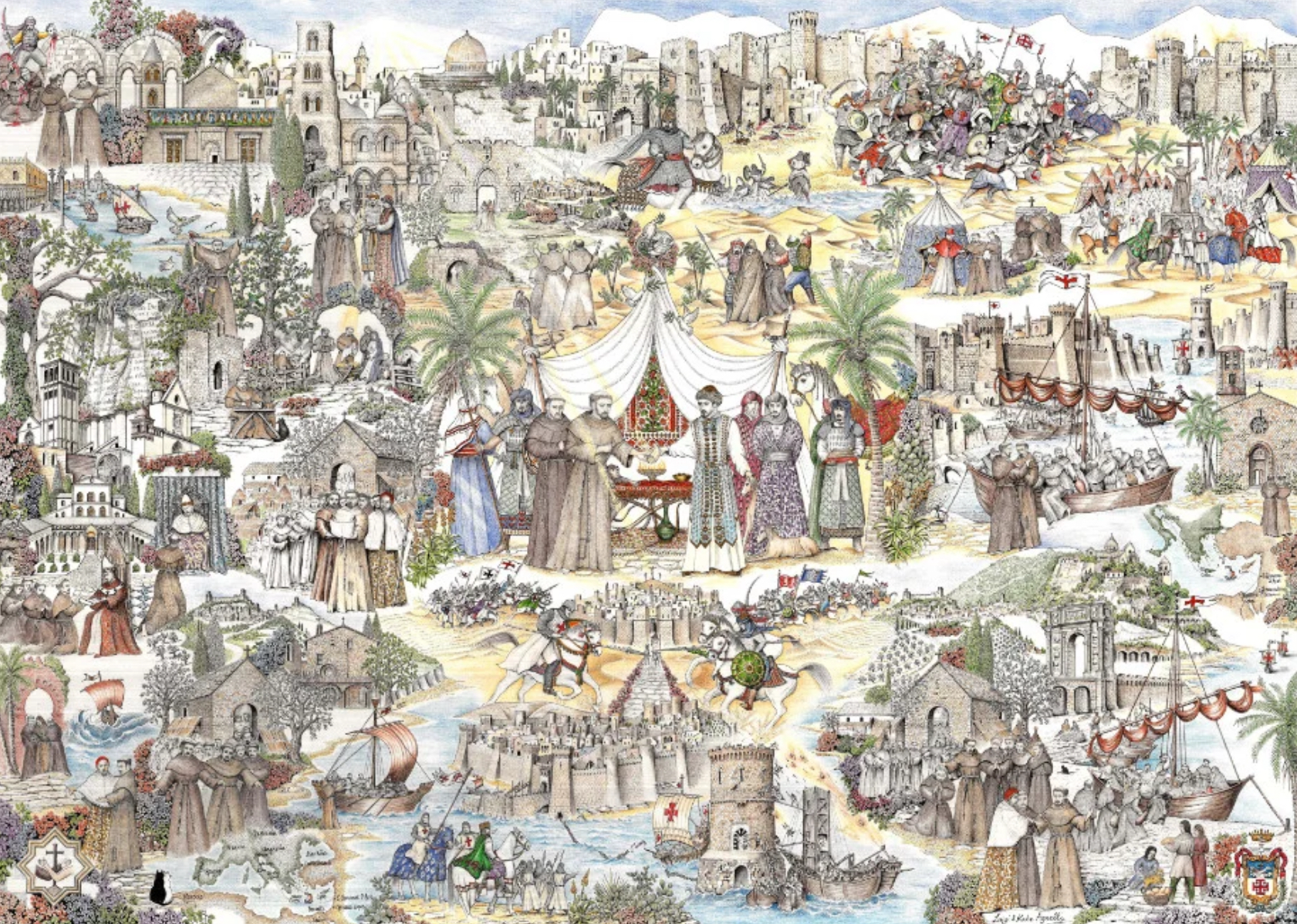 Mais aussi dans la nef, de merveilleux tableaux de deux artistes, Luigi et Kate Agnelli. Les dessins à l’encre sont ensuite coloriés aux crayons de couleur. Un travail de… bénédictins (si je puis dire) car les deux premières œuvres ci-dessous représentent la “ Vie de Saint François d’Assise “ et la dernière le “ Lac de Trasimeno et son château “. Nous avons eu la chance de discuter avec Kate et d’admirer de près ces créations, leur atelier jouxtant la basilique. À découvrir d’autres compositions en visitant leur site.