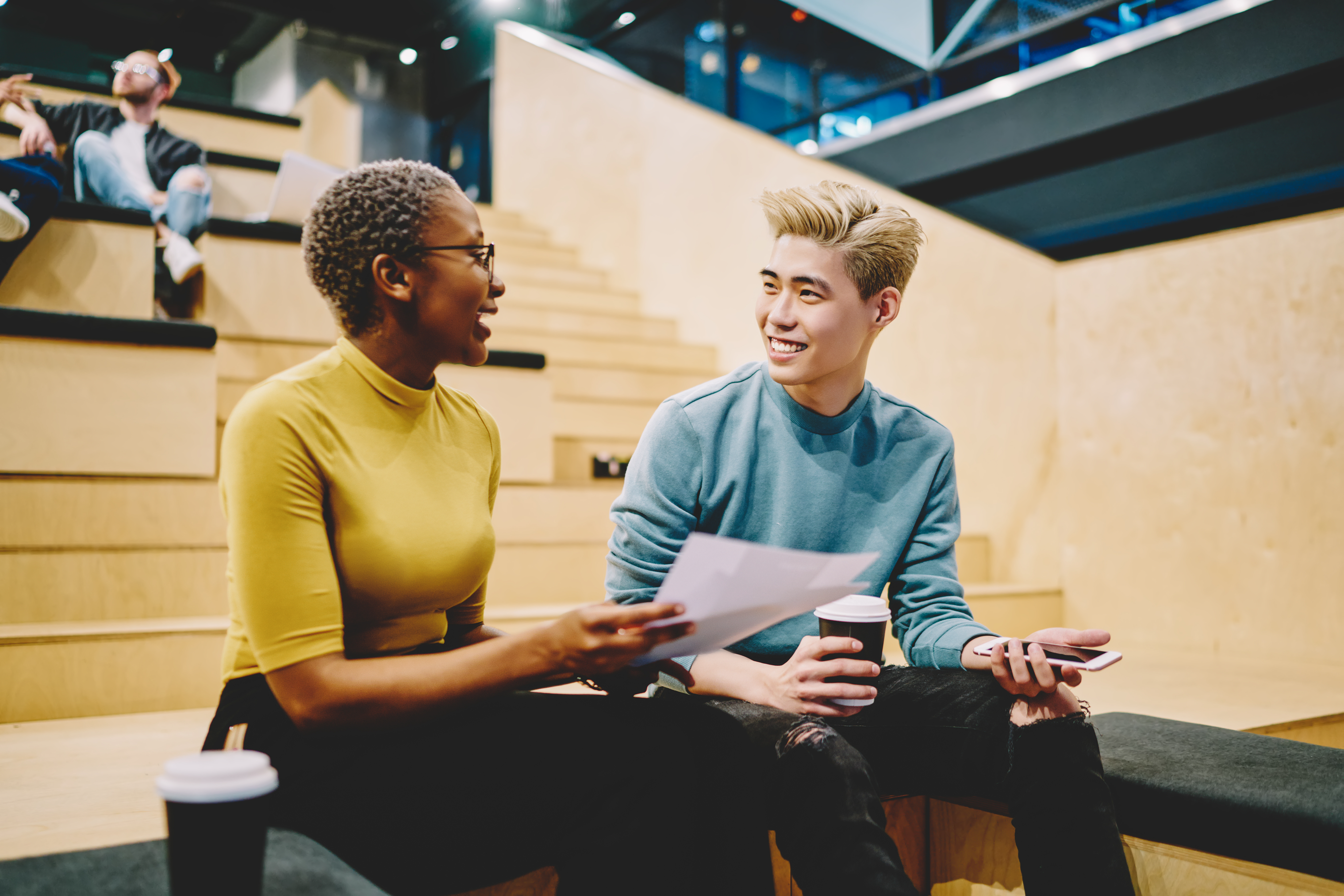 Created with an image by BullRun - "Smiling male and female multiracial colleagues discussing project learning together in college enjoying cooperation, cheerful dark skinned woman enjoying conversation with asian man friend on break"